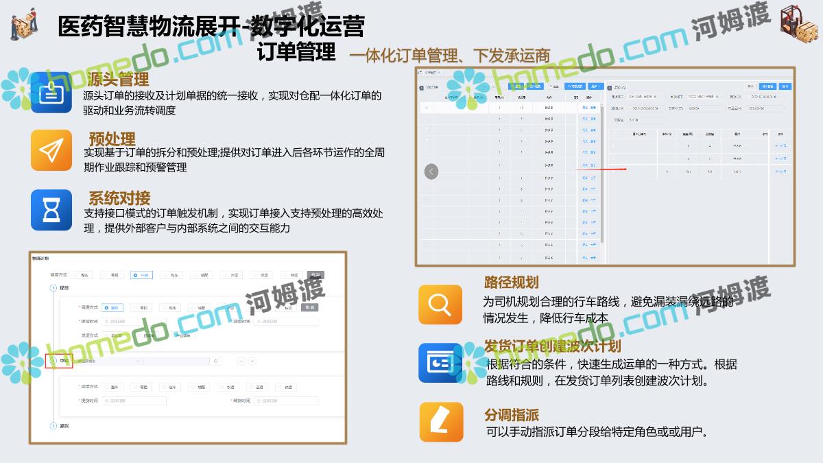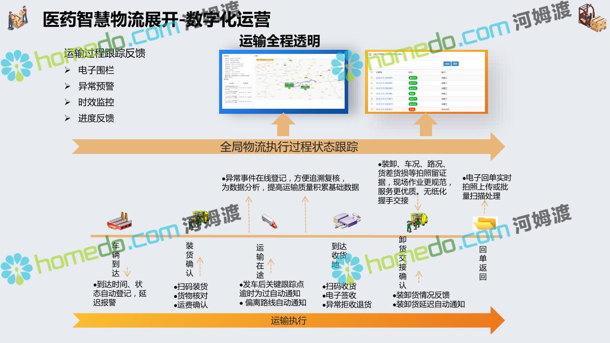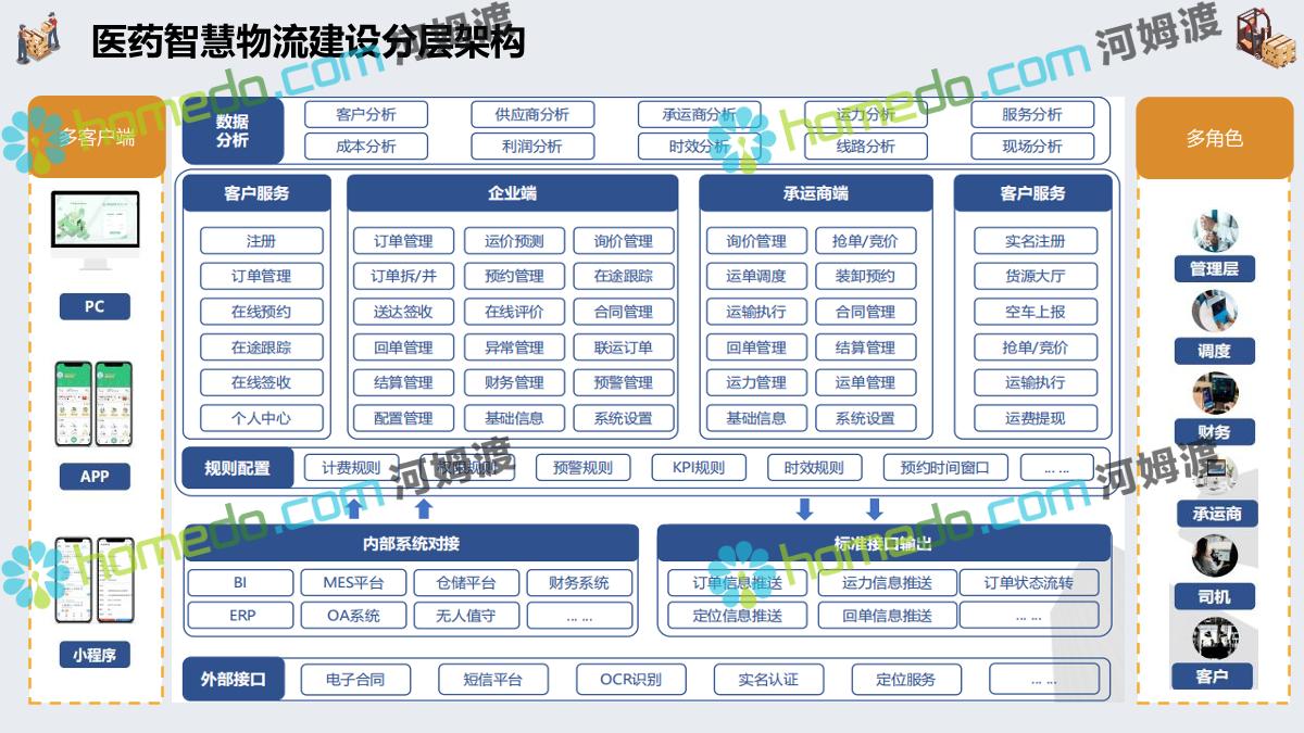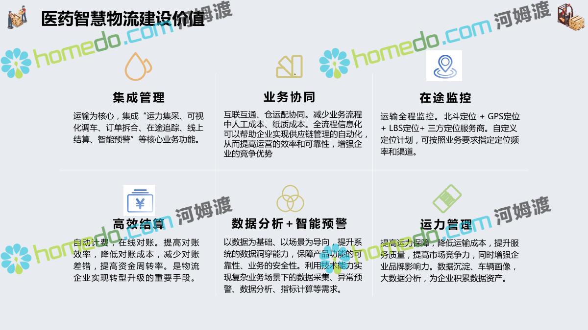 方案简介 集成管理:运输为核心,集成“运力集采、可视化调车、订单拆合、在途追踪、线上结算、智能预警”等核心业务功能。 业务协同:互联互通、仓运配协同。减少业务流程中人工成本、纸质成本。全流程信息化可以帮助企业实现供应链管理的自动化 在途监控:运输全程监控。北斗定位 + GPS定位 + LBS定位+ 三方定位服务商。自定义定位计划,可按照业务要求指定定位频率和渠道。 高效结算:自动计费,在线对账。提高对账效率,降低对账成本,减少对账差错,提高资金周转率。 数据分析+智能预警:以数据为基础、以场景为导向,提升系统的数据洞穿能力,保障产品功能的可靠性、业务的安全性。