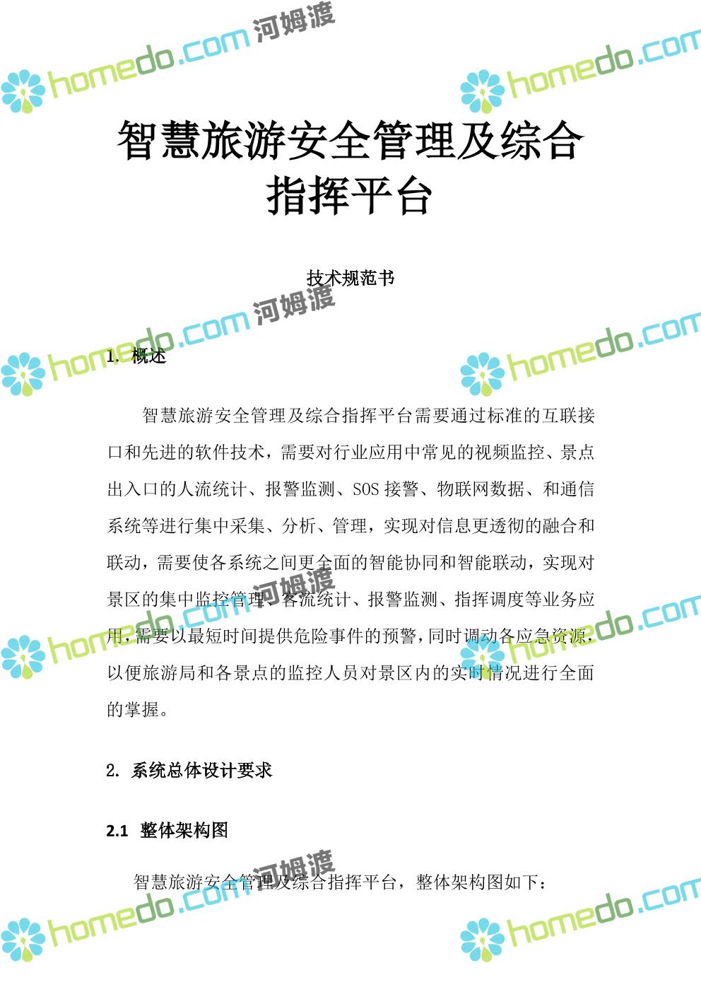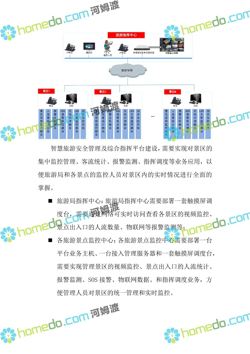 方案简介 智慧旅游安全管理及综合指挥平台需要通过标准的互联接口和先进的软件技术,需要对行业应用中常见的视频监控、景点出入口的人流统计、报警监测、SOS接警、物联网数据、和通信系统等进行集中采集、分析、管理,实现对信息更透彻的融合和联动,需要使各系统之间更全面的智能协同和智能联动,实现对景区的集中监控管理、客流统计、报警监测、指挥调度等业务应用,需要以最短时间提供危险事件的预警,同时调动各应急资源,以便旅游局和各景点的监控人员对景区内的实时情况进行全面的掌握。