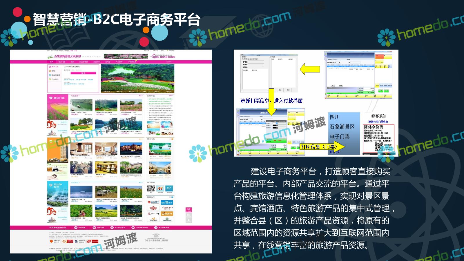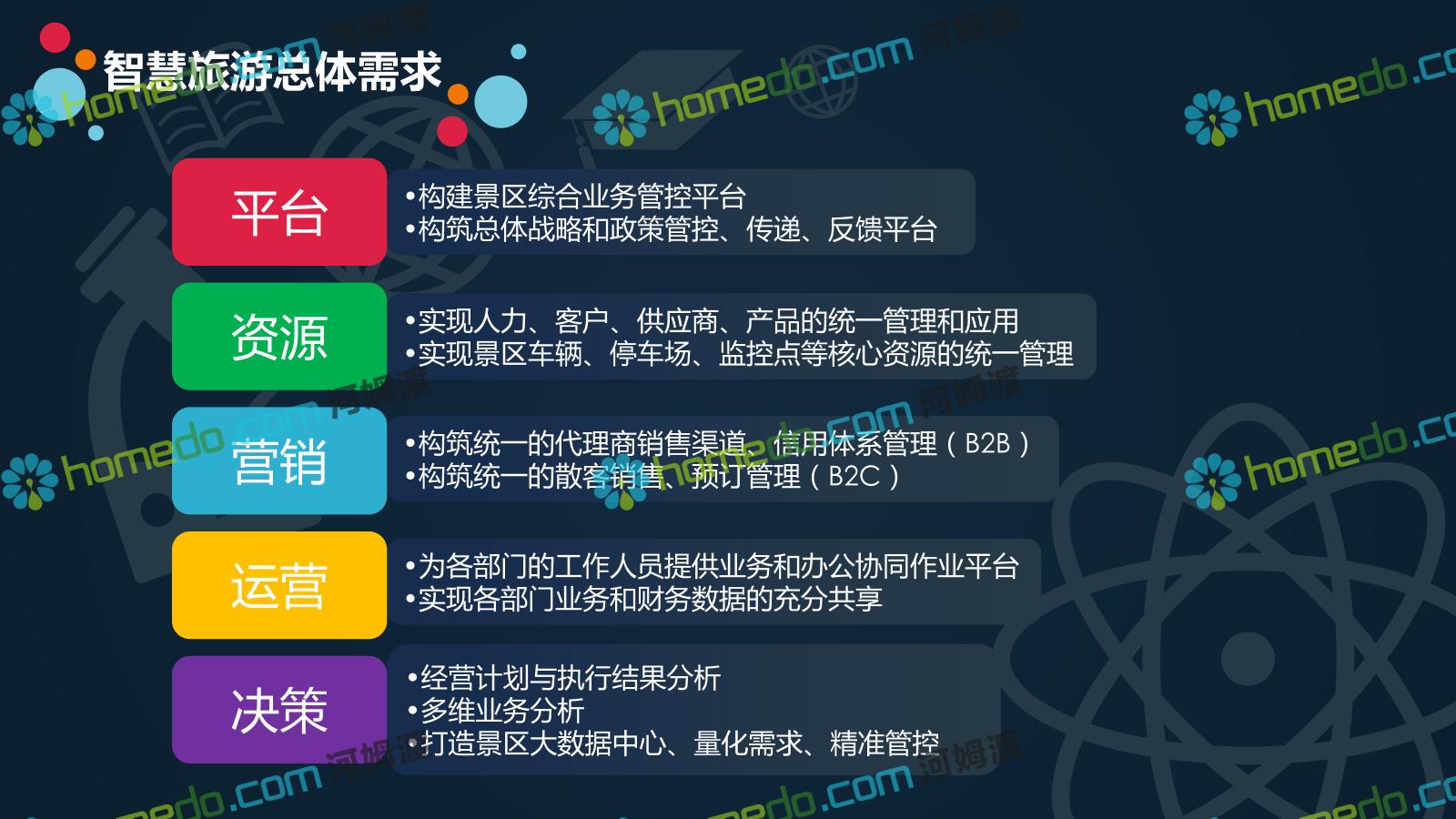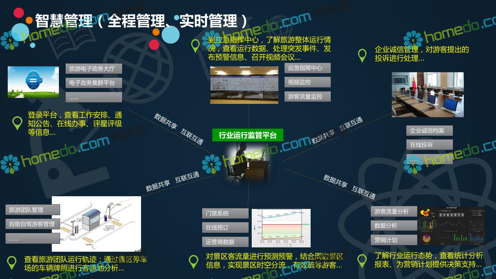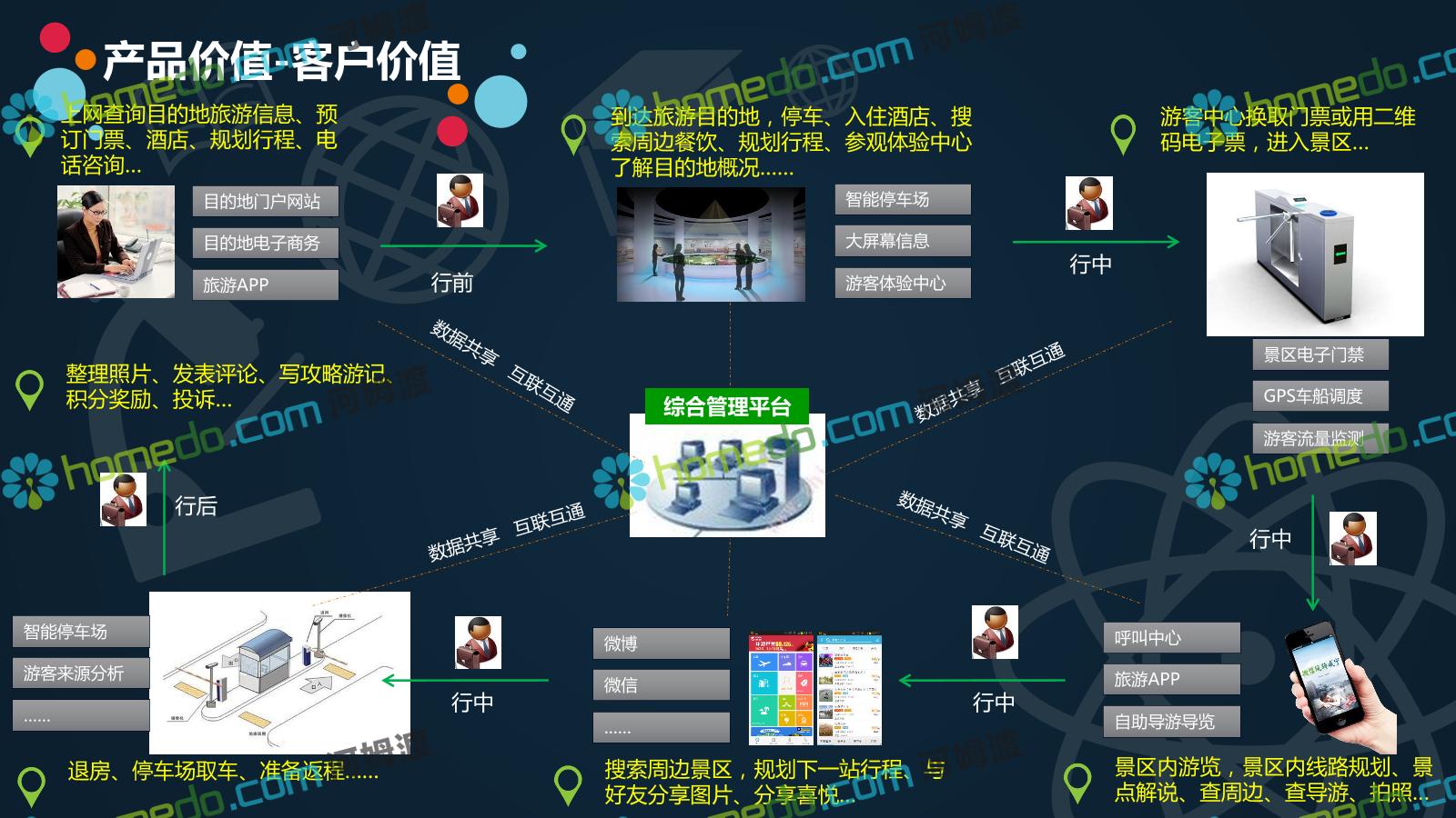 方案简介 平台 ·构建景区综合业务管控平台 •构筑总体战略和政策管控、传递、反馈平台资源 ·实现人力、客户、供应商、产品的统一管理和应用 ·实现景区车辆、停车场、监控点等核心资源的统一管理 营销 ·构筑统一的代理商销售渠道、信用体系管理(B2B) •构筑统一的散客销售、预订管理(B2C) 运营 ·为各部门的工作人员提供业务和办公协同作业平台 ·实现各部门业务和财务数据的充分共享 ·经营计划与执行结果分析 决策 ·多维业务分析 ·打造景区大数据中心、量化需求、精准管控