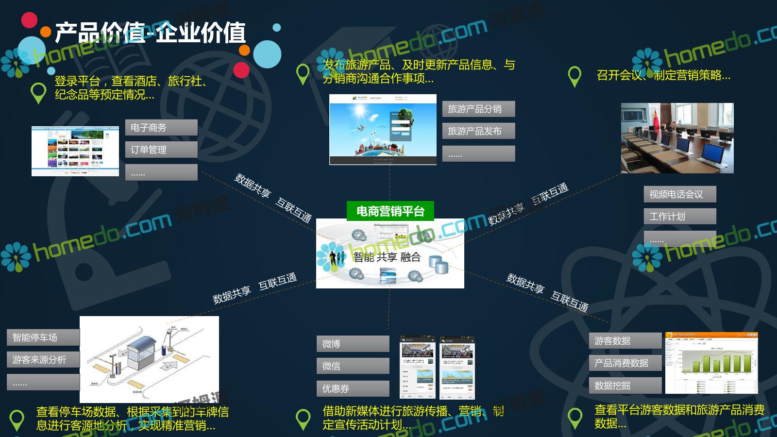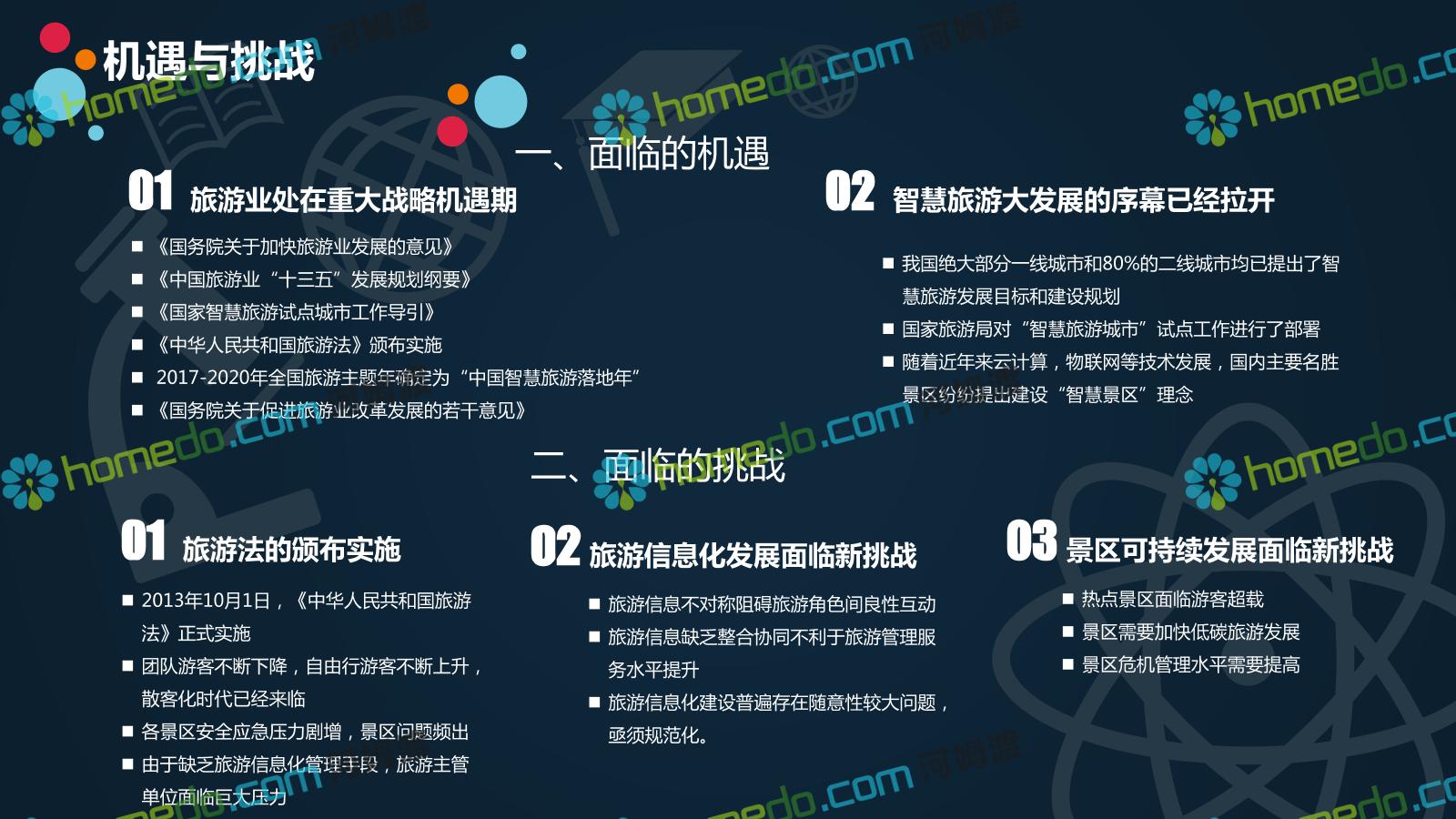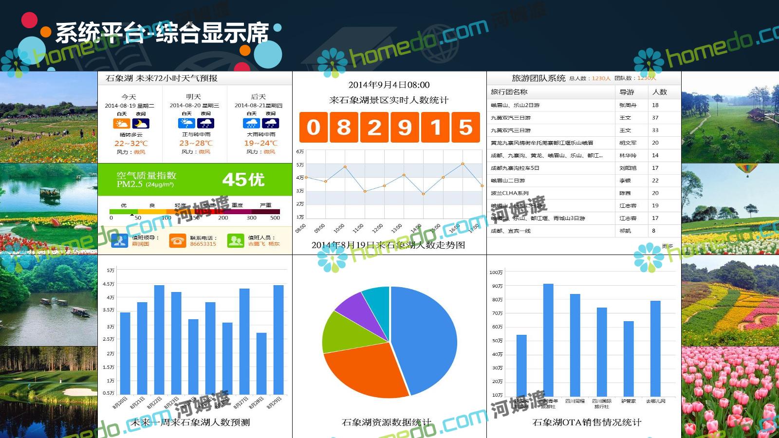 方案简介 平台 ·构建景区综合业务管控平台 •构筑总体战略和政策管控、传递、反馈平台资源 ·实现人力、客户、供应商、产品的统一管理和应用 ·实现景区车辆、停车场、监控点等核心资源的统一管理 营销 ·构筑统一的代理商销售渠道、信用体系管理(B2B) •构筑统一的散客销售、预订管理(B2C) 运营 ·为各部门的工作人员提供业务和办公协同作业平台 ·实现各部门业务和财务数据的充分共享 ·经营计划与执行结果分析 决策 ·多维业务分析 ·打造景区大数据中心、量化需求、精准管控