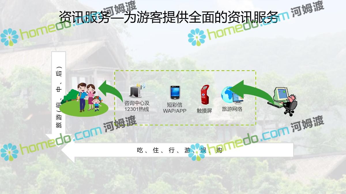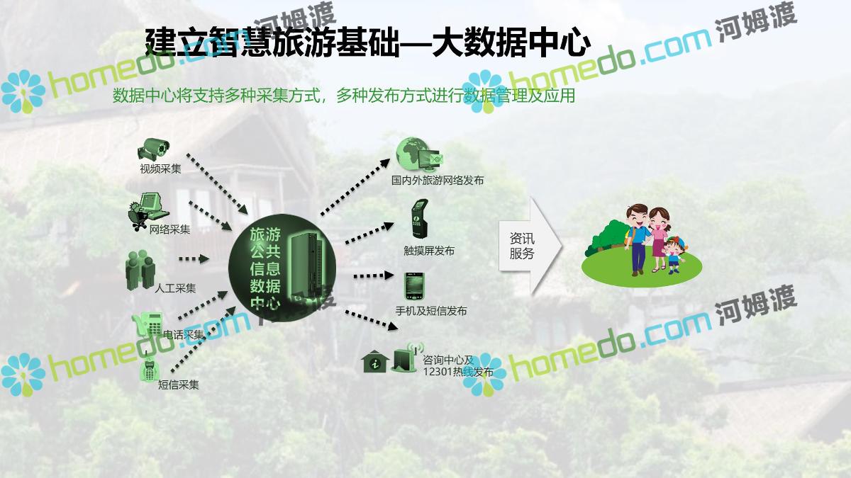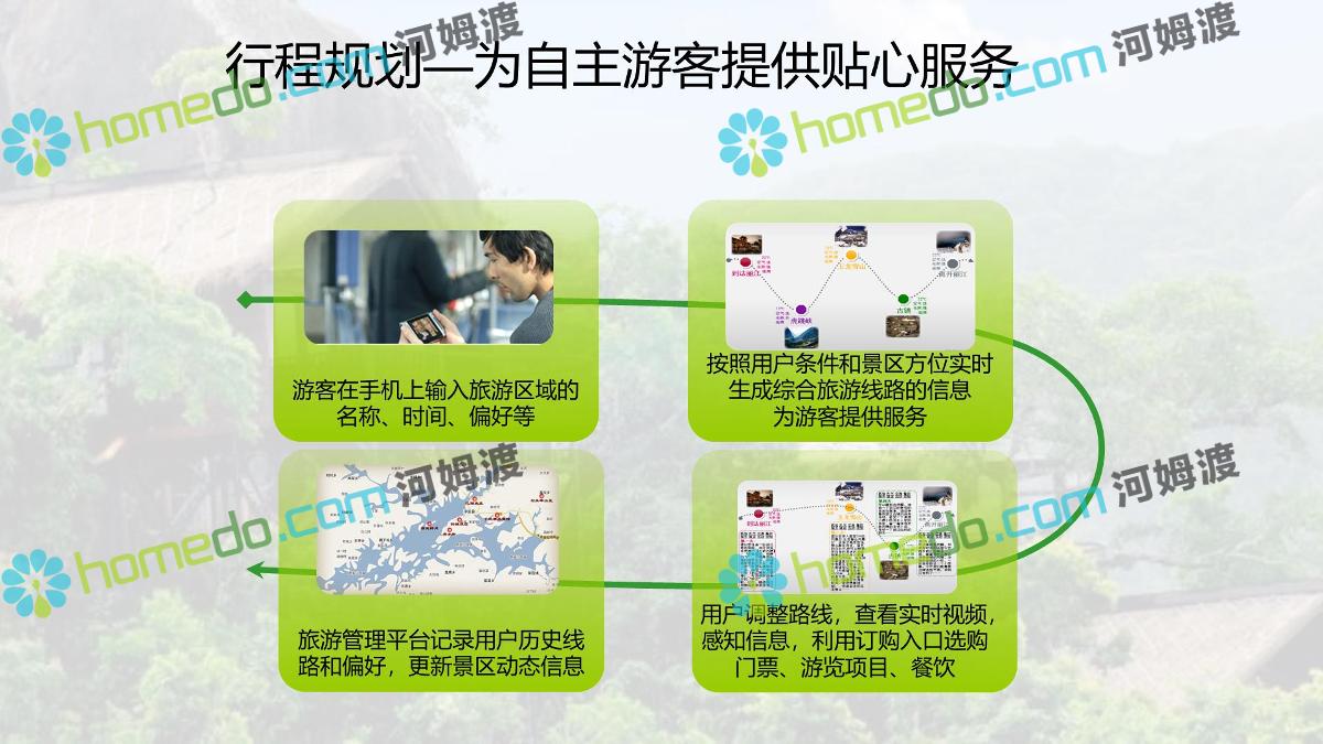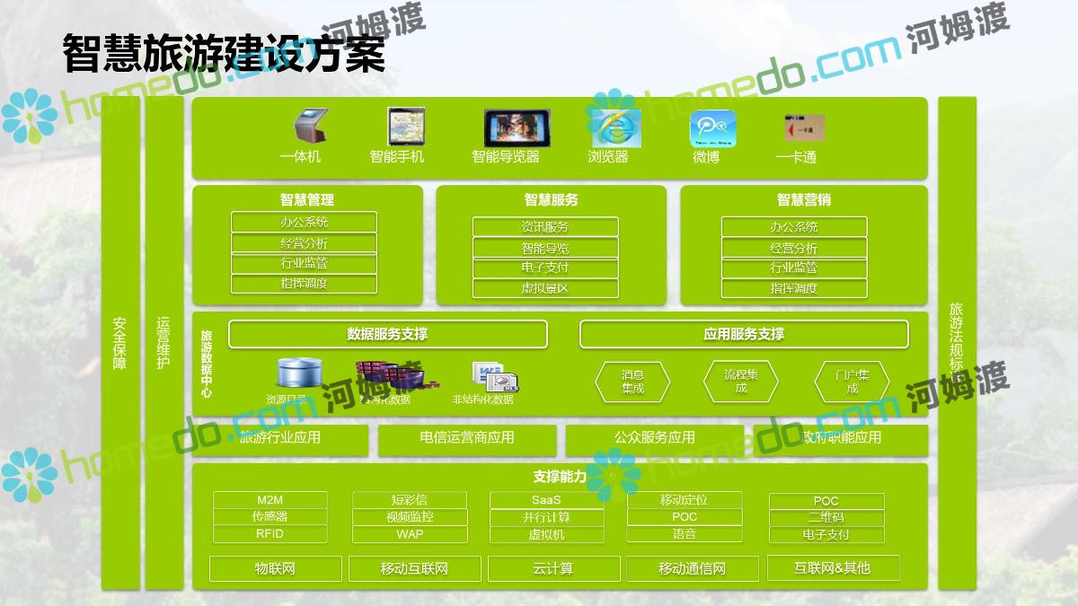 方案简介 智慧旅游”是一种以物联网、云计算、下一代通信网络、高性能信息处理、智能数据挖掘等技术在旅游体验、产业发展、行政管理等方面的应用,使旅游物理资源和信息资源得到高度系统化整合和深度开发激活,并服务于公众、企业、政府等的面向未来的全新的旅游形态。 它以融合的通信与信息技术为基础,以游客互动体验为中心,以一体化的行业信息管理为保障,以激励产业创新、促进产业结构升级为特色。
