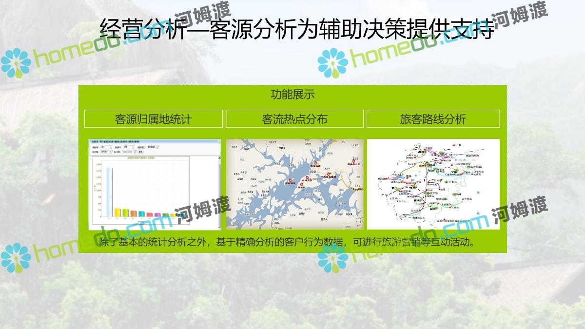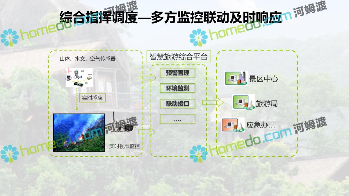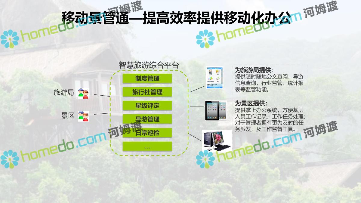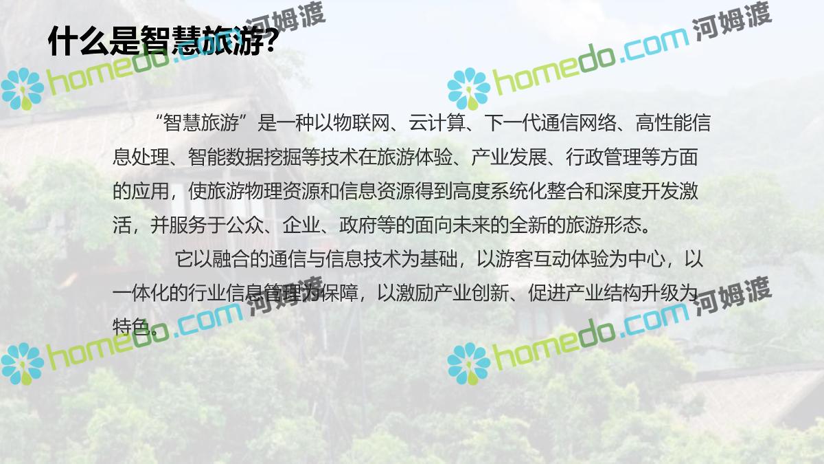 方案简介 智慧旅游”是一种以物联网、云计算、下一代通信网络、高性能信息处理、智能数据挖掘等技术在旅游体验、产业发展、行政管理等方面的应用,使旅游物理资源和信息资源得到高度系统化整合和深度开发激活,并服务于公众、企业、政府等的面向未来的全新的旅游形态。 它以融合的通信与信息技术为基础,以游客互动体验为中心,以一体化的行业信息管理为保障,以激励产业创新、促进产业结构升级为特色。