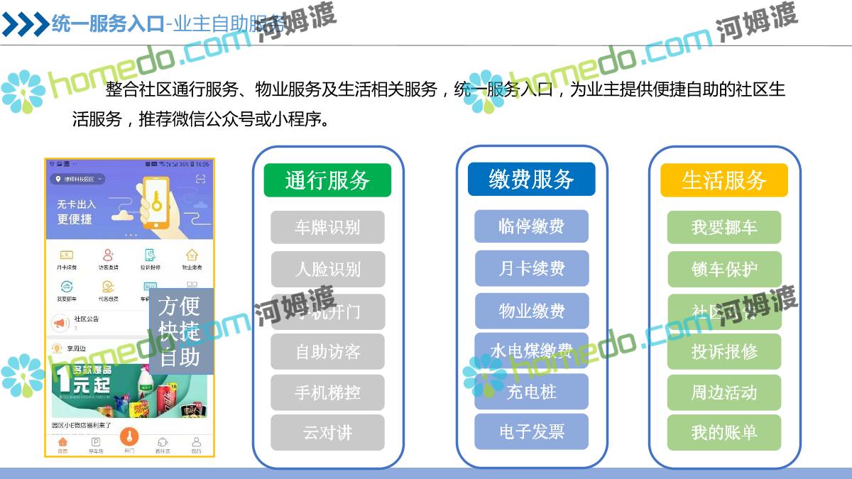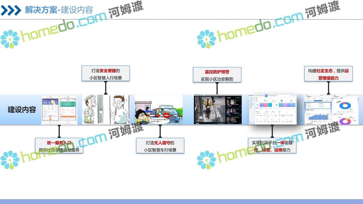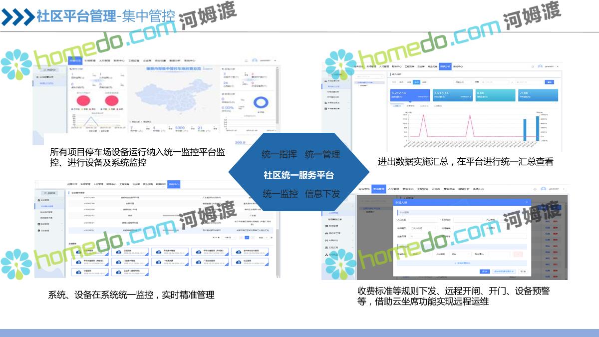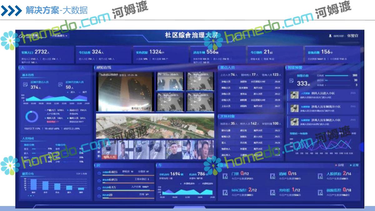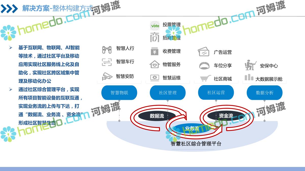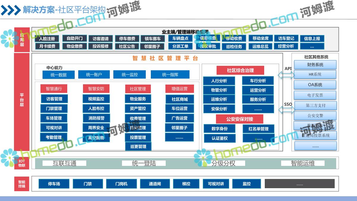 方案简介 基于互联网、物联网、AI智能等技术,通过社区平台及移动应用实现社区服务线上化及自助化,实现社区跨区域集中管理及移动化办公 通过社区综合管理平台,实现所有项目智能设备的互联互通,实现业务流的上传与下达,打通“数据流、业务流 、资金流”形成社区智慧生态
