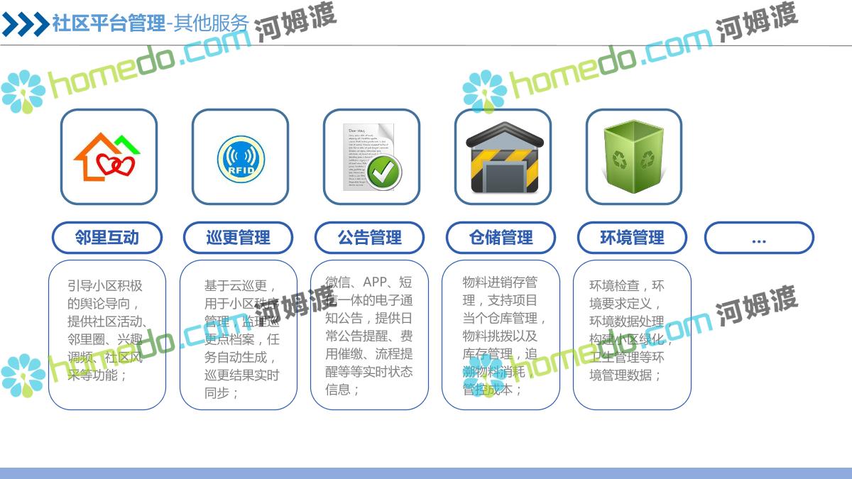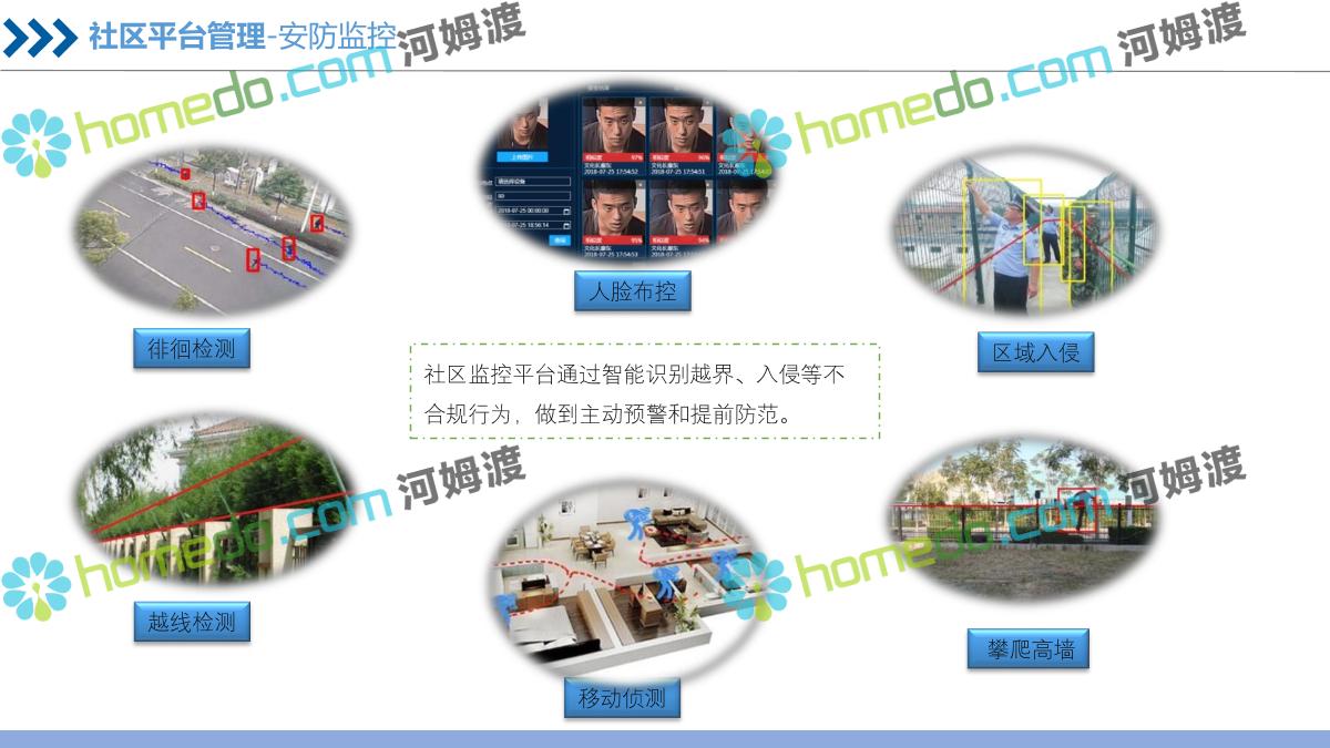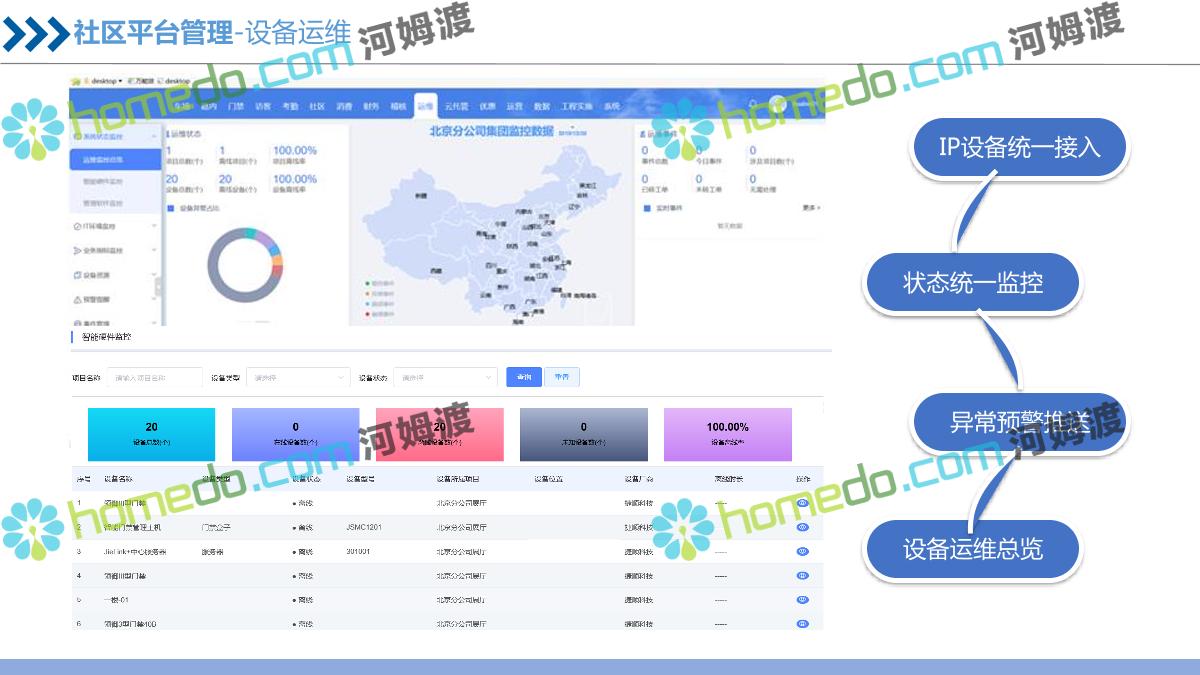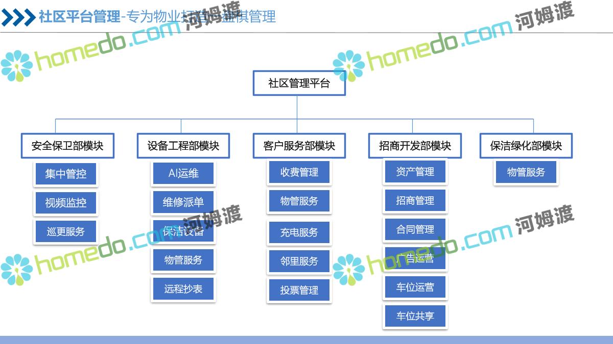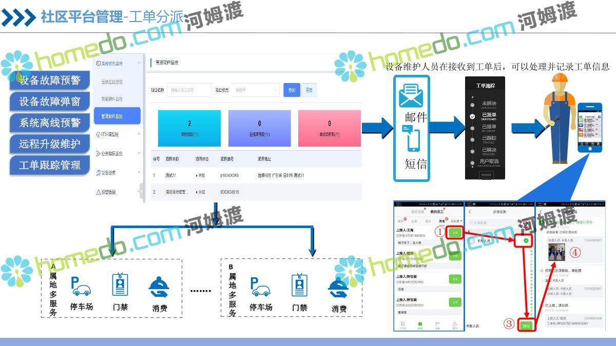 方案简介 基于互联网、物联网、AI智能等技术,通过社区平台及移动应用实现社区服务线上化及自助化,实现社区跨区域集中管理及移动化办公 通过社区综合管理平台,实现所有项目智能设备的互联互通,实现业务流的上传与下达,打通“数据流、业务流 、资金流”形成社区智慧生态