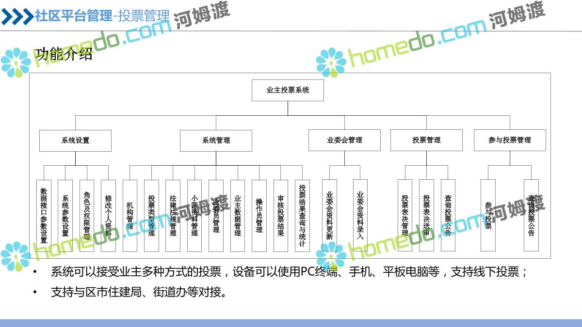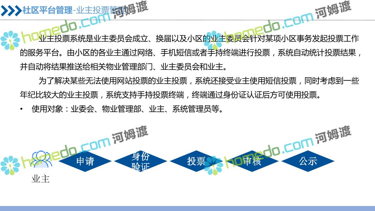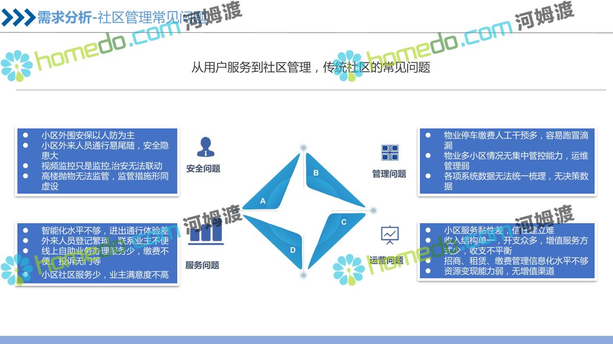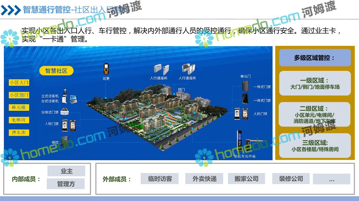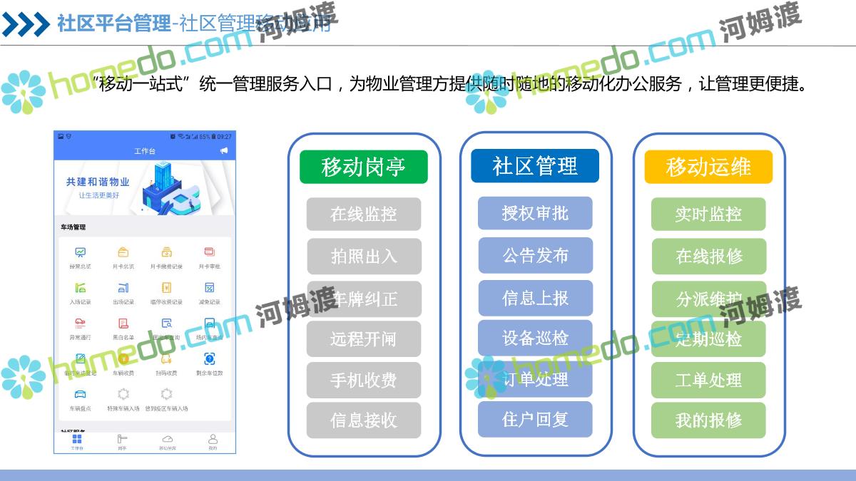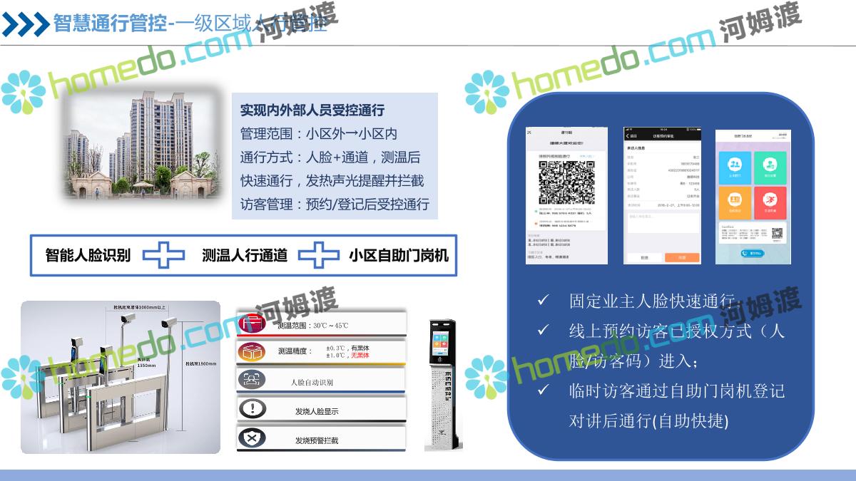 方案简介 基于互联网、物联网、AI智能等技术,通过社区平台及移动应用实现社区服务线上化及自助化,实现社区跨区域集中管理及移动化办公 通过社区综合管理平台,实现所有项目智能设备的互联互通,实现业务流的上传与下达,打通“数据流、业务流 、资金流”形成社区智慧生态