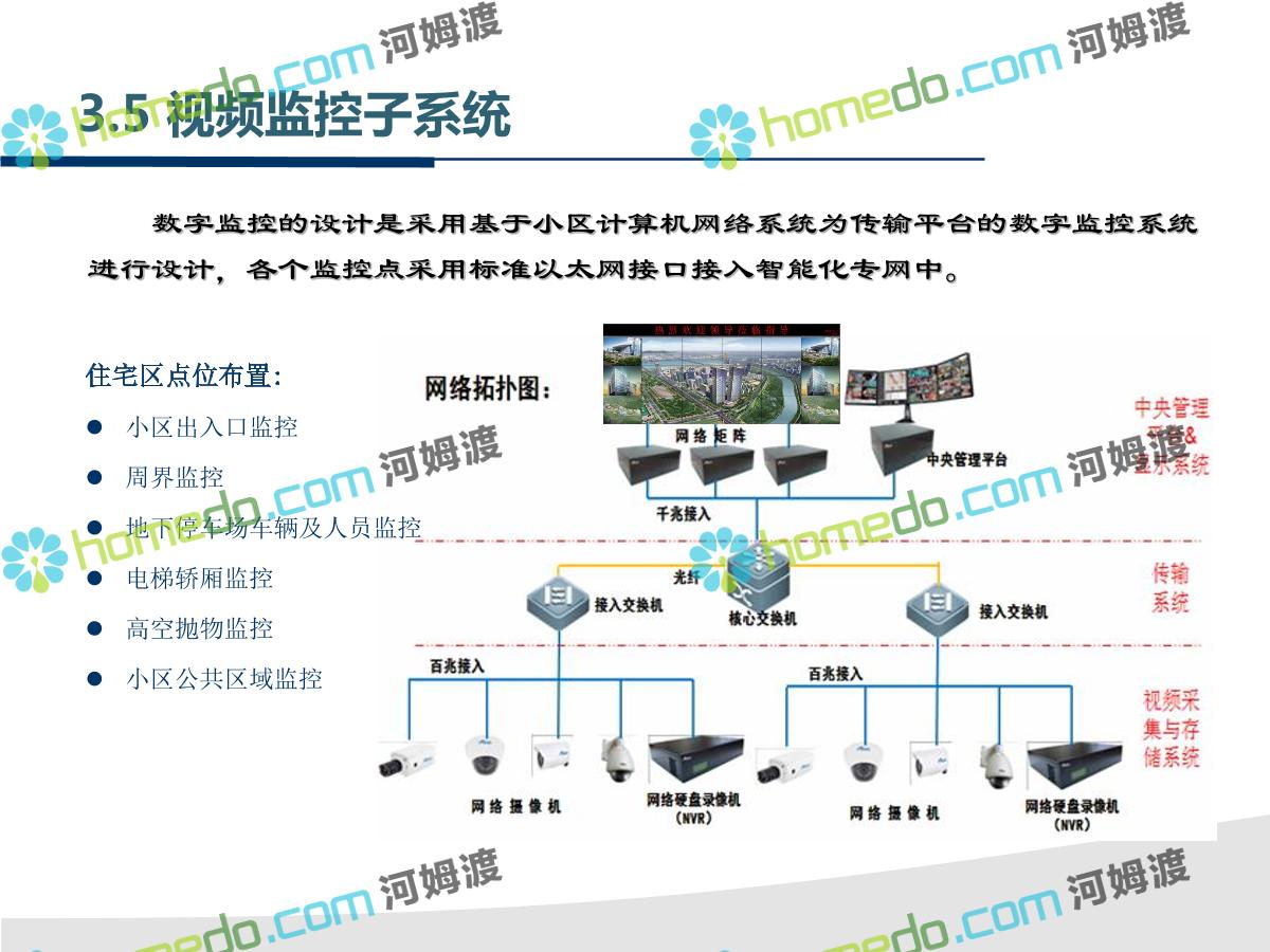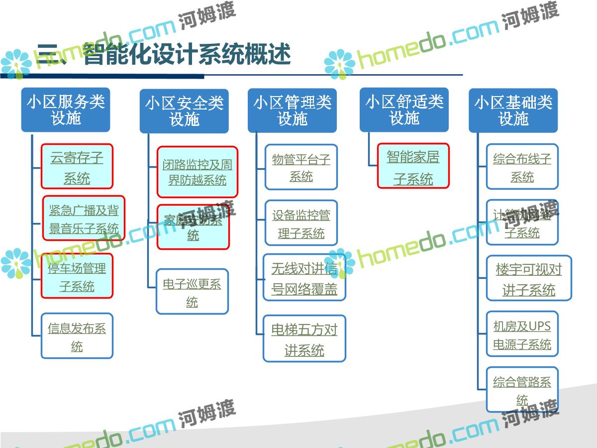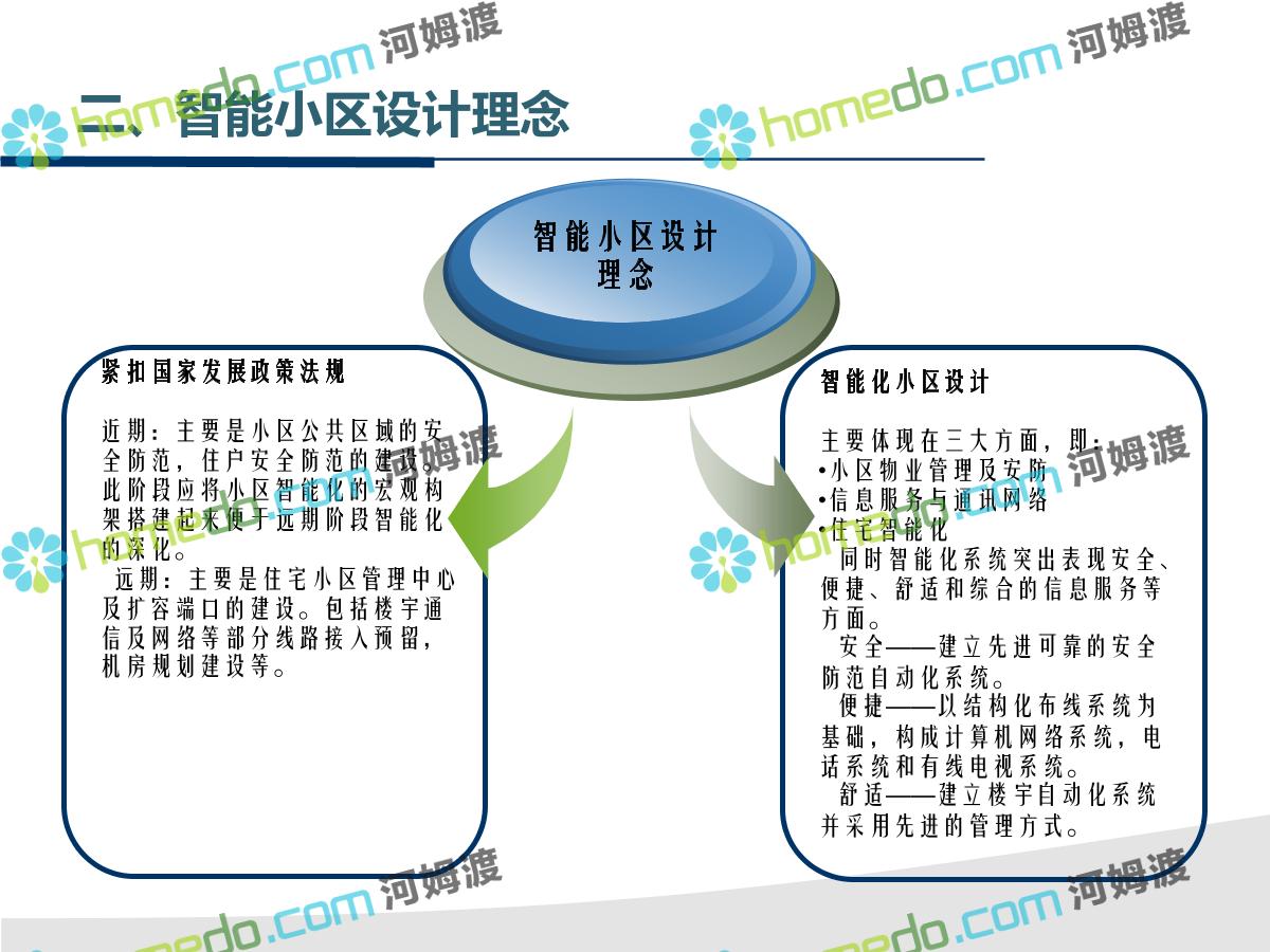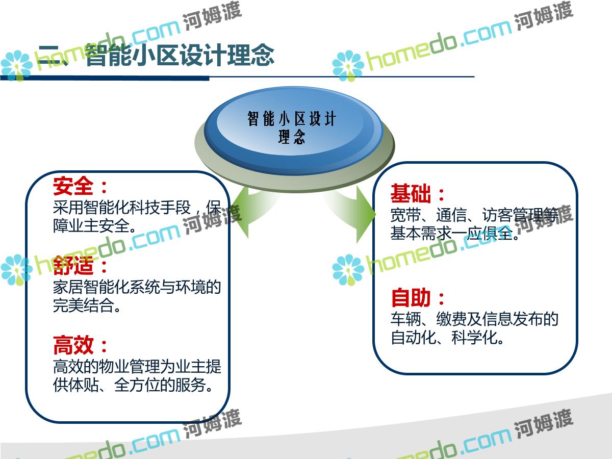 方案简介 智能化小区设计主要体现在三大方面,即: 小区物业管理及安防 信息服务与通讯网络 住宅智能化 同时智能化系统突出表现安全、便捷、舒适和综合的信息服务等方面。 安全——建立先进可靠的安全防范自动化系统。 便捷——以结构化布线系统为基础,构成计算机网络系统,电话系统和有线电视系统。 舒适——建立楼宇自动化系统并采用先进的管理方式。