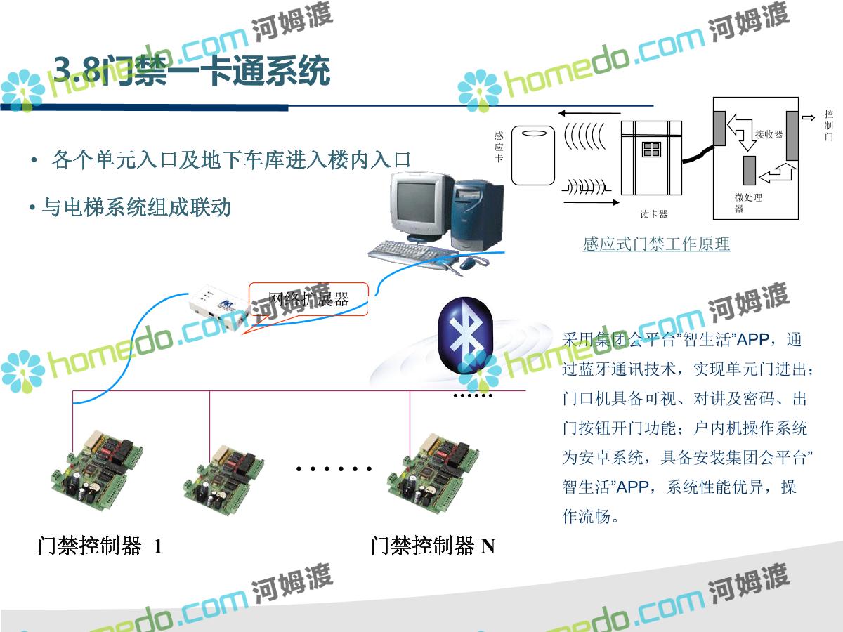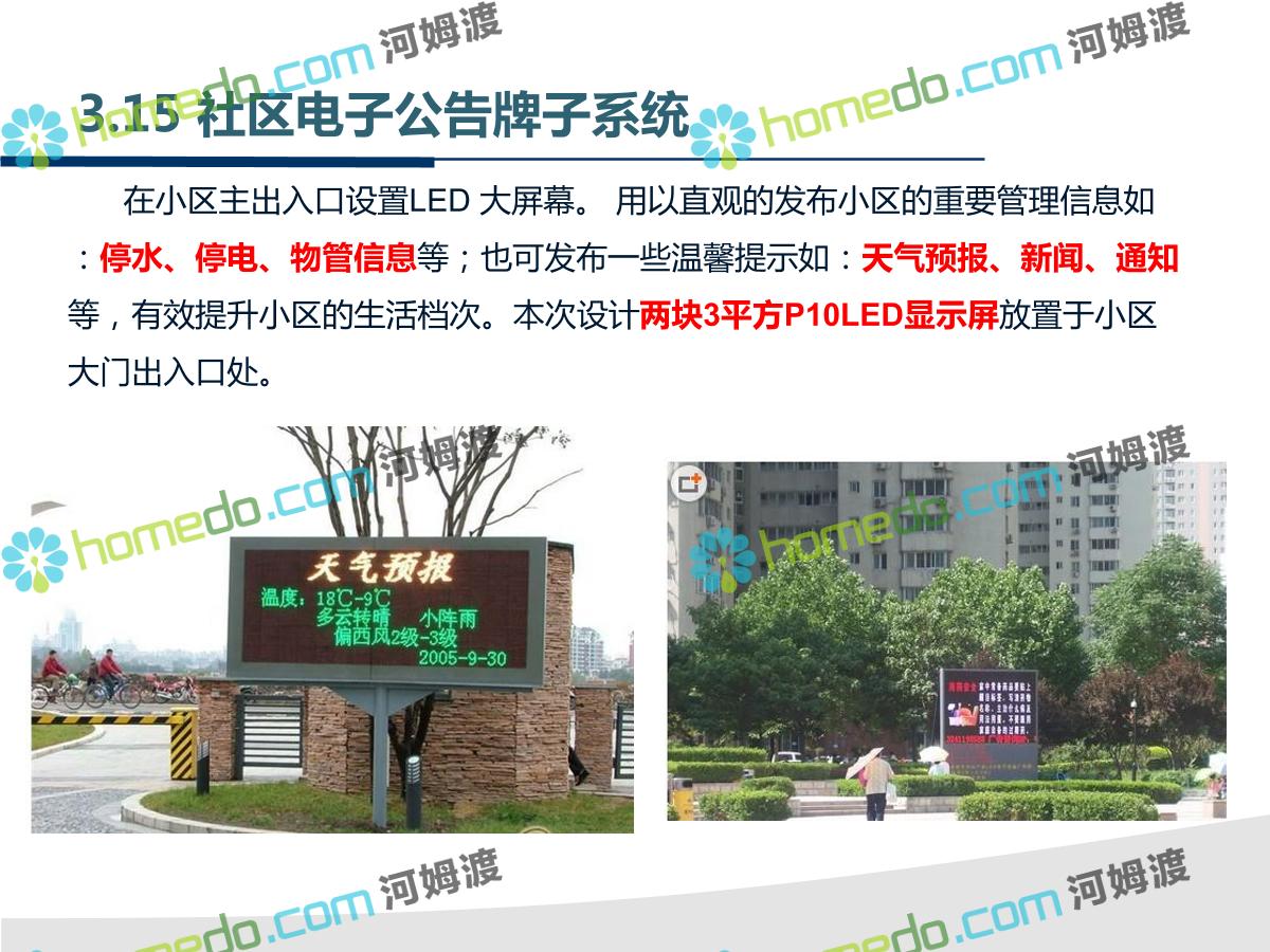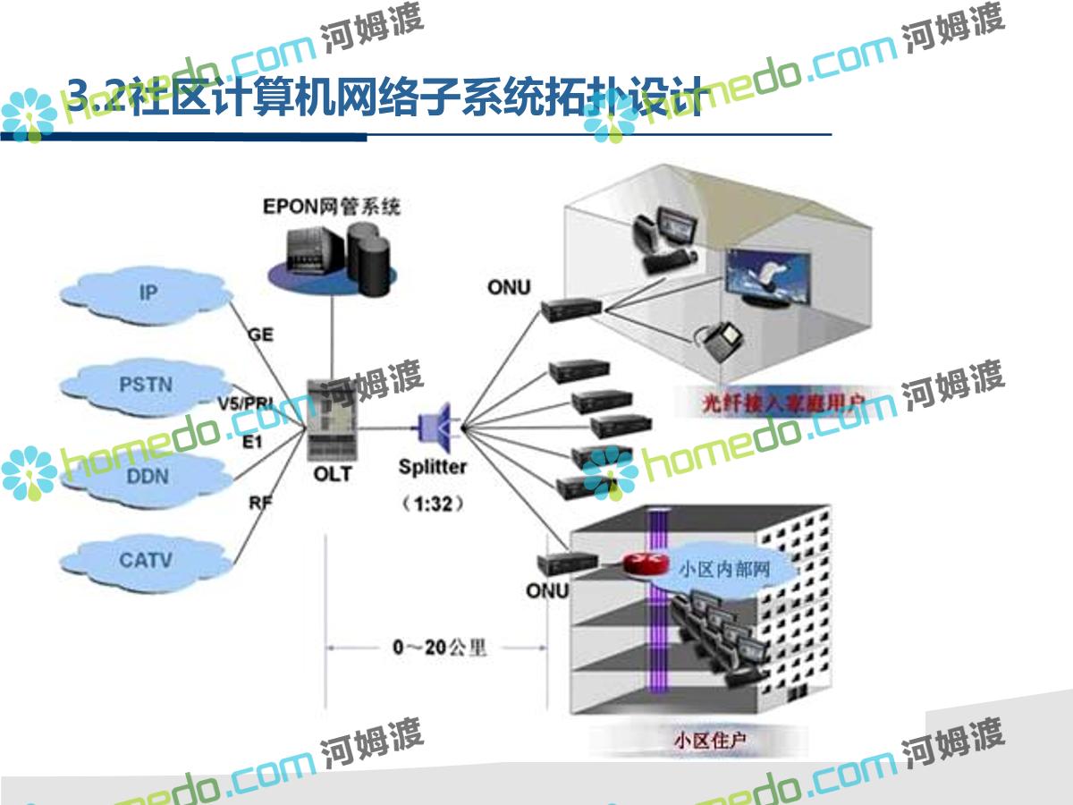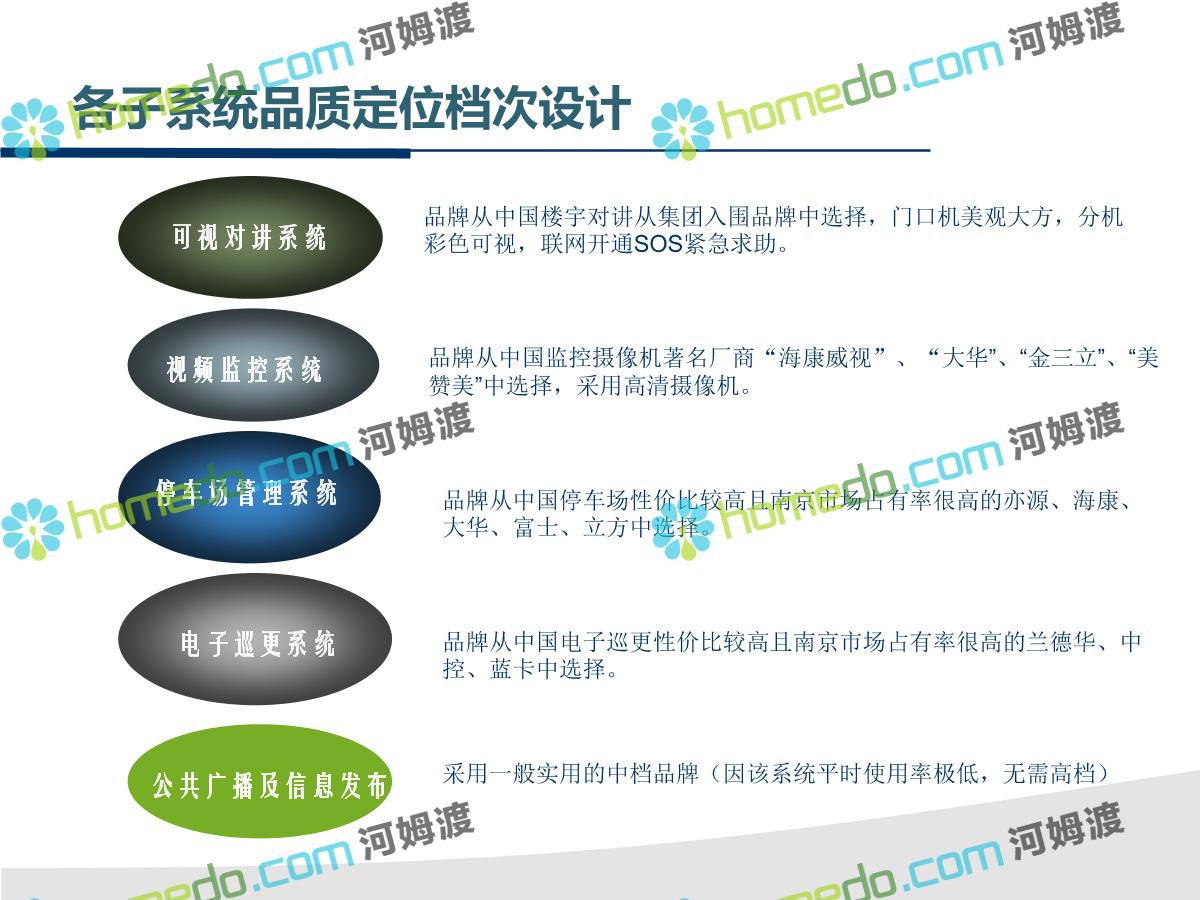 方案简介 智能化小区设计主要体现在三大方面,即: 小区物业管理及安防 信息服务与通讯网络 住宅智能化 同时智能化系统突出表现安全、便捷、舒适和综合的信息服务等方面。 安全——建立先进可靠的安全防范自动化系统。 便捷——以结构化布线系统为基础,构成计算机网络系统,电话系统和有线电视系统。 舒适——建立楼宇自动化系统并采用先进的管理方式。