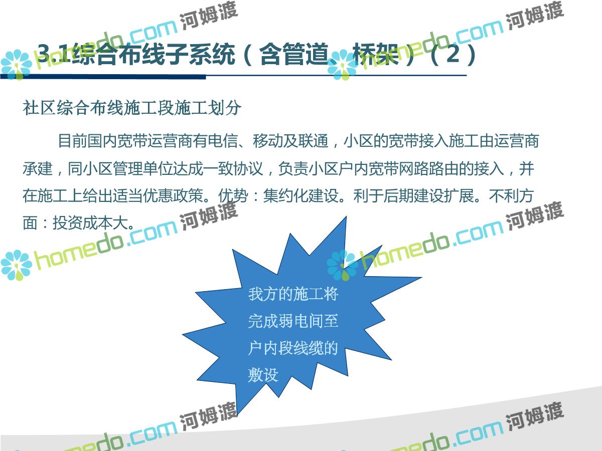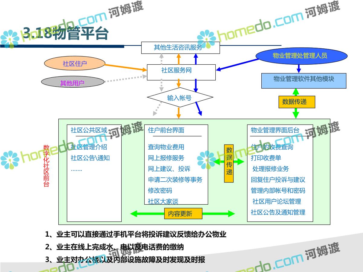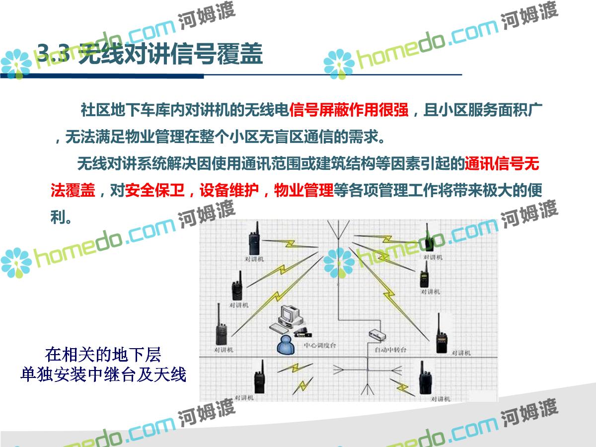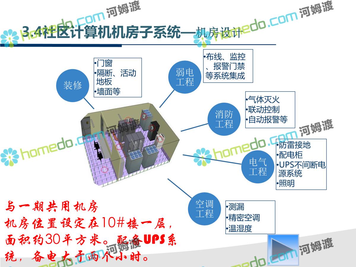 方案简介 智能化小区设计主要体现在三大方面,即: 小区物业管理及安防 信息服务与通讯网络 住宅智能化 同时智能化系统突出表现安全、便捷、舒适和综合的信息服务等方面。 安全——建立先进可靠的安全防范自动化系统。 便捷——以结构化布线系统为基础,构成计算机网络系统,电话系统和有线电视系统。 舒适——建立楼宇自动化系统并采用先进的管理方式。