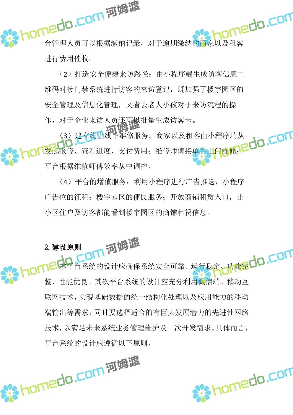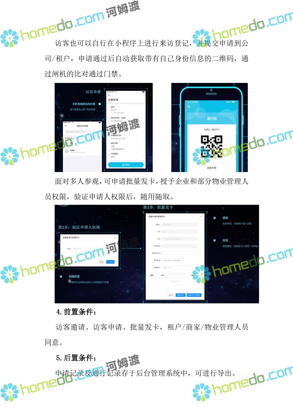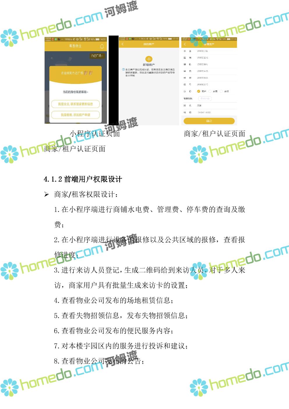 方案简介 (1)构建园区统一移动支付工具入口:商家以及租客对于楼宇园区内的水电费、管理费、停车费等费用缴纳能够通过统一的支付入口进行缴纳,抛弃了传统人工缴纳的不便。同时后台管理人员可以根据缴纳记录,对于逾期缴纳的商家以及租客进行费用催收。 (2)打造安全便捷来访路径:由小程序端生成访客信息二维码对接门禁系统进行访客的来访登记,既加强了楼宇园区的安全管理及信息化管理,又省去老人小孩对于来访流程的操作,对于企业来访人员还可以批量生成访客卡。 (3)建立线上线下维修服务:商家以及租客由小程序端从发起报修、查看进度、支付费用;维修师傅接单并上门维修;平台根据维修师傅效率从中调控。