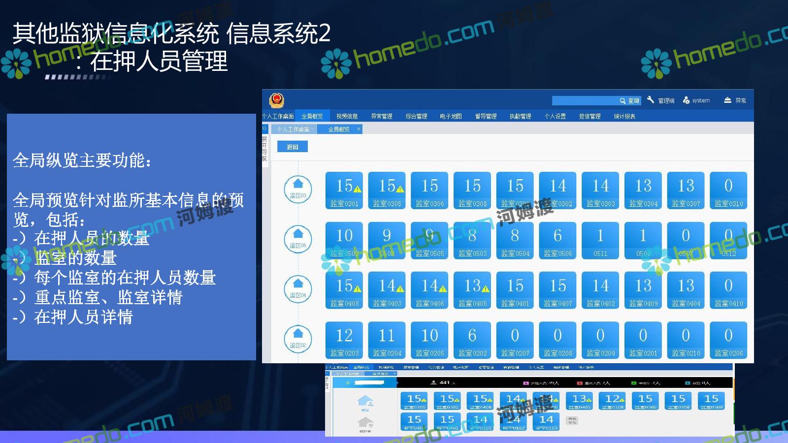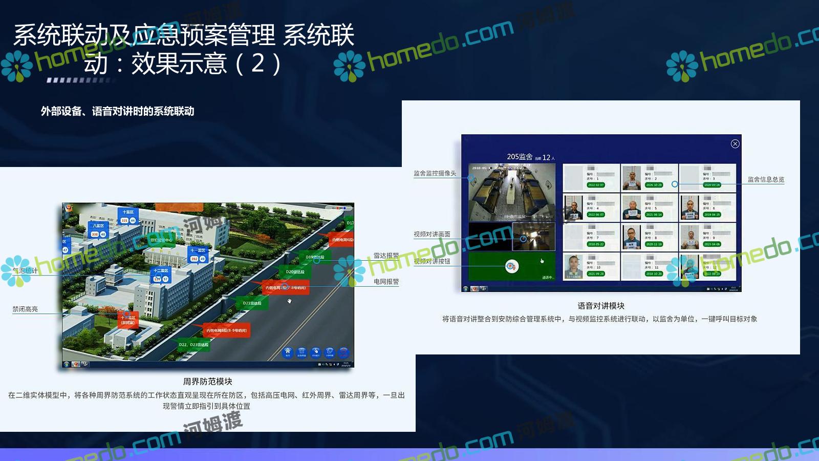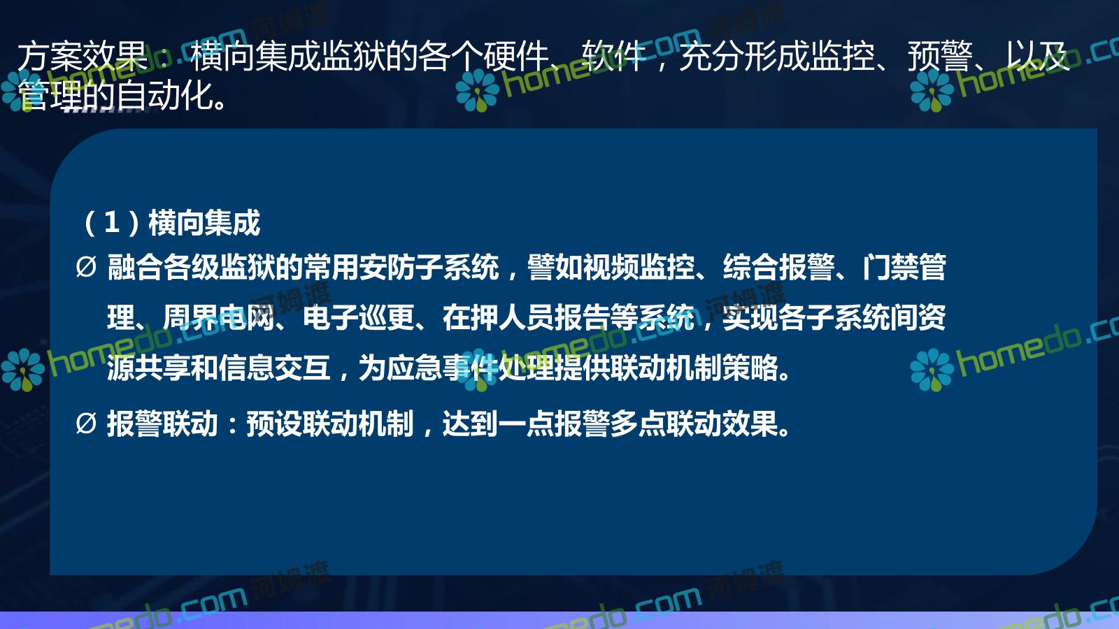 方案简介 智慧监狱”以监控图像资源、物联网感知信息为核心,实现周界报警、高压电网、紧急报警、巡更、门禁、对讲、会见录音等各类安防信息。 另外辅以狱政管理、教育改造、劳动改造、狱内侦查、生活卫生、综合治理等业务信息的全面集成、整合。 还需以“三级警戒架构”为核心,打造省指挥中心-》市指挥中心-》监狱指挥中心的三级组织形式,综合应用平台可以做到各类资源协同共享、应急指挥、综合信息 研判和辅助决策。