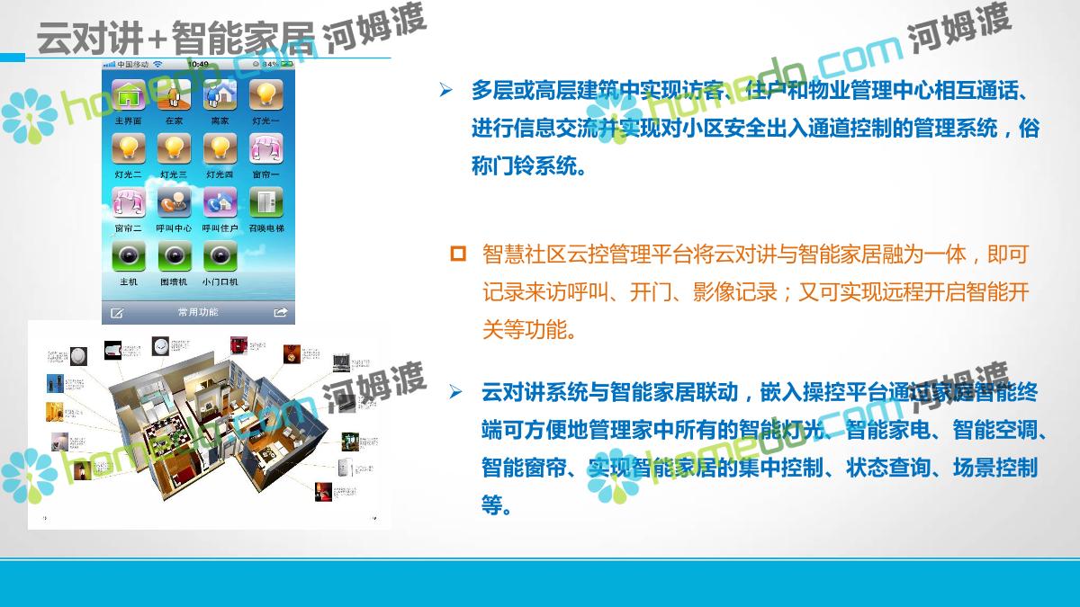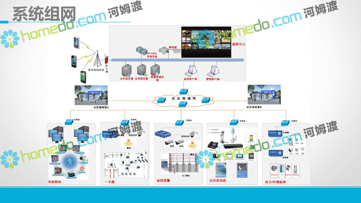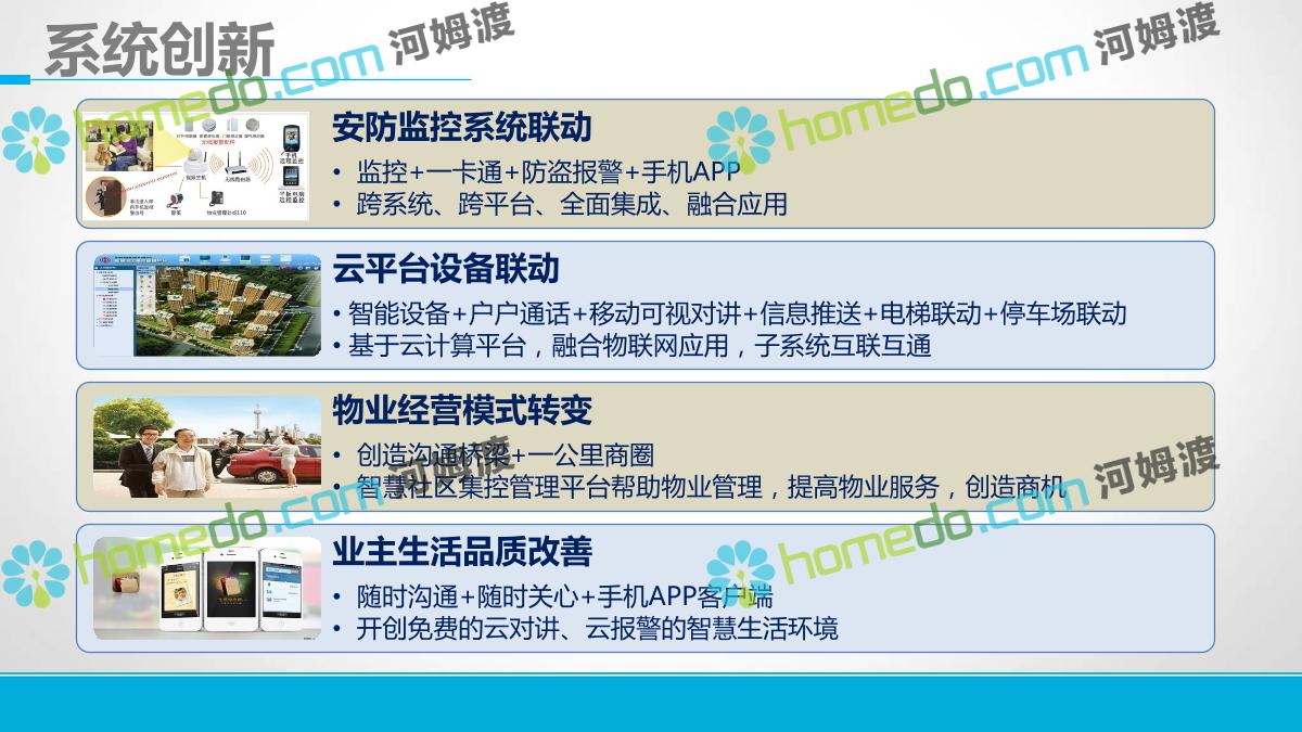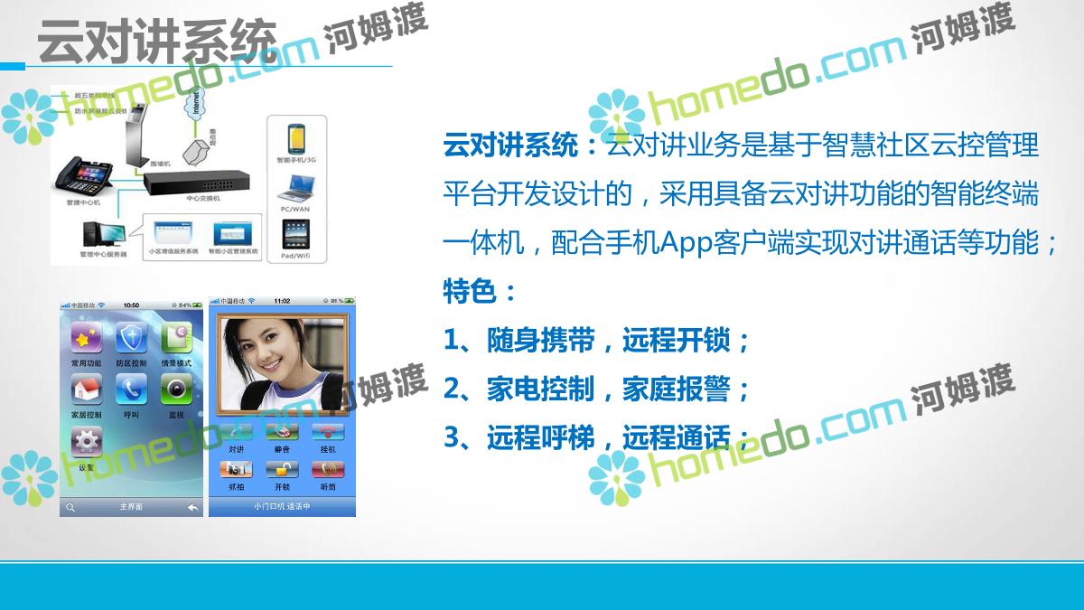 方案简介 安防监控系统联动 监控+一卡通+防盗报警+手机APP 跨系统、跨平台、全面集成、融合应用 云平台设备联动 智能设备+户户通话+移动可视对讲+信息推送+电梯联动+停车场联动 基于云计算平台,融合物联网应用,子系统互联互通 物业经营模式转变 创造沟通桥梁+一公里商圈 智慧社区集控管理平台帮助物业管理,提高物业服务,创造商机 业主生活品质改善 随时沟通+随时关心+手机APP客户端 开创免费的云对讲、云报警的智慧生活环境
