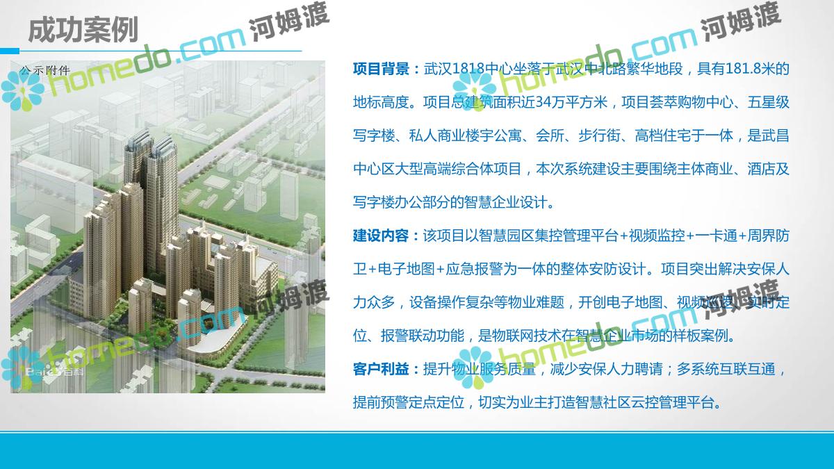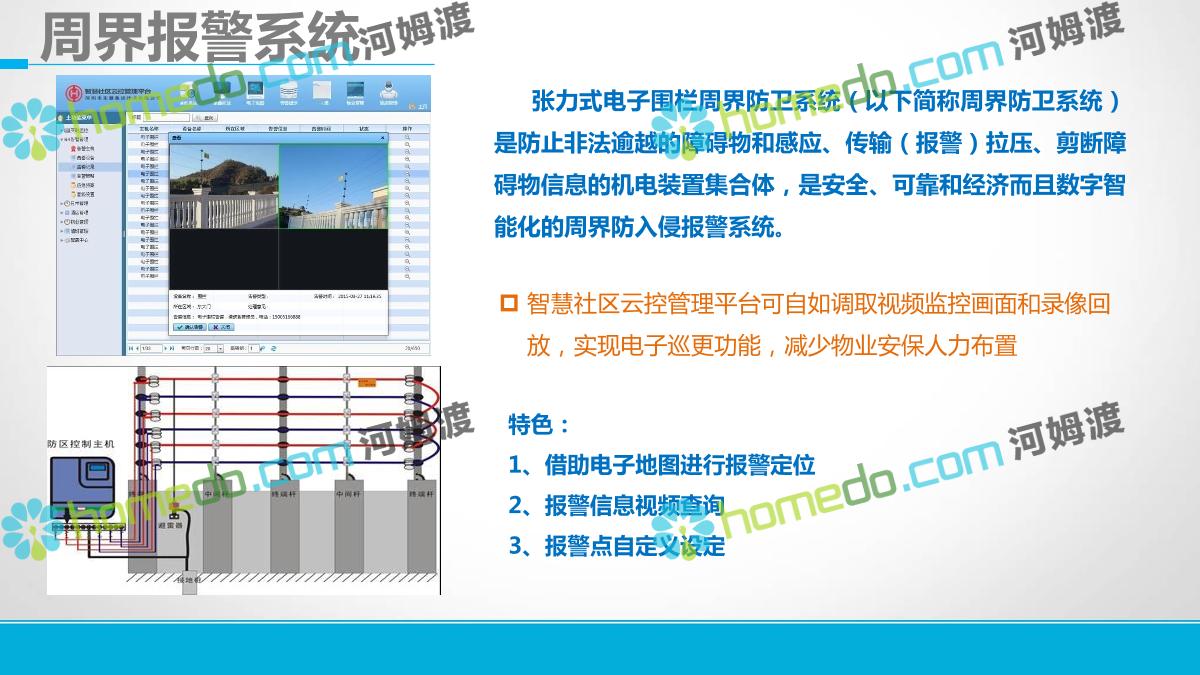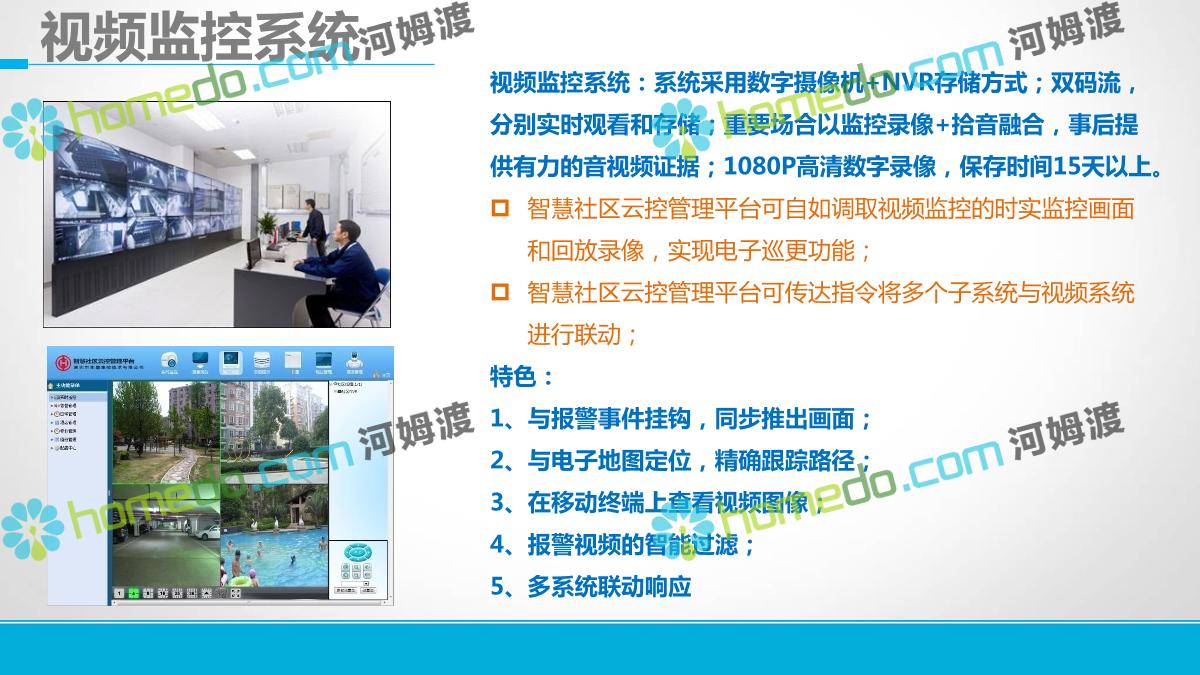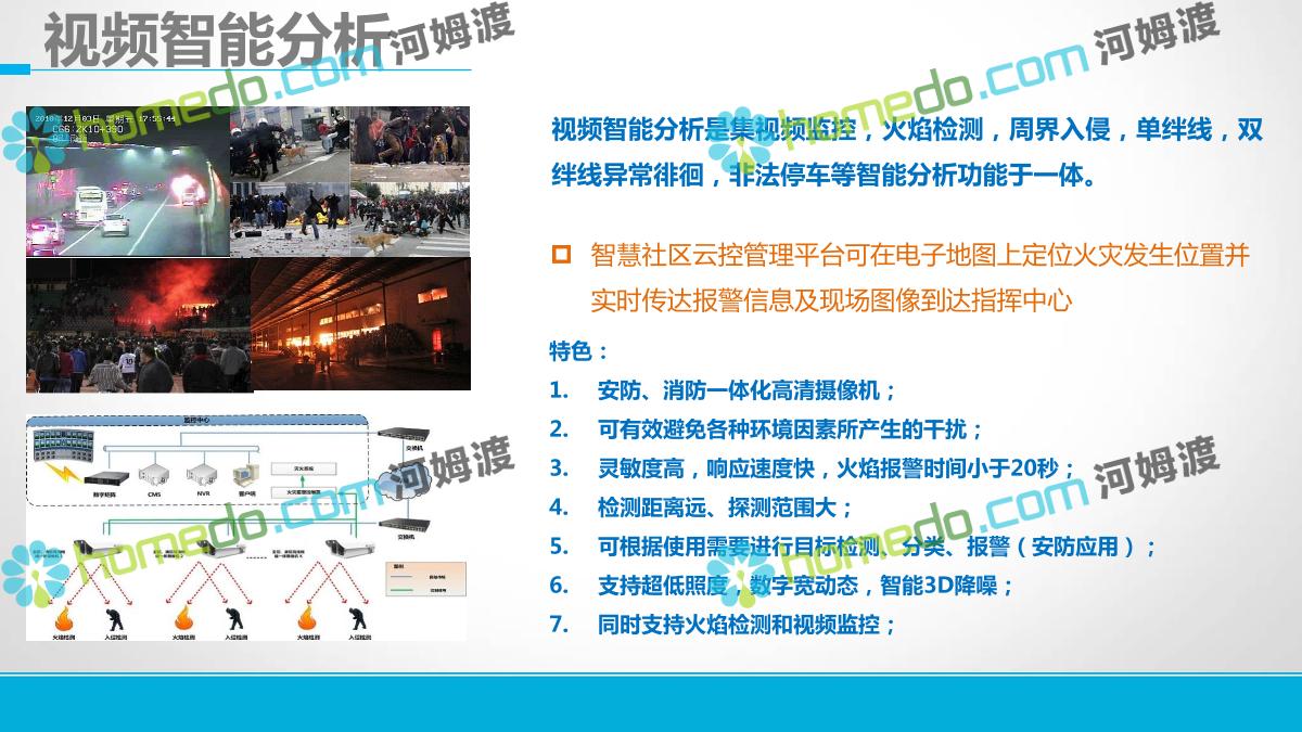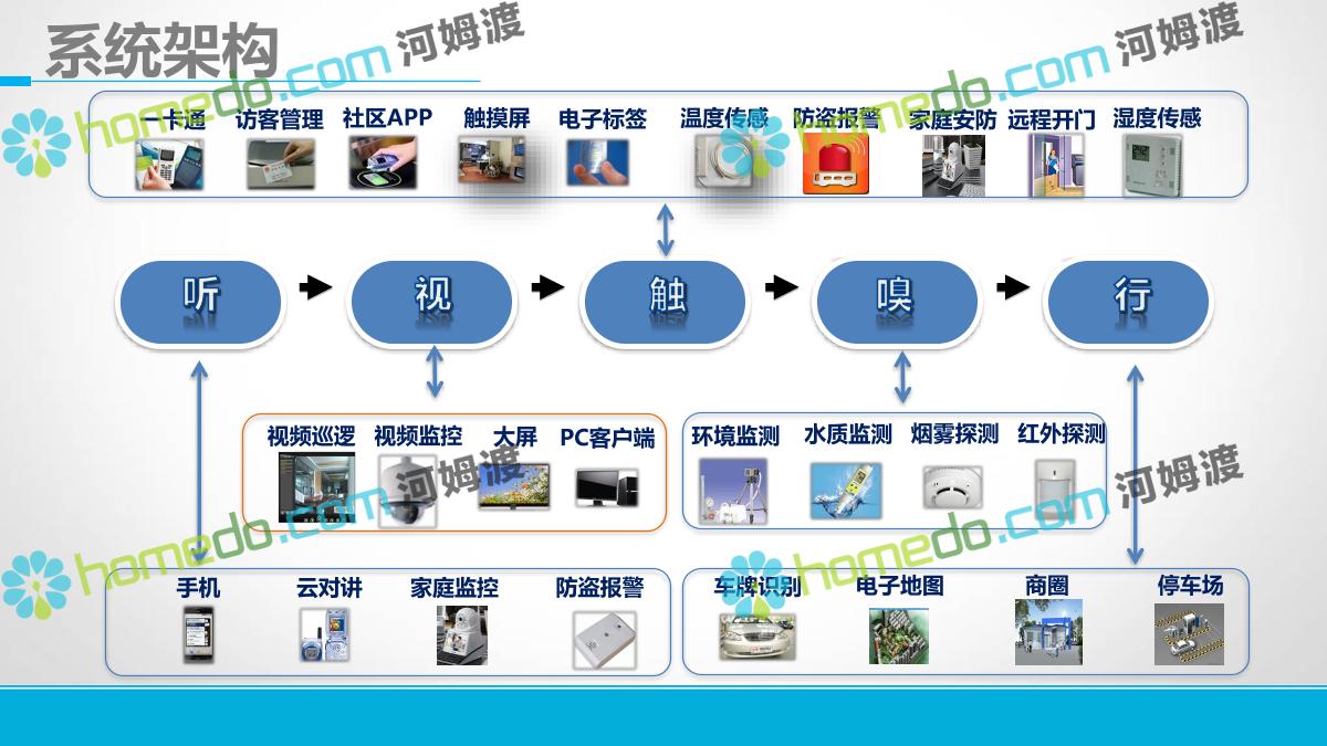 方案简介 安防监控系统联动 监控+一卡通+防盗报警+手机APP 跨系统、跨平台、全面集成、融合应用 云平台设备联动 智能设备+户户通话+移动可视对讲+信息推送+电梯联动+停车场联动 基于云计算平台,融合物联网应用,子系统互联互通 物业经营模式转变 创造沟通桥梁+一公里商圈 智慧社区集控管理平台帮助物业管理,提高物业服务,创造商机 业主生活品质改善 随时沟通+随时关心+手机APP客户端 开创免费的云对讲、云报警的智慧生活环境