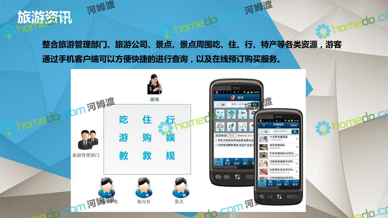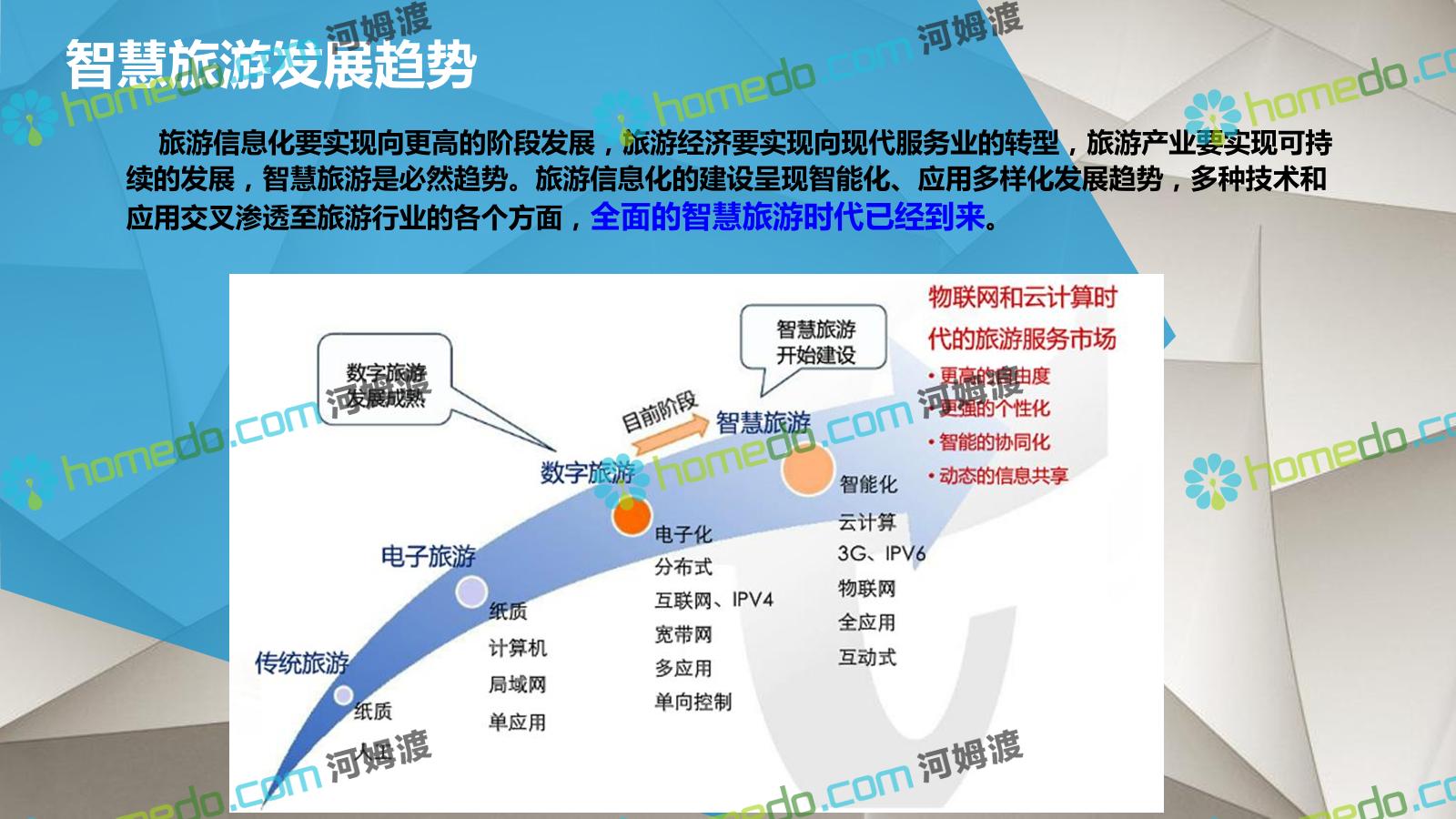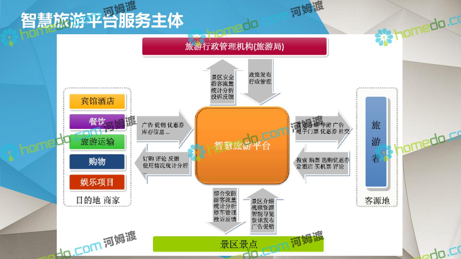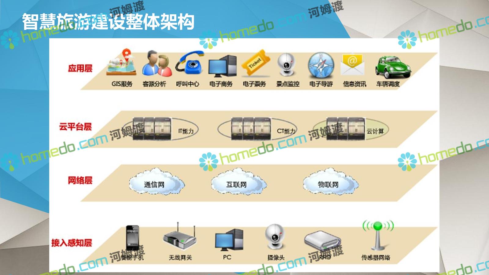 方案简介 利用云计算、物联网等新技术,通过互联网/移动互联网,借助便携的终端上网设备,主动感知旅游资源、旅游经济、旅游活动、旅游者等方面的信息,及时发布,让人们能够及时了解这些信息,及时安排和调整工作与旅游计划,从而对各类旅游信息实现智能感知、方便利用。 智慧旅游的推广,将提升旅游者在食、住、行、游、购、娱每个旅游消费环节中的附加值;旅游者在旅游前、旅游中、旅游后,都能轻松获取资讯、规划出行、预订票务、安排食宿、消费支出等,极大改善旅游体验。