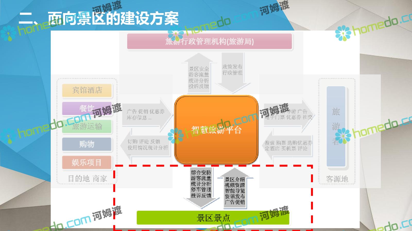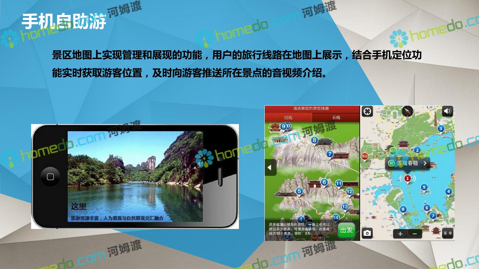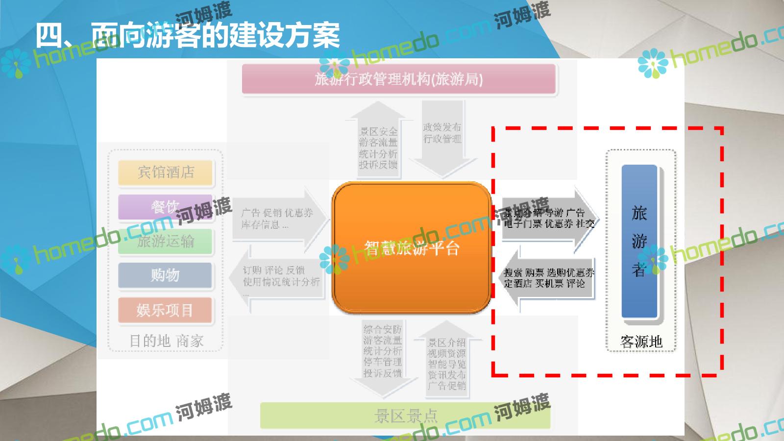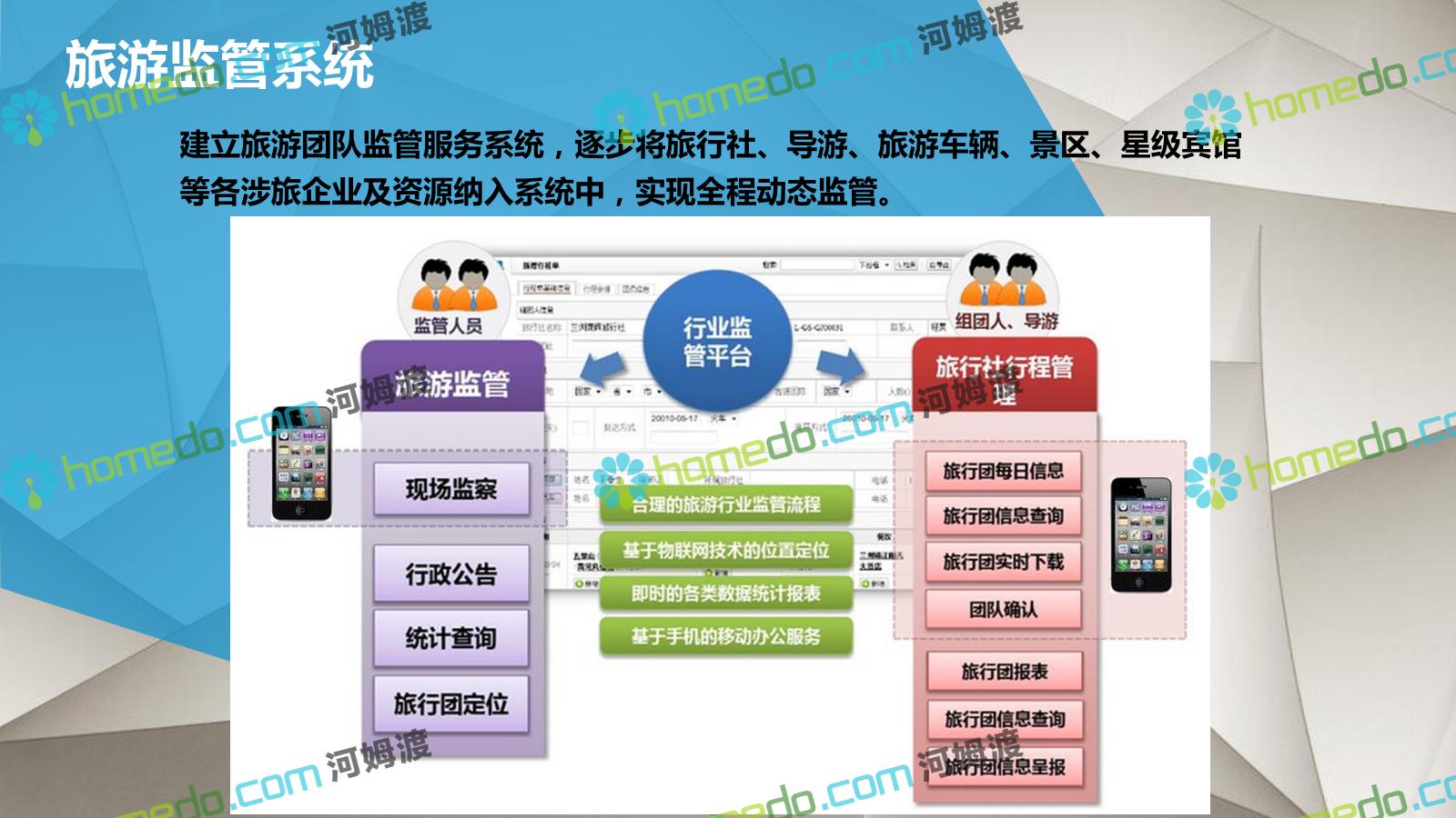 方案简介 利用云计算、物联网等新技术,通过互联网/移动互联网,借助便携的终端上网设备,主动感知旅游资源、旅游经济、旅游活动、旅游者等方面的信息,及时发布,让人们能够及时了解这些信息,及时安排和调整工作与旅游计划,从而对各类旅游信息实现智能感知、方便利用。 智慧旅游的推广,将提升旅游者在食、住、行、游、购、娱每个旅游消费环节中的附加值;旅游者在旅游前、旅游中、旅游后,都能轻松获取资讯、规划出行、预订票务、安排食宿、消费支出等,极大改善旅游体验。