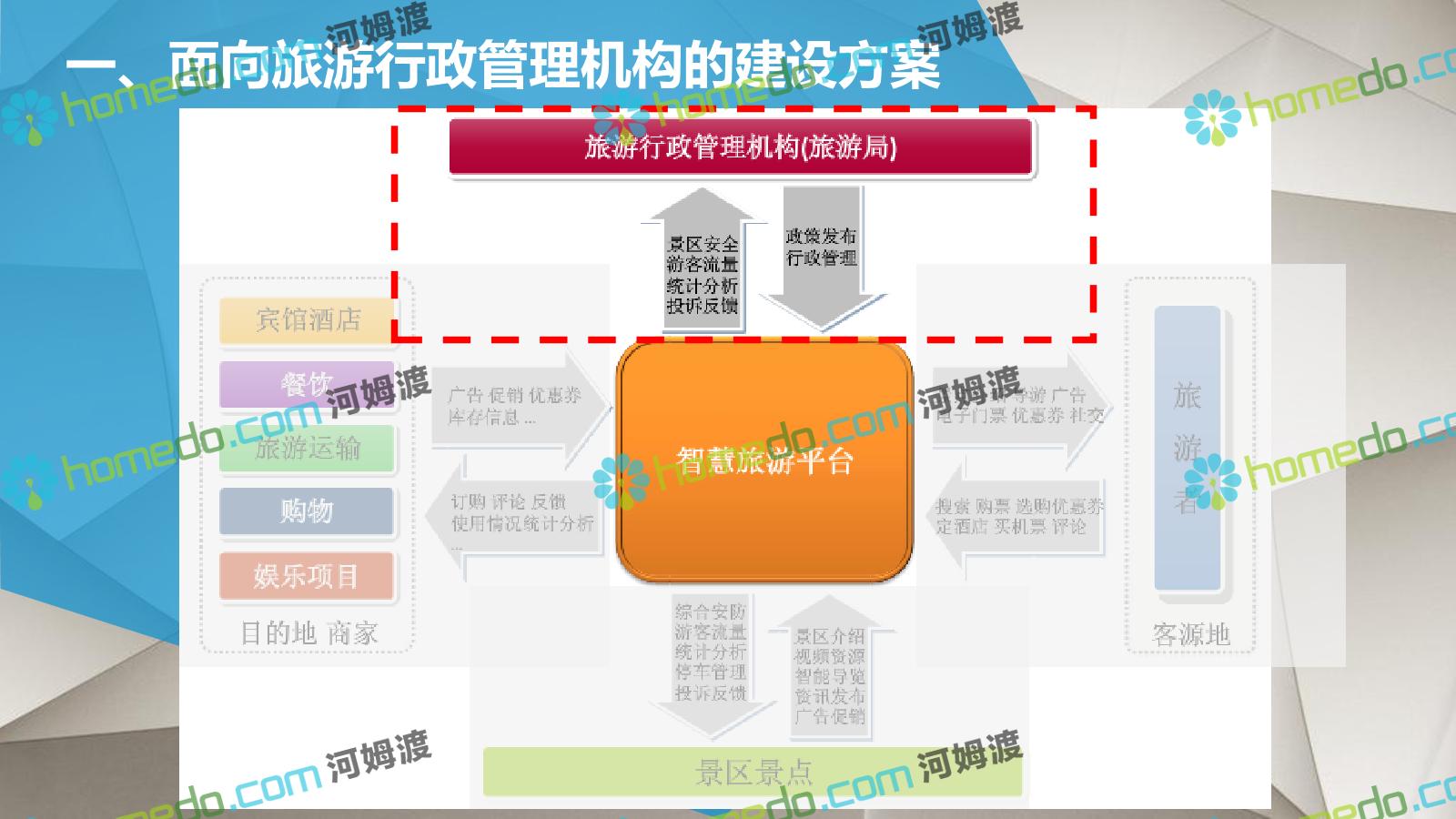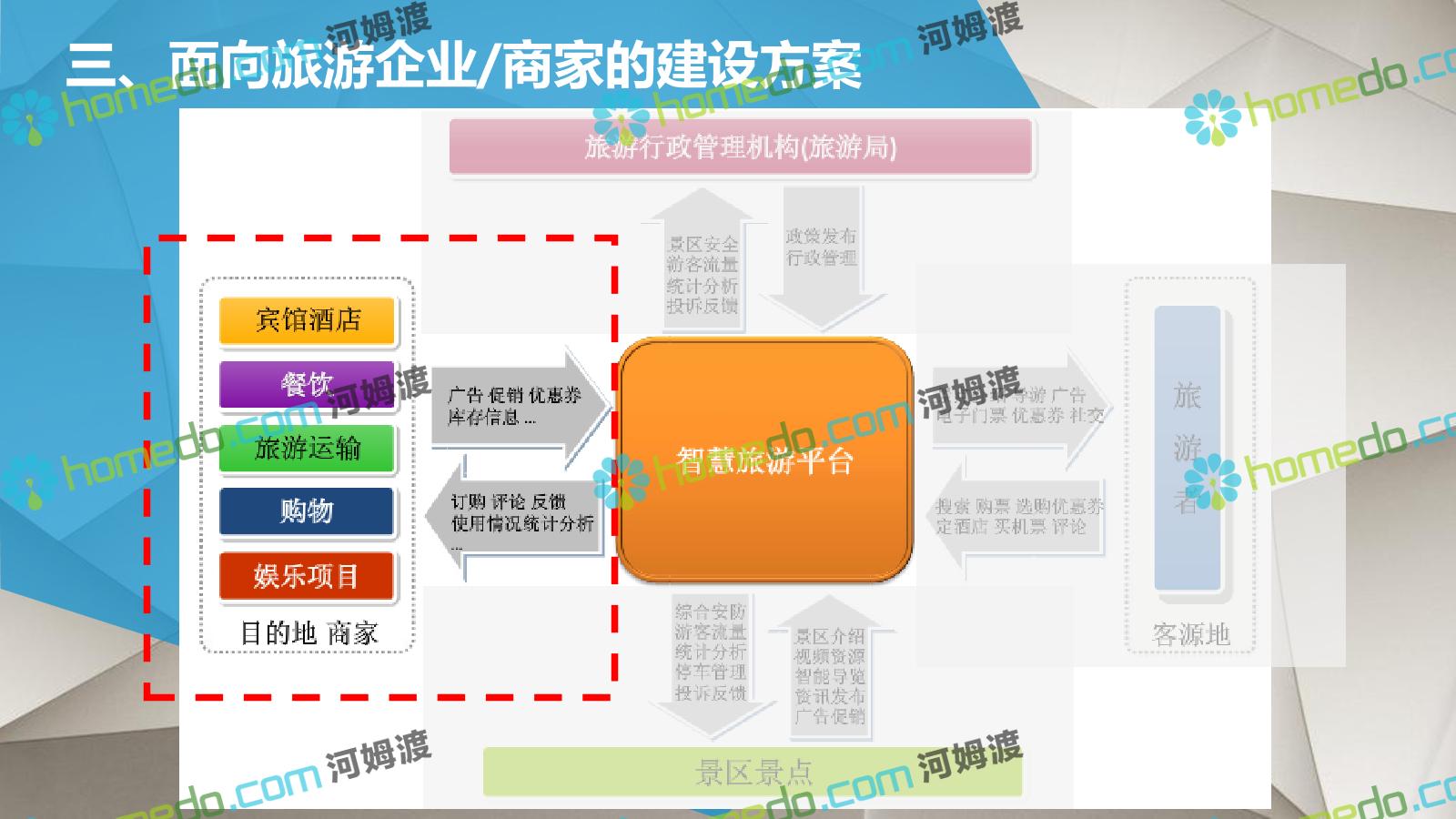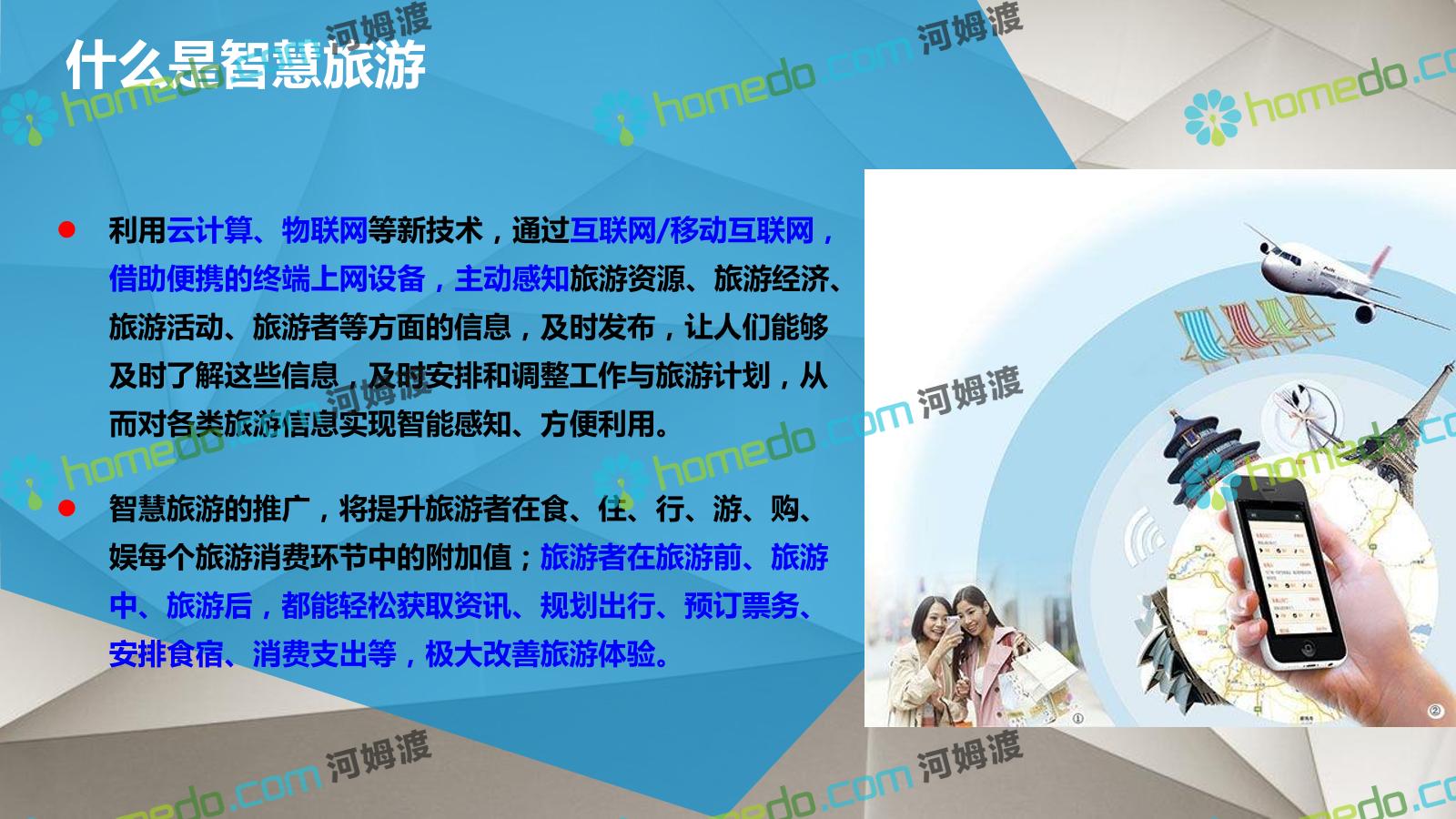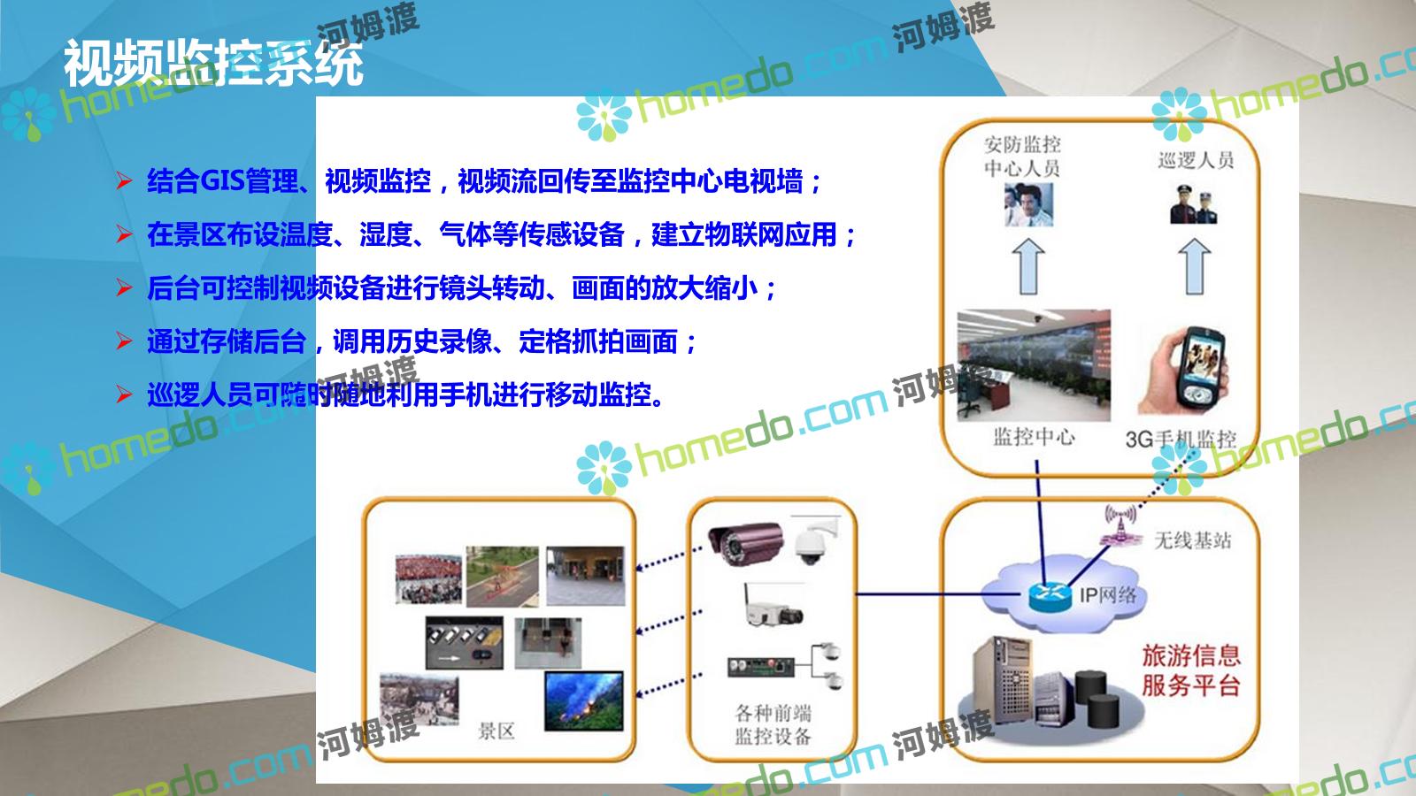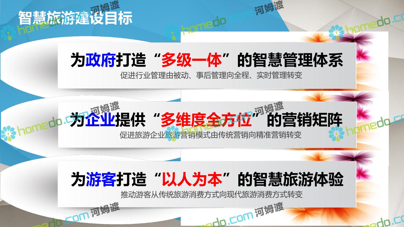方案简介 利用云计算、物联网等新技术,通过互联网/移动互联网,借助便携的终端上网设备,主动感知旅游资源、旅游经济、旅游活动、旅游者等方面的信息,及时发布,让人们能够及时了解这些信息,及时安排和调整工作与旅游计划,从而对各类旅游信息实现智能感知、方便利用。 智慧旅游的推广,将提升旅游者在食、住、行、游、购、娱每个旅游消费环节中的附加值;旅游者在旅游前、旅游中、旅游后,都能轻松获取资讯、规划出行、预订票务、安排食宿、消费支出等,极大改善旅游体验。