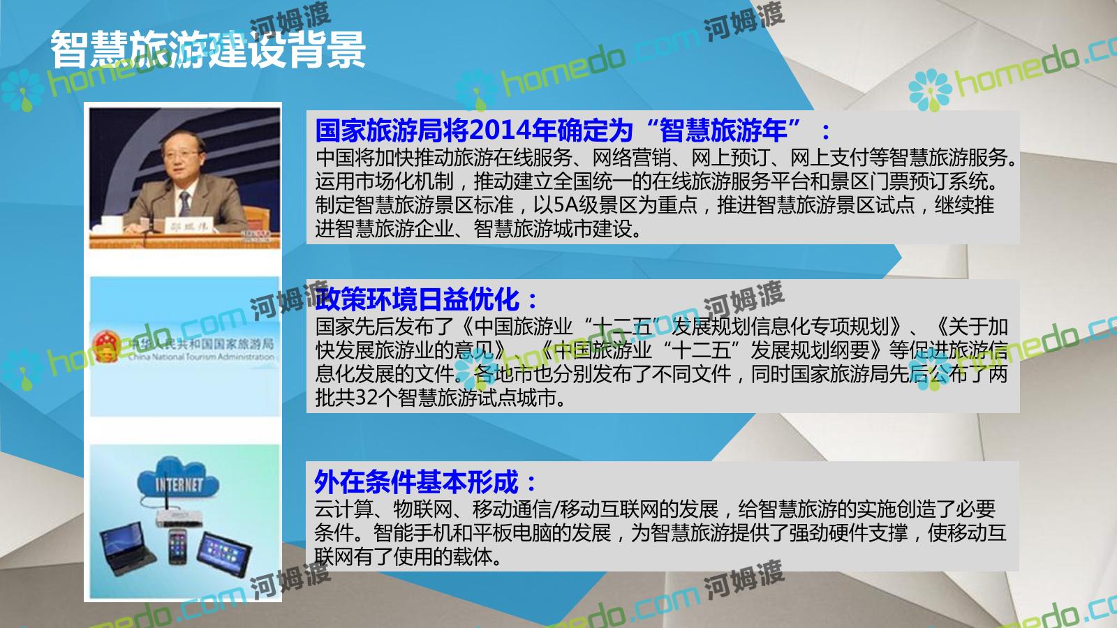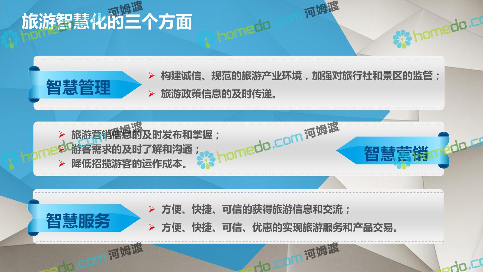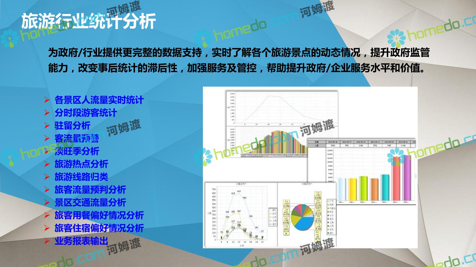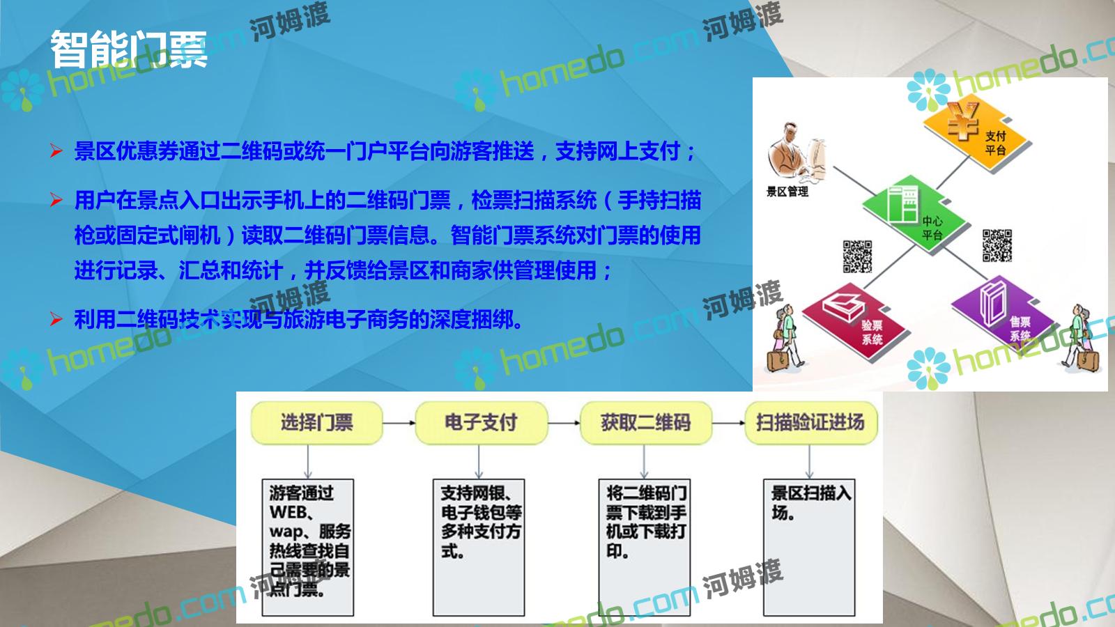 方案简介 利用云计算、物联网等新技术,通过互联网/移动互联网,借助便携的终端上网设备,主动感知旅游资源、旅游经济、旅游活动、旅游者等方面的信息,及时发布,让人们能够及时了解这些信息,及时安排和调整工作与旅游计划,从而对各类旅游信息实现智能感知、方便利用。 智慧旅游的推广,将提升旅游者在食、住、行、游、购、娱每个旅游消费环节中的附加值;旅游者在旅游前、旅游中、旅游后,都能轻松获取资讯、规划出行、预订票务、安排食宿、消费支出等,极大改善旅游体验。