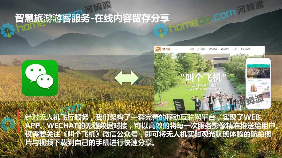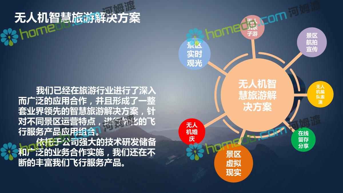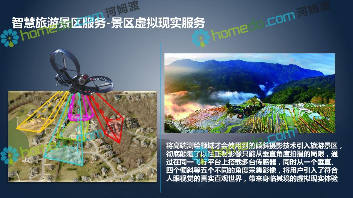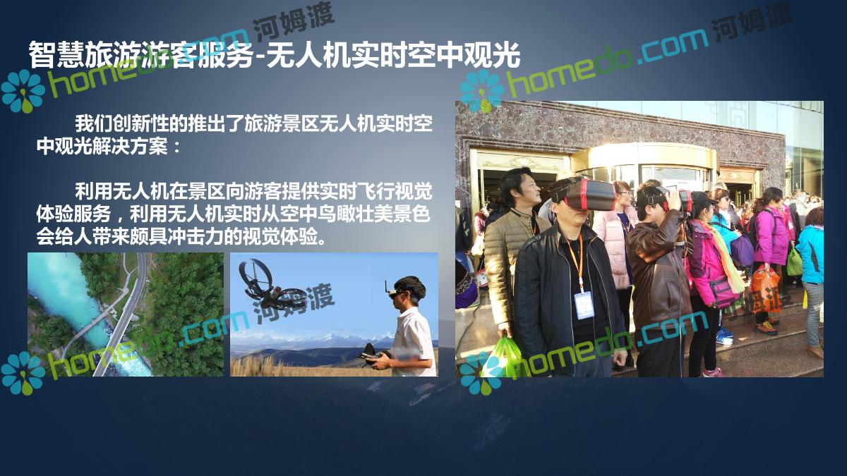 方案简介 利用无人机在景区向游客提供实时飞行视觉体验服务,利用无人机实时从空中鸟瞰壮美景色会给人带来颇具冲击力的视觉体验。