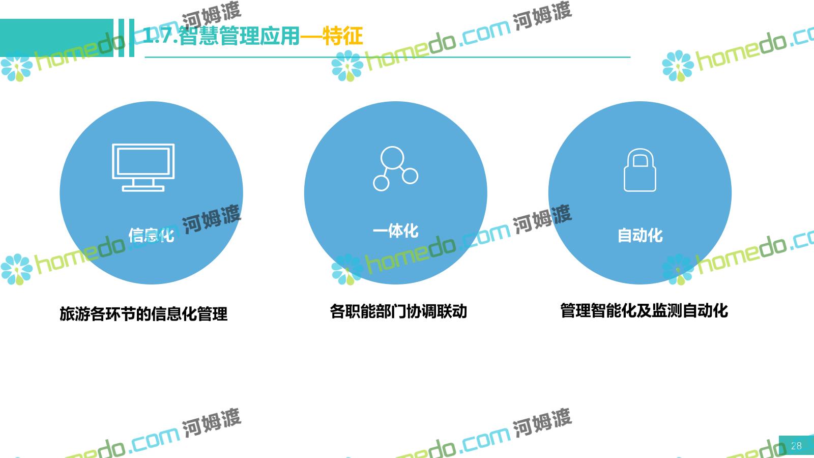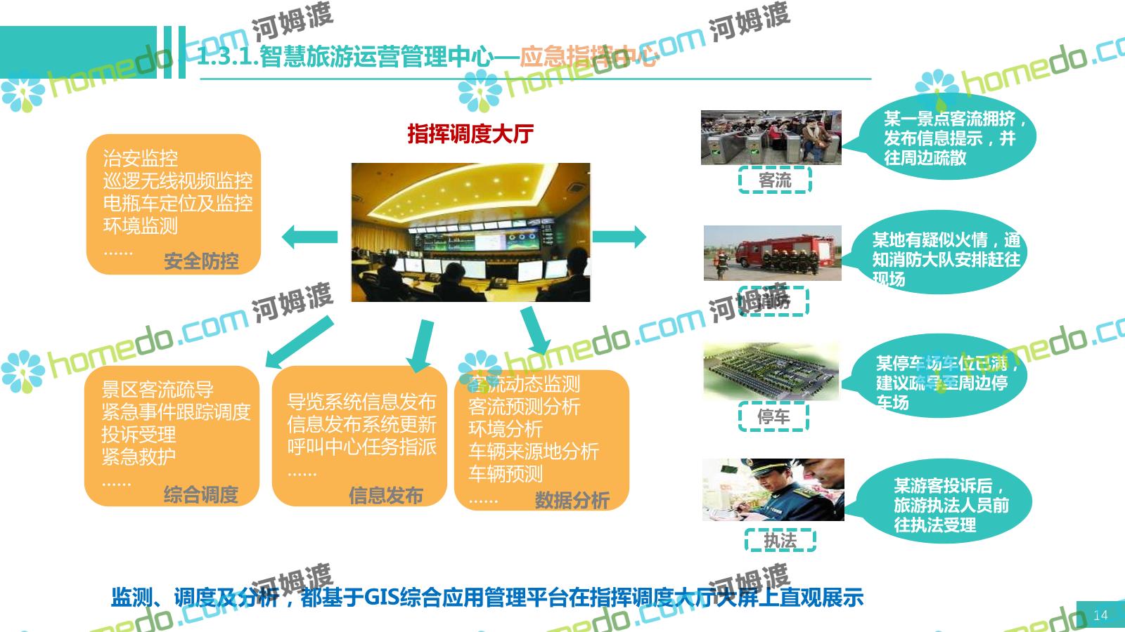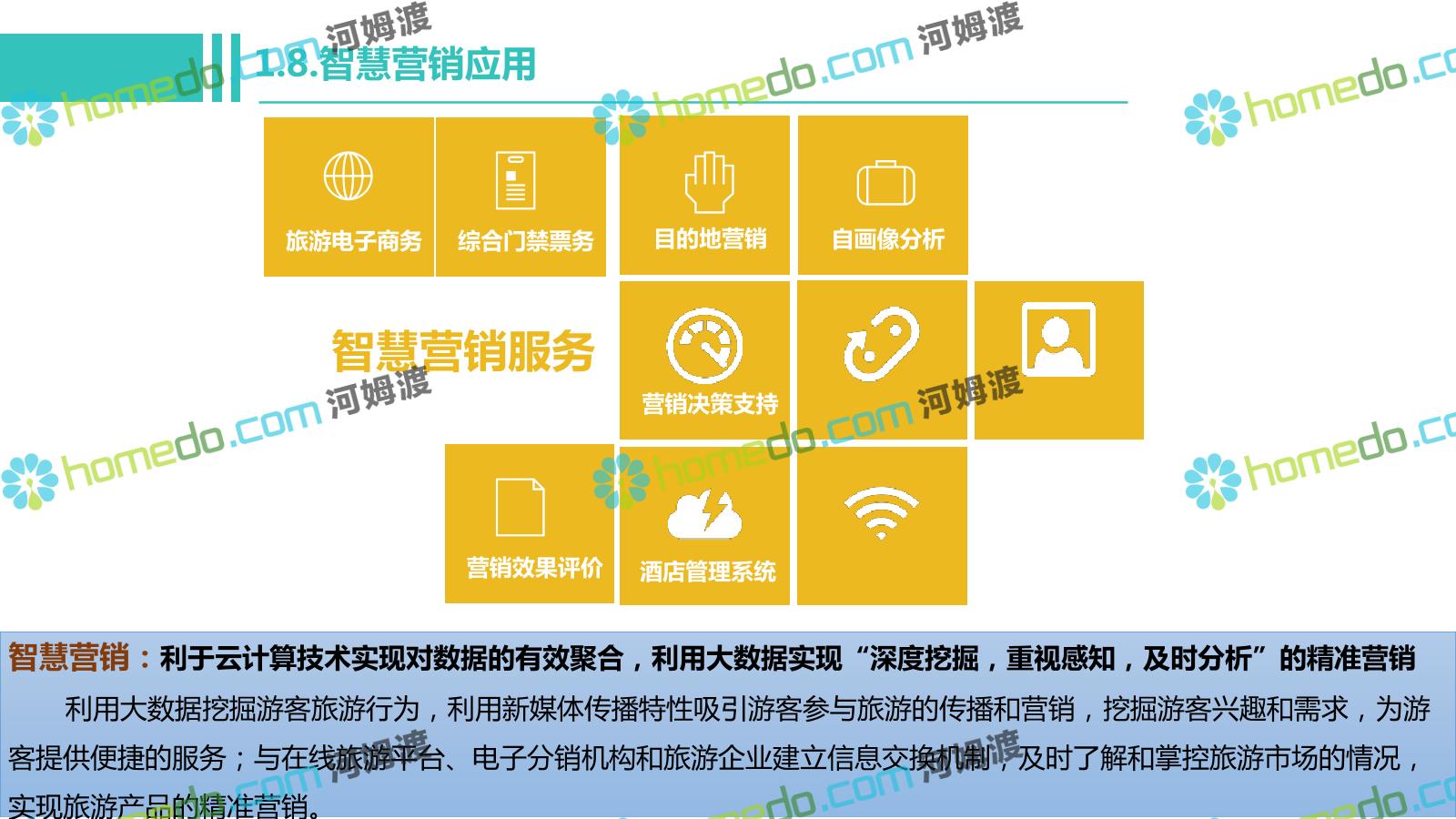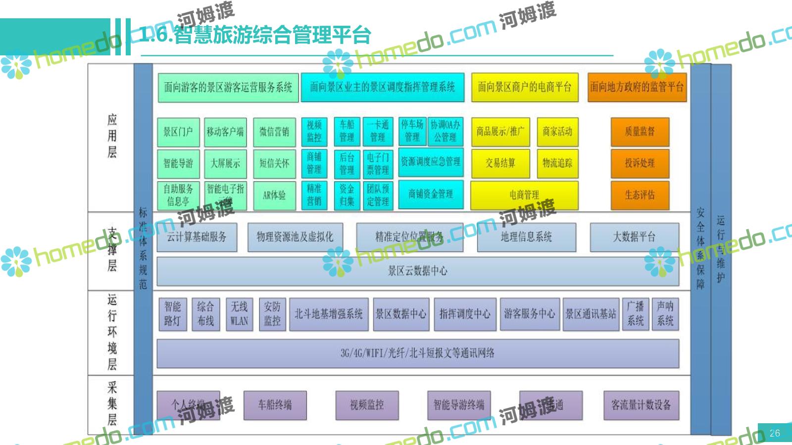 方案简介 以“智慧、安全、绿色、人文、活力”为规划目标,结合国内外智慧文旅产业的前沿理念,采用物联网、互联网/移动互联网、虚拟现实等新技术,通过智能化基础设施、智能化设施管控、智能化集成运营管理、智慧应用服务、智慧化营销管理等模块组合,将智能化与信息化进行完美融合,打造一个全方位的智慧旅游平台。 设计通过信息通信、安全防范、设施管理、运营管理一键控、客流引导、旅游管理、智慧旅游服务、手机游园、大数据分析等系统之间的交互和融合,进行旅游商业模式创新。