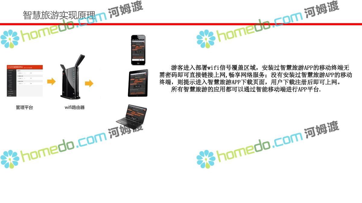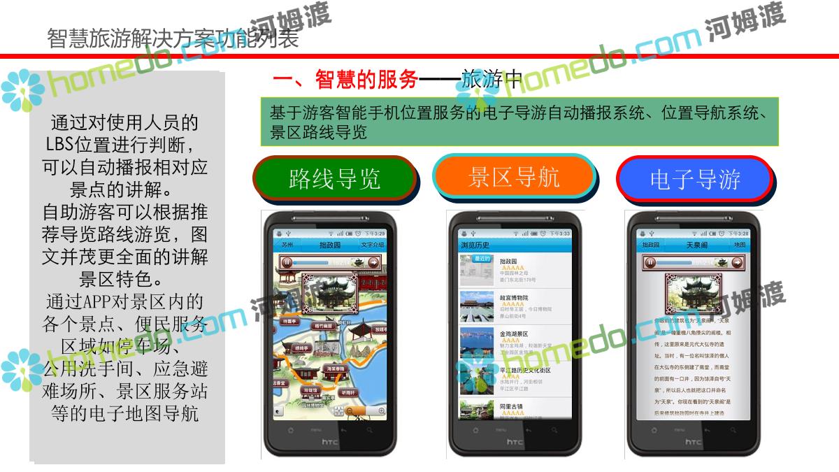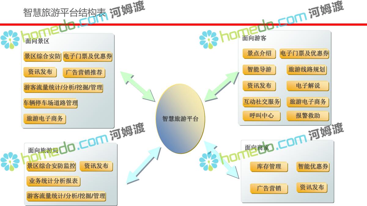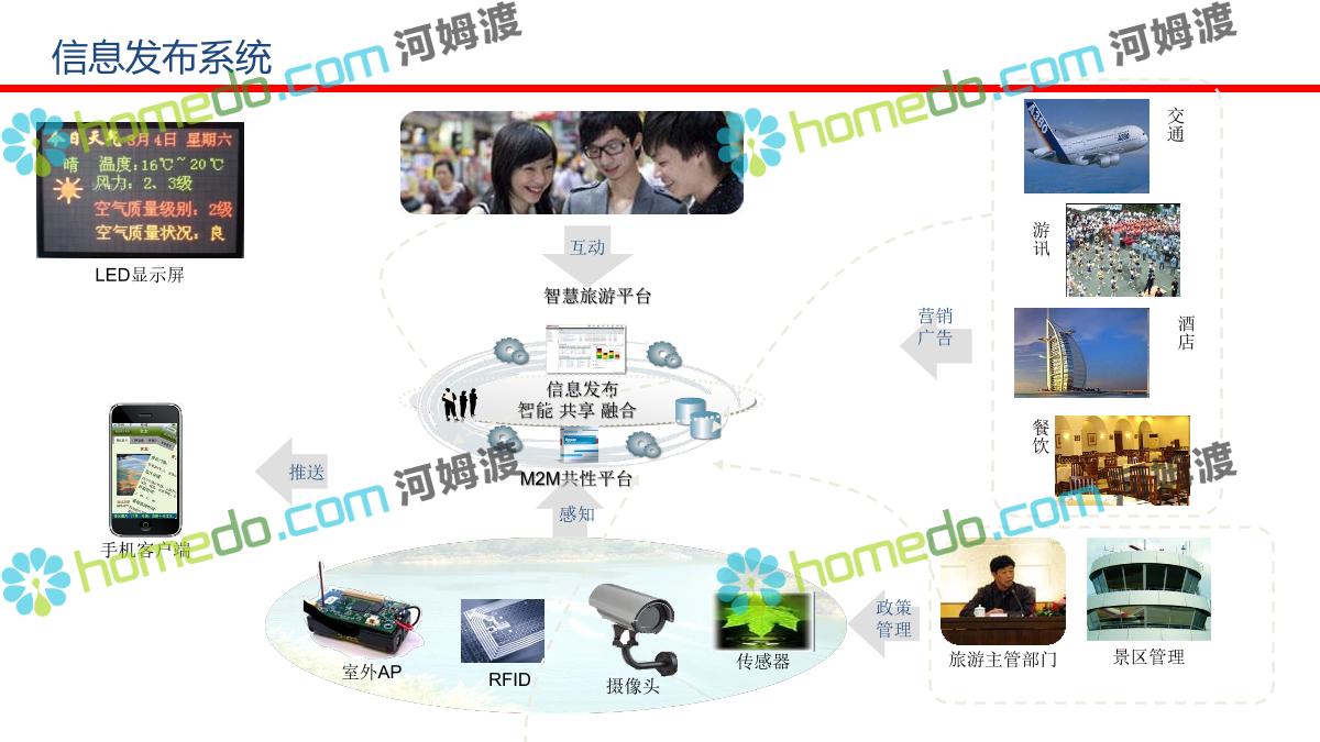 方案简介 智慧旅游也被称为智能旅游,就是利用云计算,物联网等新技术,通过互联网,移动互联网,借助便携的上网终端,主动感知旅游资源,旅游经济,旅游活动等方面的信息,达到及时发布、及时了解、及时安排和调整工作与计划,从而实现对各类旅游信息的智能感知和利用。智慧旅游的推广将提升游客在食、住、行、游、购、娱各个旅游环节中的附加值。
