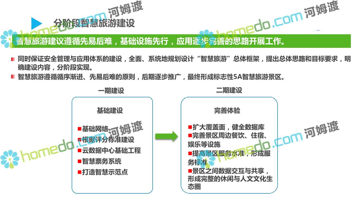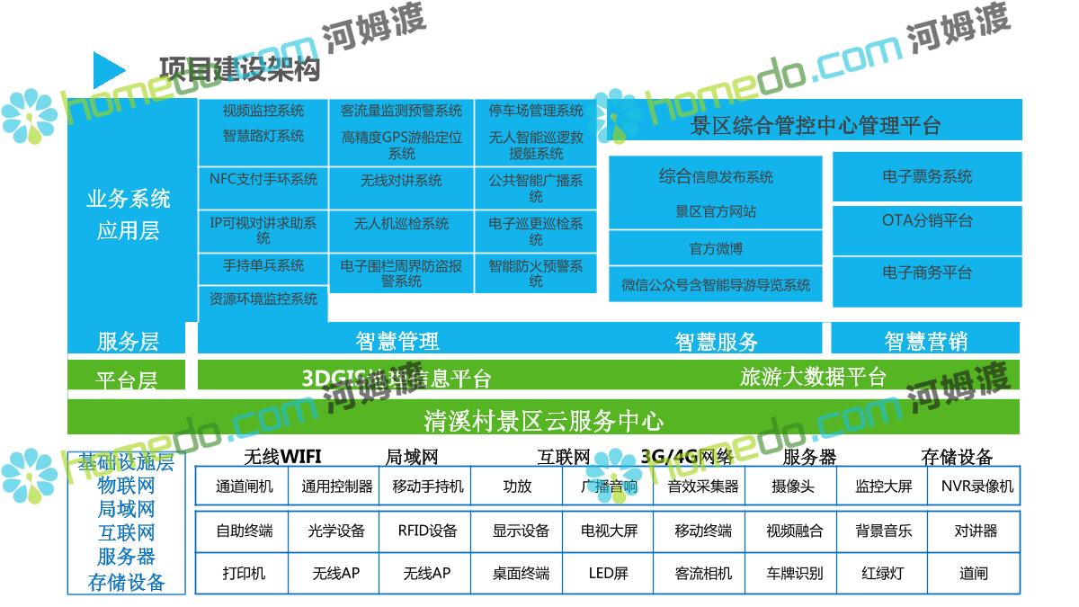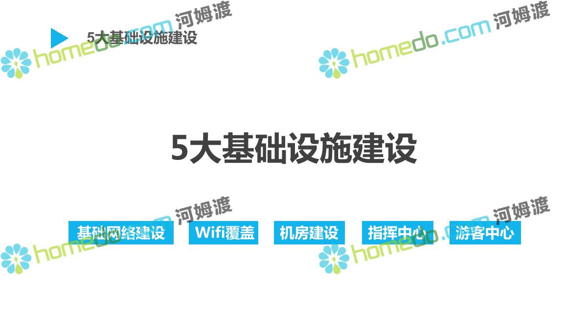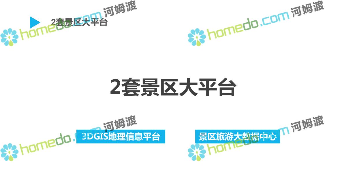 方案简介 以创5A新标准为准则,完成智慧景区建设。将重点进行基础设施、平台建设、管理、服务和营销的建设。 建设内容-5大基础设施建设 + 2套大平台 + 24个应用系统