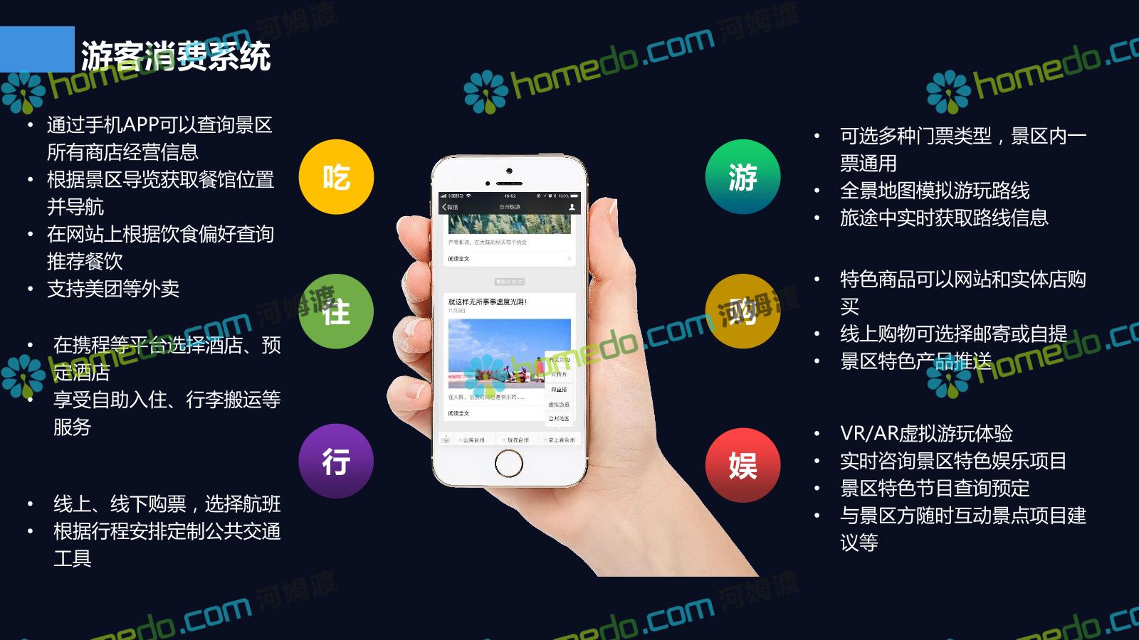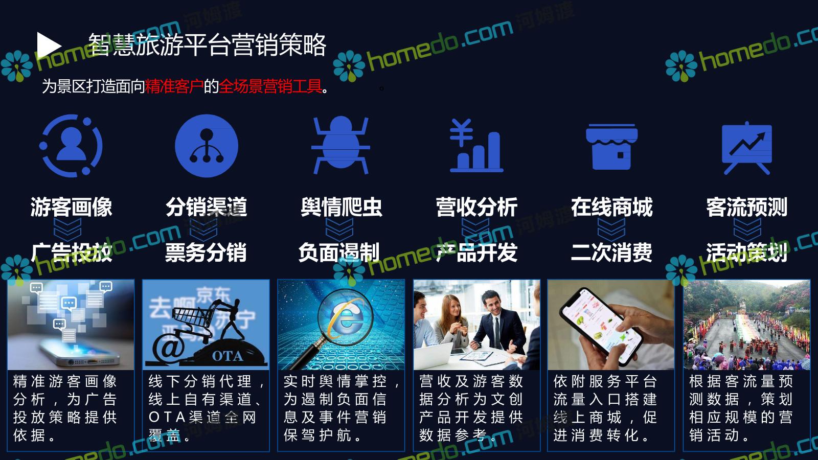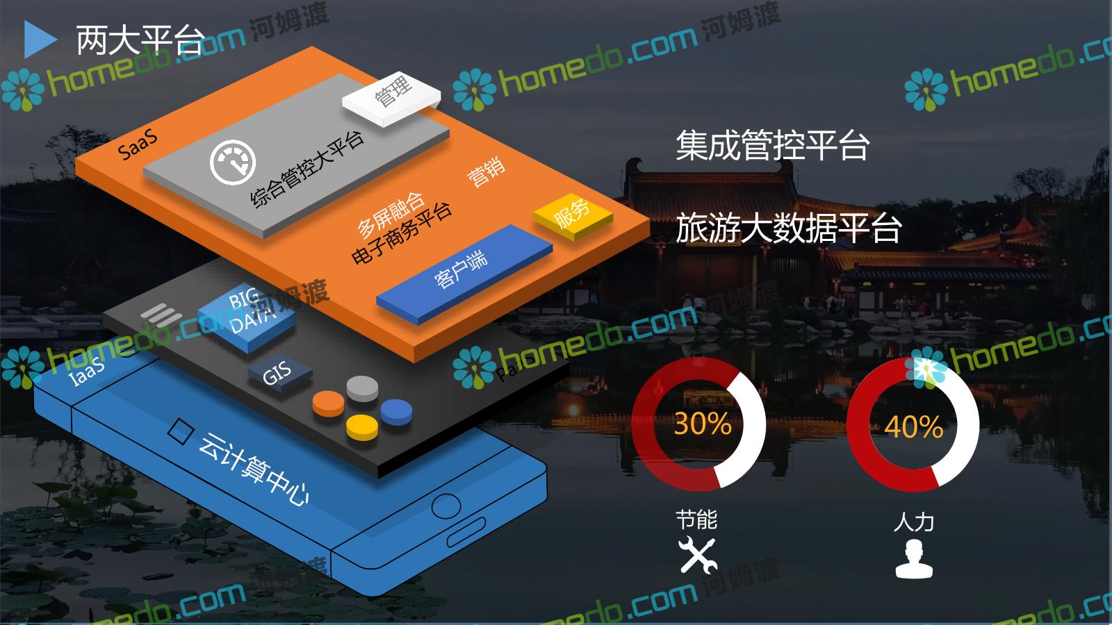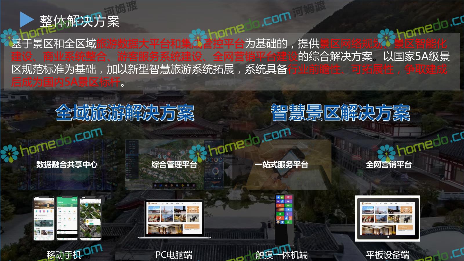 方案简介 基于景区和全区域旅游数据大平台和集成管控平台为基础的,提供景区网络规划、景区智能化建设、商业系统整合、游客服务系统建设、全网营销平台建设的综合解决方案。以国家5A级景区规范标准为基础,加以新型智慧旅游系统拓展,系统具备行业前瞻性、可拓展性,争取建成后成为国内5A景区标杆。