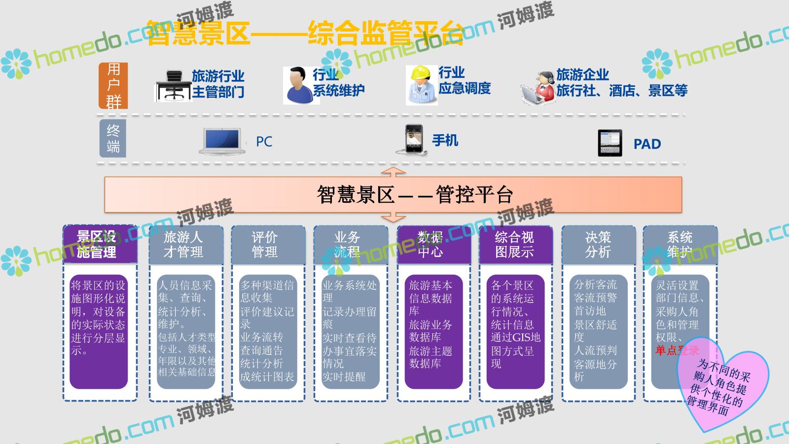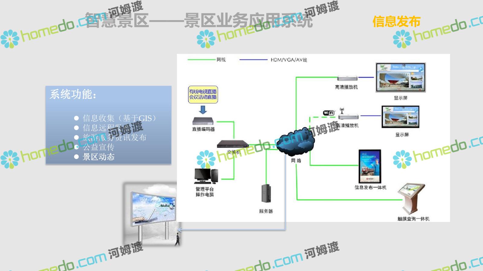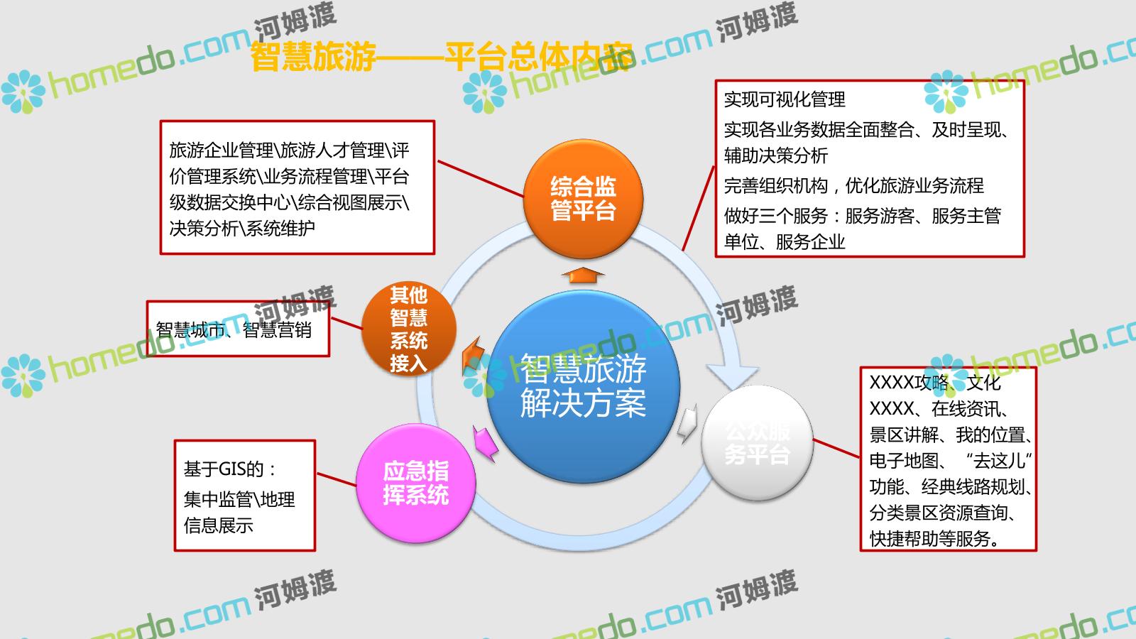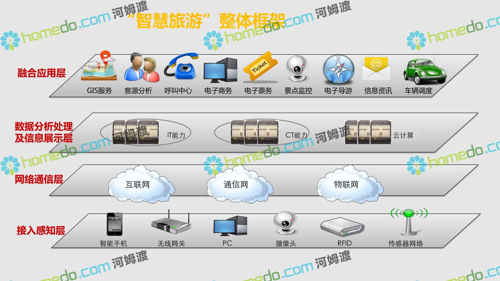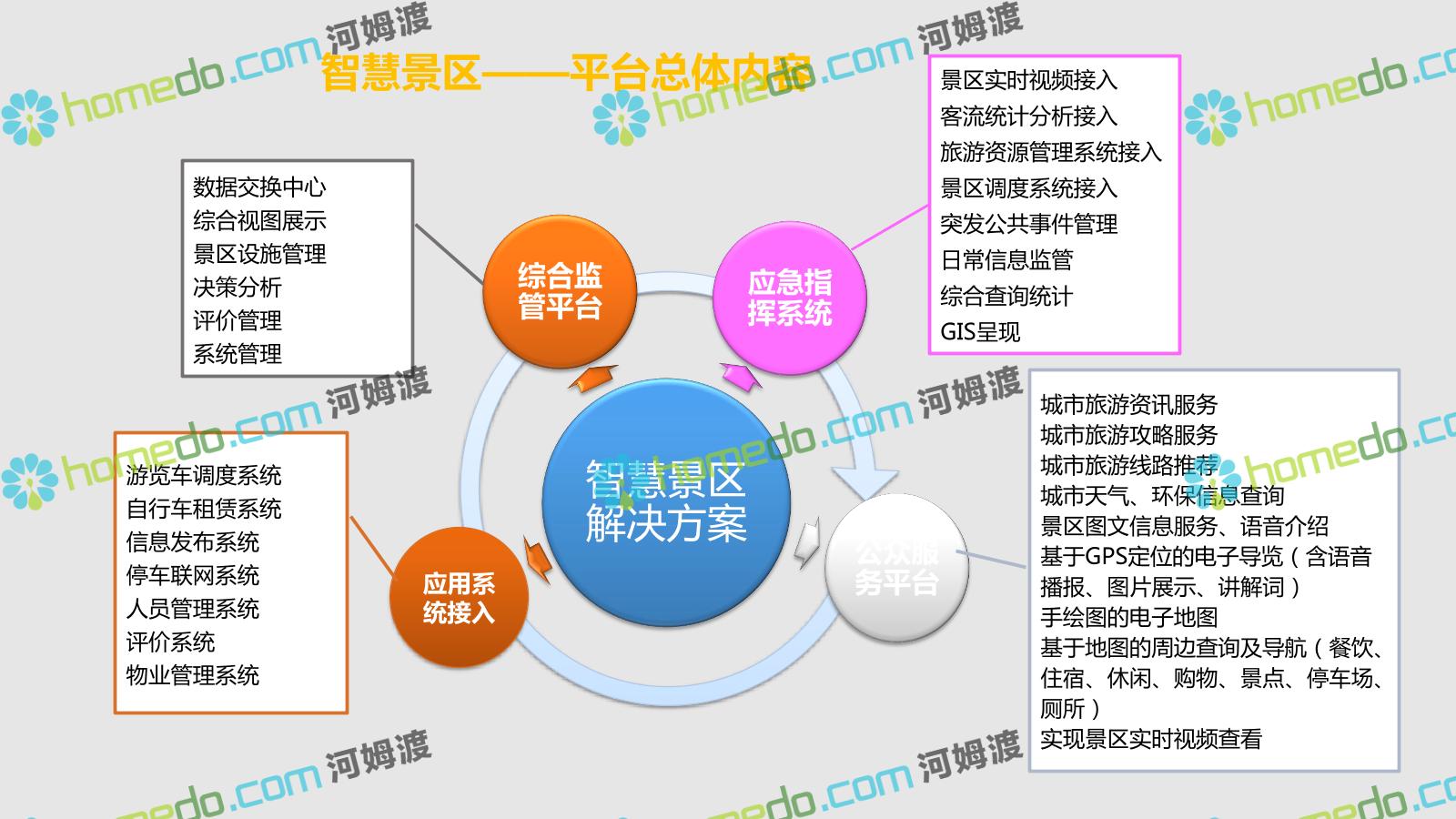 方案简介 智慧旅游是利用云计算、物联网等新技术,通过互联网、移动互联网、借助便携的上网终端,主动感知旅游资源、旅游经济、旅游活动等方面的信息,实现对各类旅游信息的智能感知和利用。智慧旅游的推广将提升旅游者在食、住、行、游、购、娱等各个旅游环节中的感知及体验。