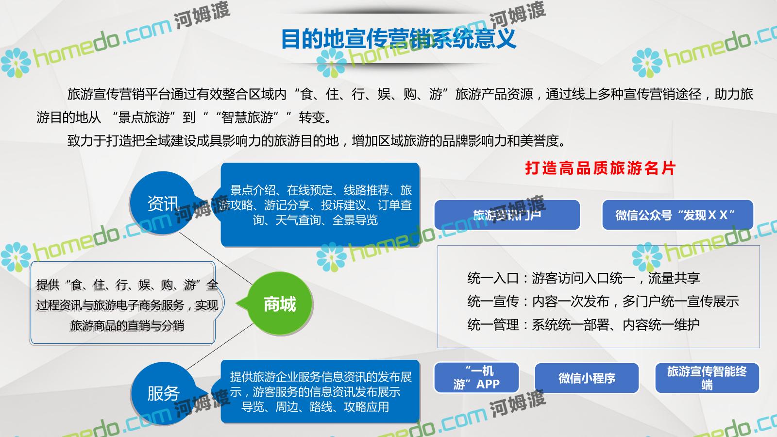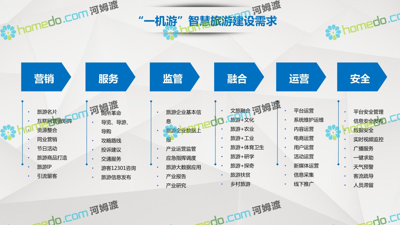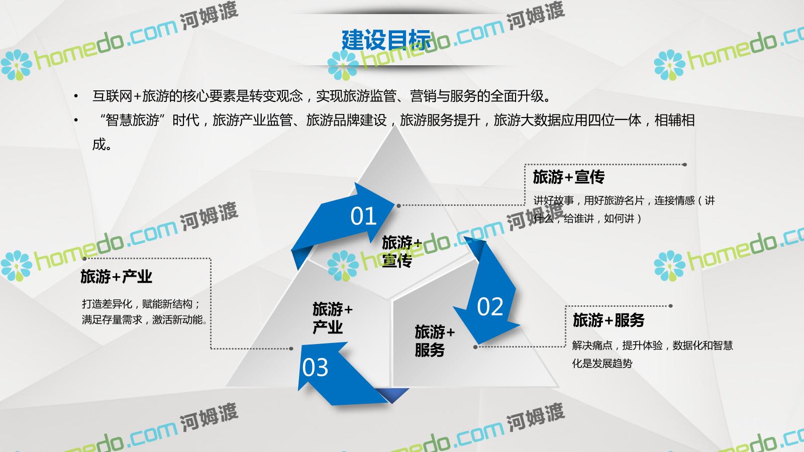 方案简介 互联网+旅游的核心要素是转变观念,实现旅游监管、营销与服务的全面升级。 “智慧旅游”时代,旅游产业监管、旅游品牌建设,旅游服务提升,旅游大数据应用四位一体,相辅相成。