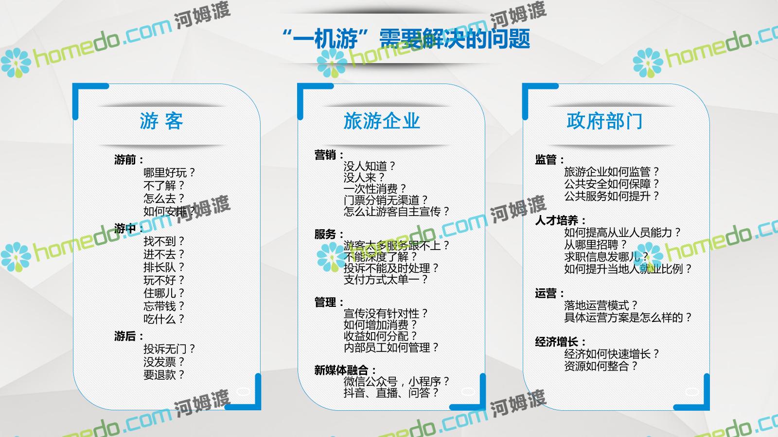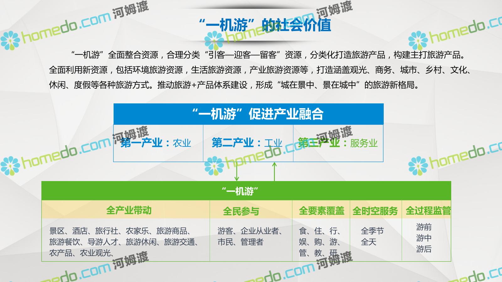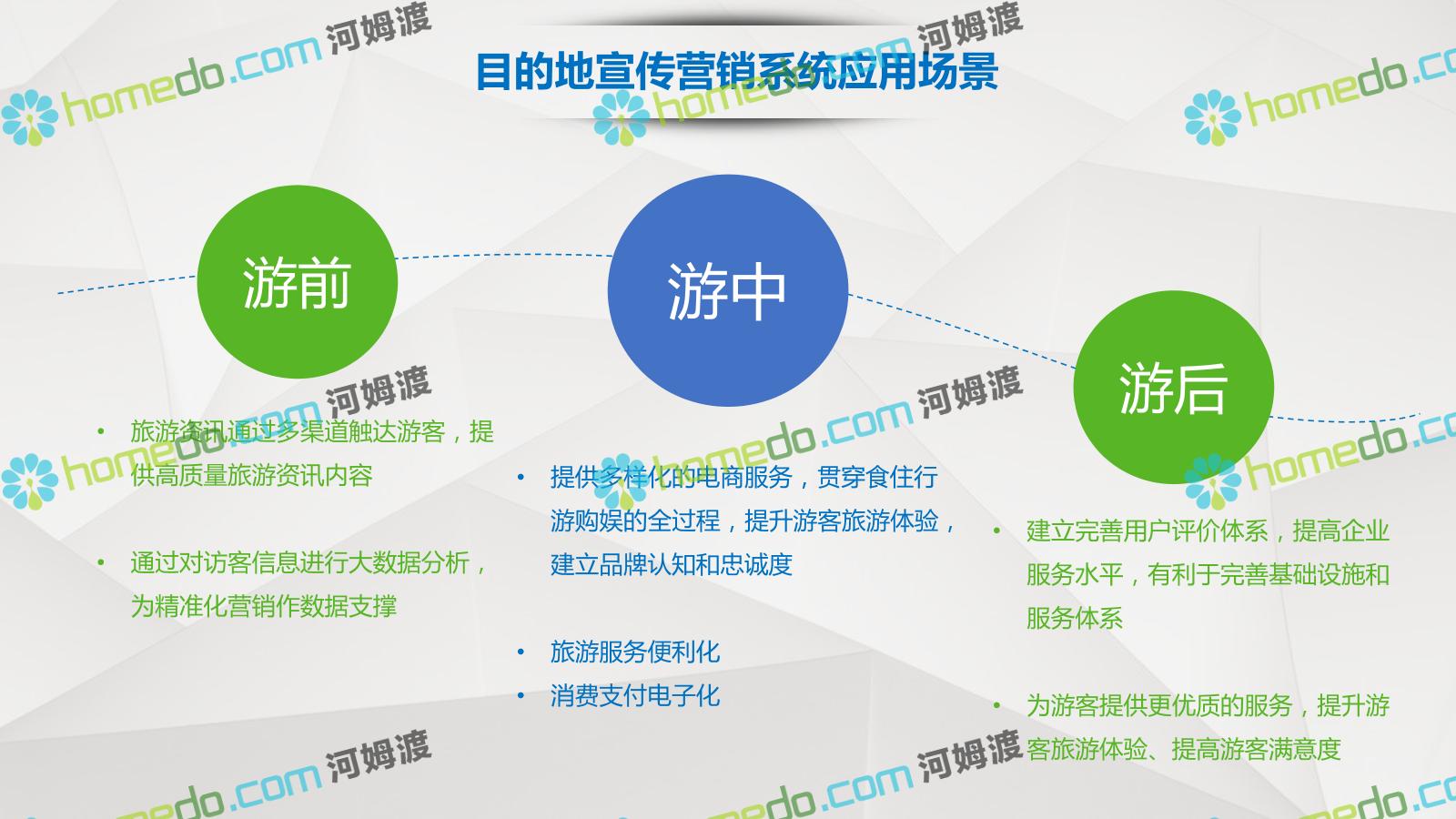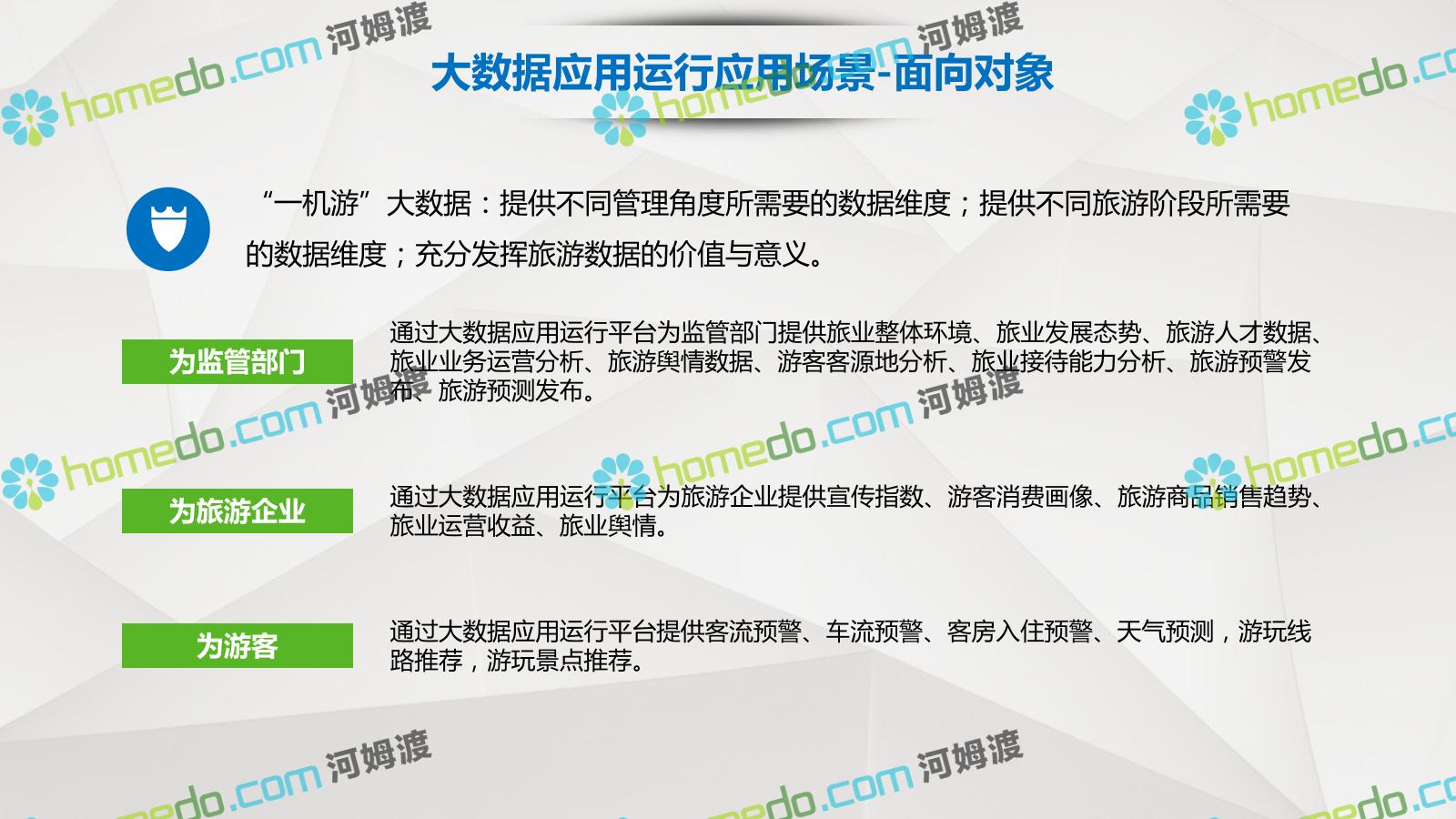 方案简介 互联网+旅游的核心要素是转变观念,实现旅游监管、营销与服务的全面升级。 “智慧旅游”时代,旅游产业监管、旅游品牌建设,旅游服务提升,旅游大数据应用四位一体,相辅相成。