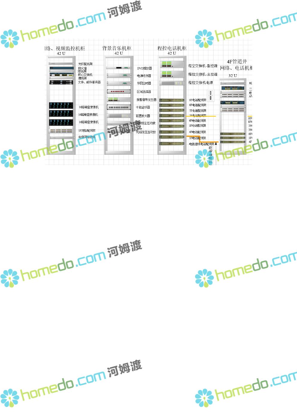 方案简介 汇聚机房内多机柜布置viso版,含视频监控机柜、音频广播机柜、电话及网络机柜等