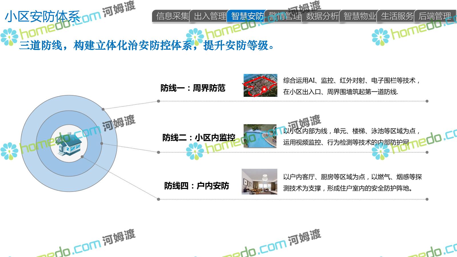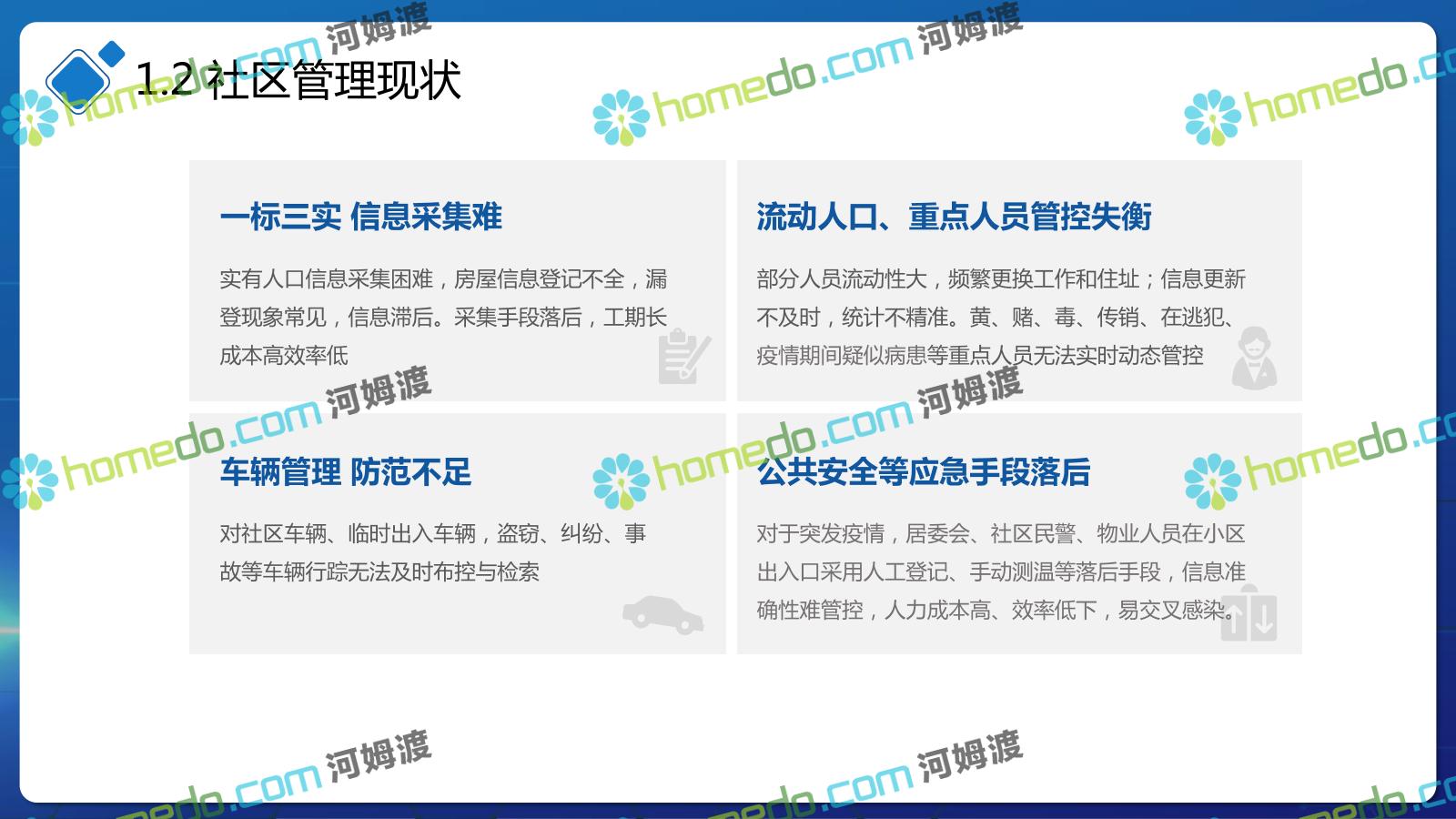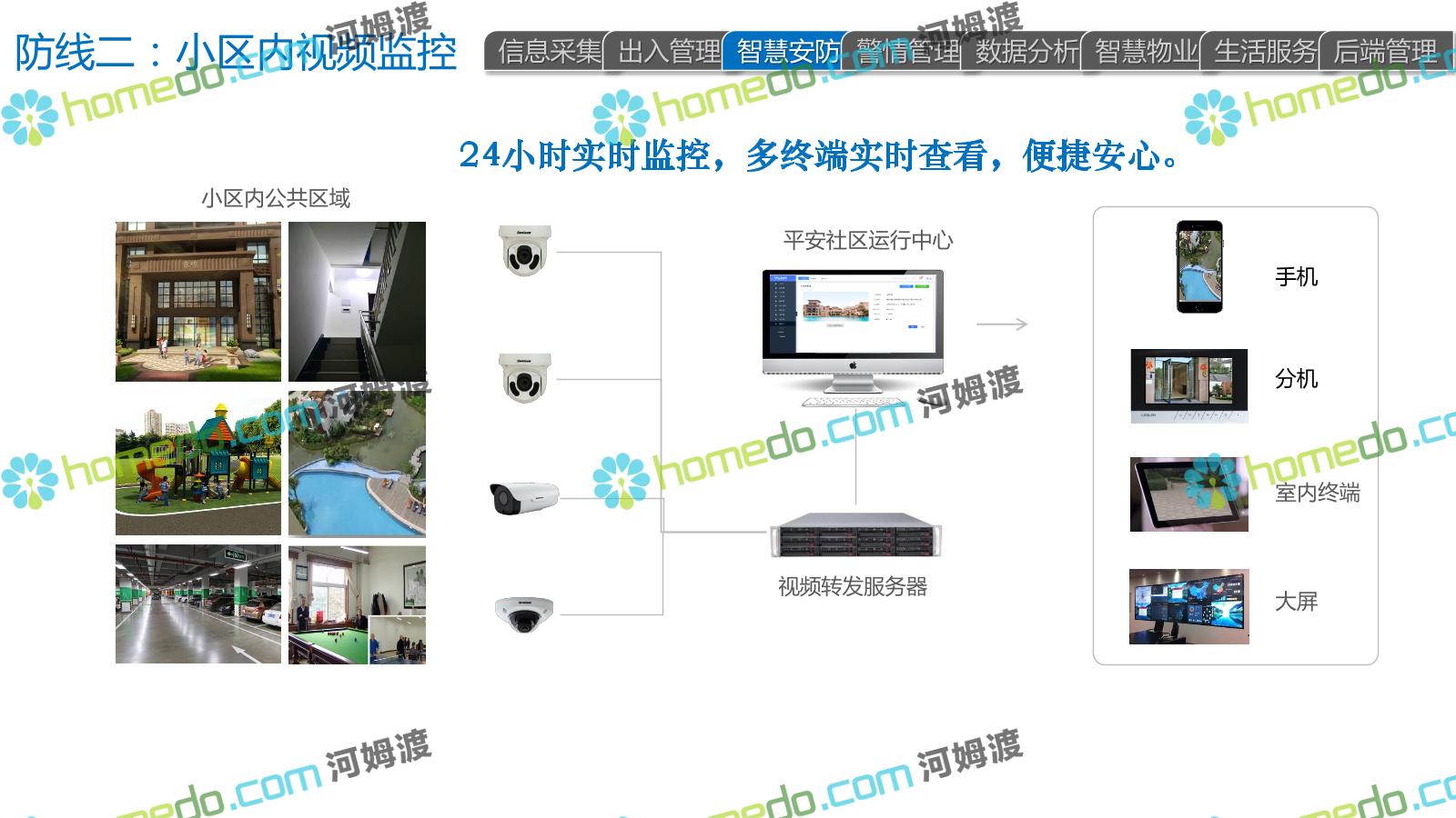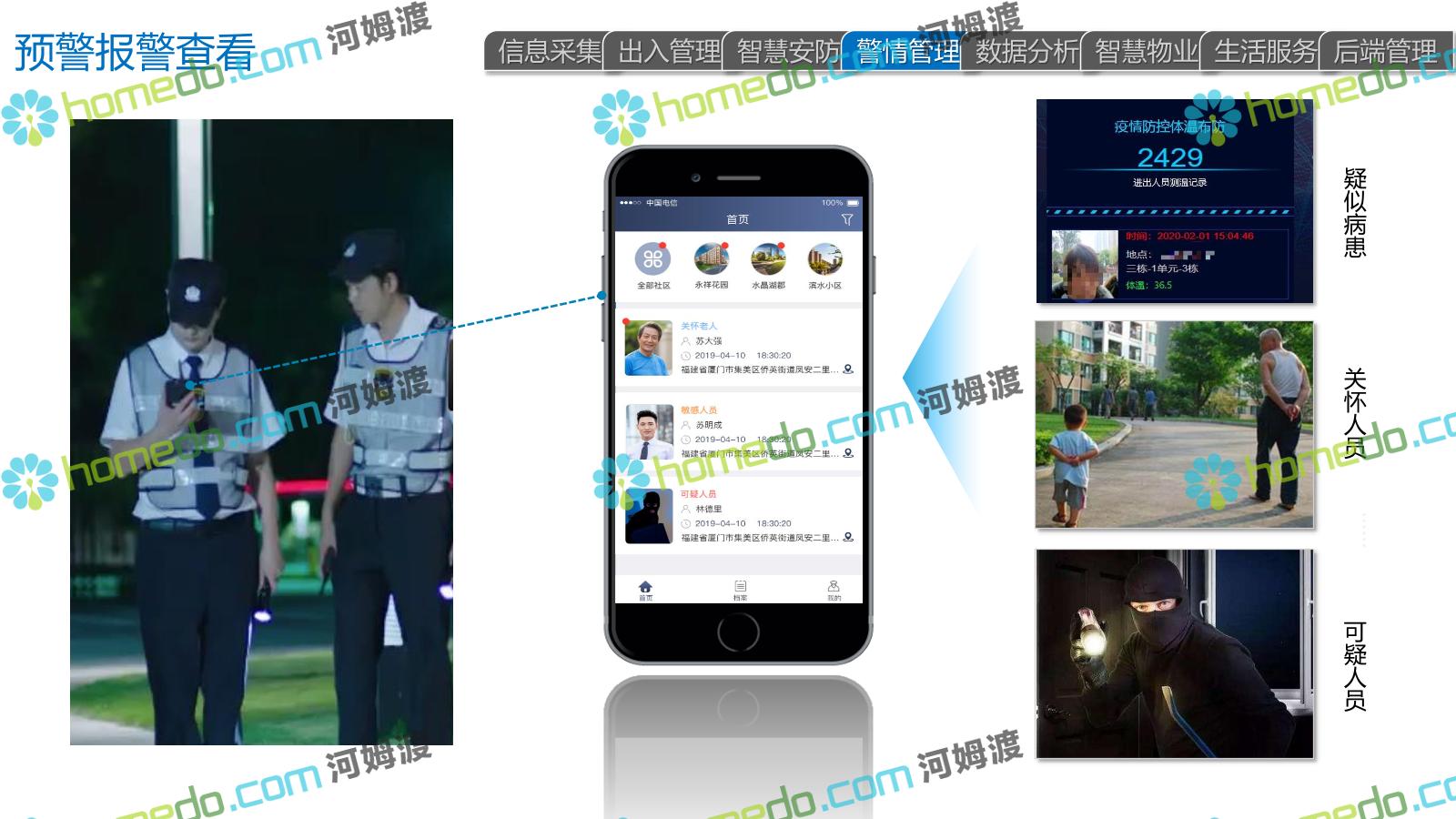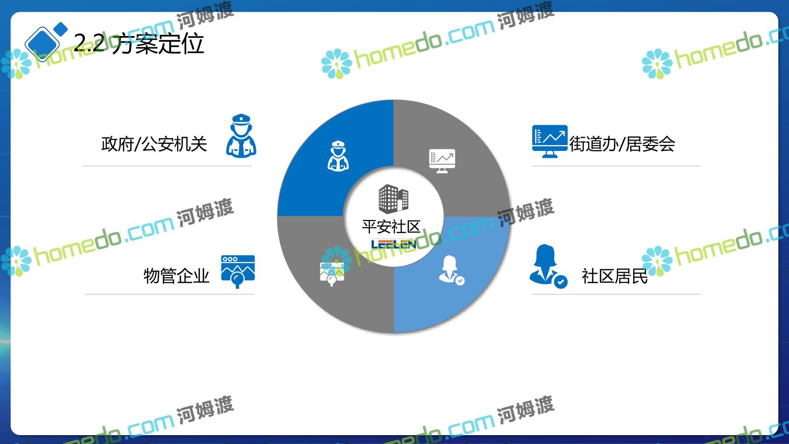 方案简介 方案采用“云-边-端”架构,从治安防控、社区管理、服务民生三个维度出发,以一标三实信息采集为基础,人房车管理和居民安全为导向,公共卫生与安全应急管理为常态 运用云计算、物联网、移动互联网、AI人工智能等技术 融合智能测温门禁、人车卡口、视频监控、物业管理等系统,实现人房车的精细化管理,流口与重点人员管控 街道办、社区民警与小区物业联动共治,全面提高社区技防水平 系统可对接政府平台,为政府决策提供大数据支撑