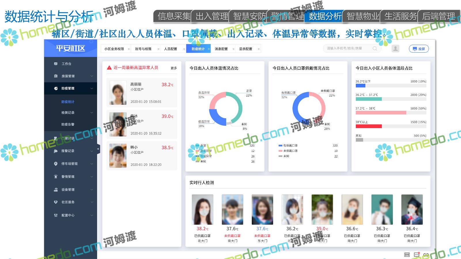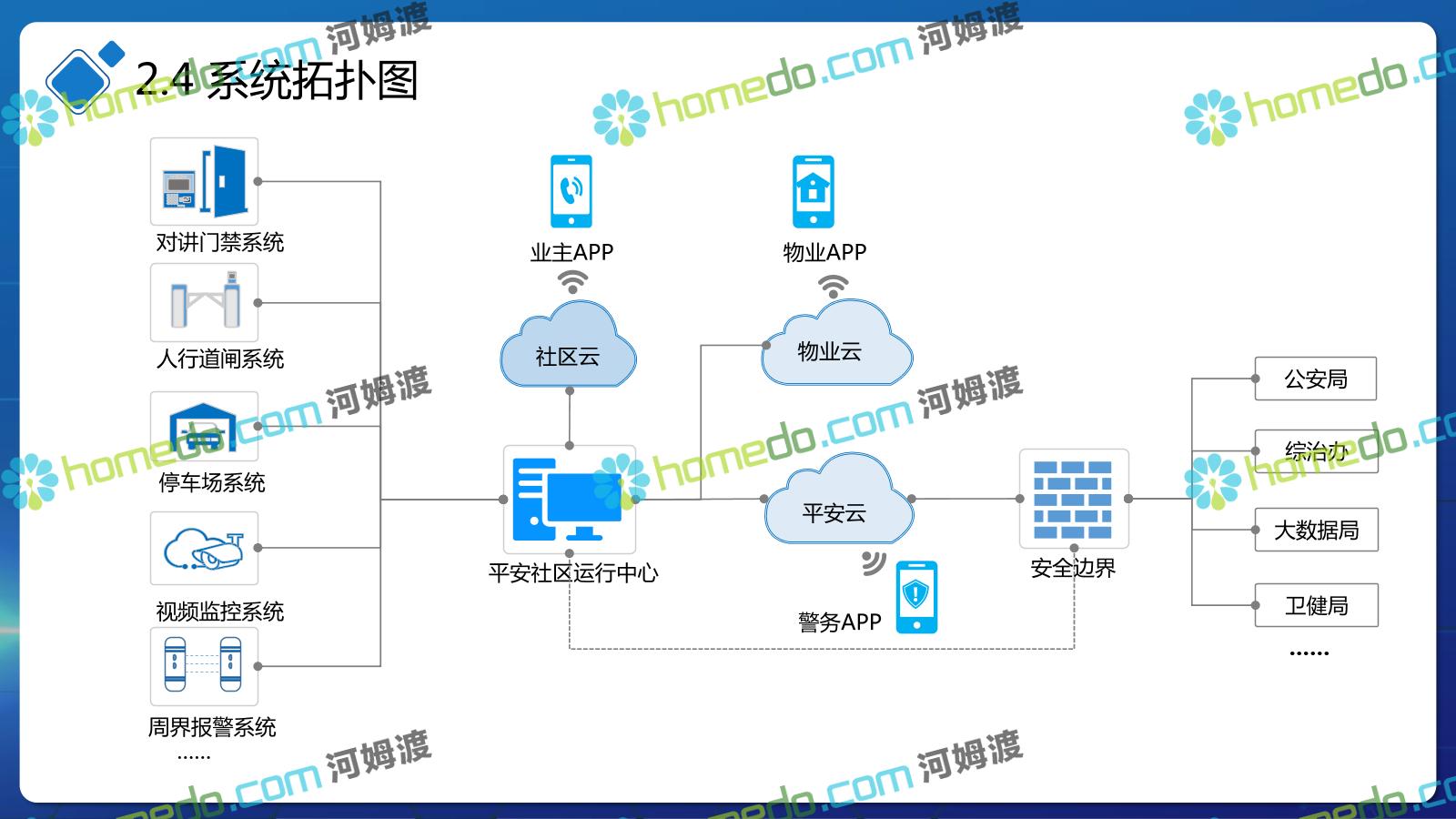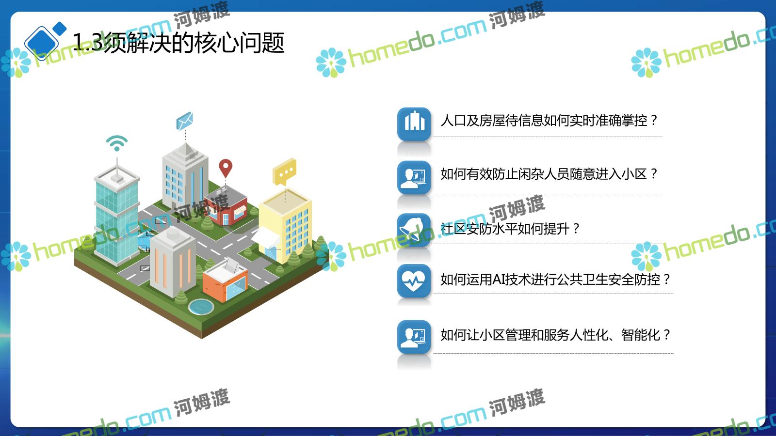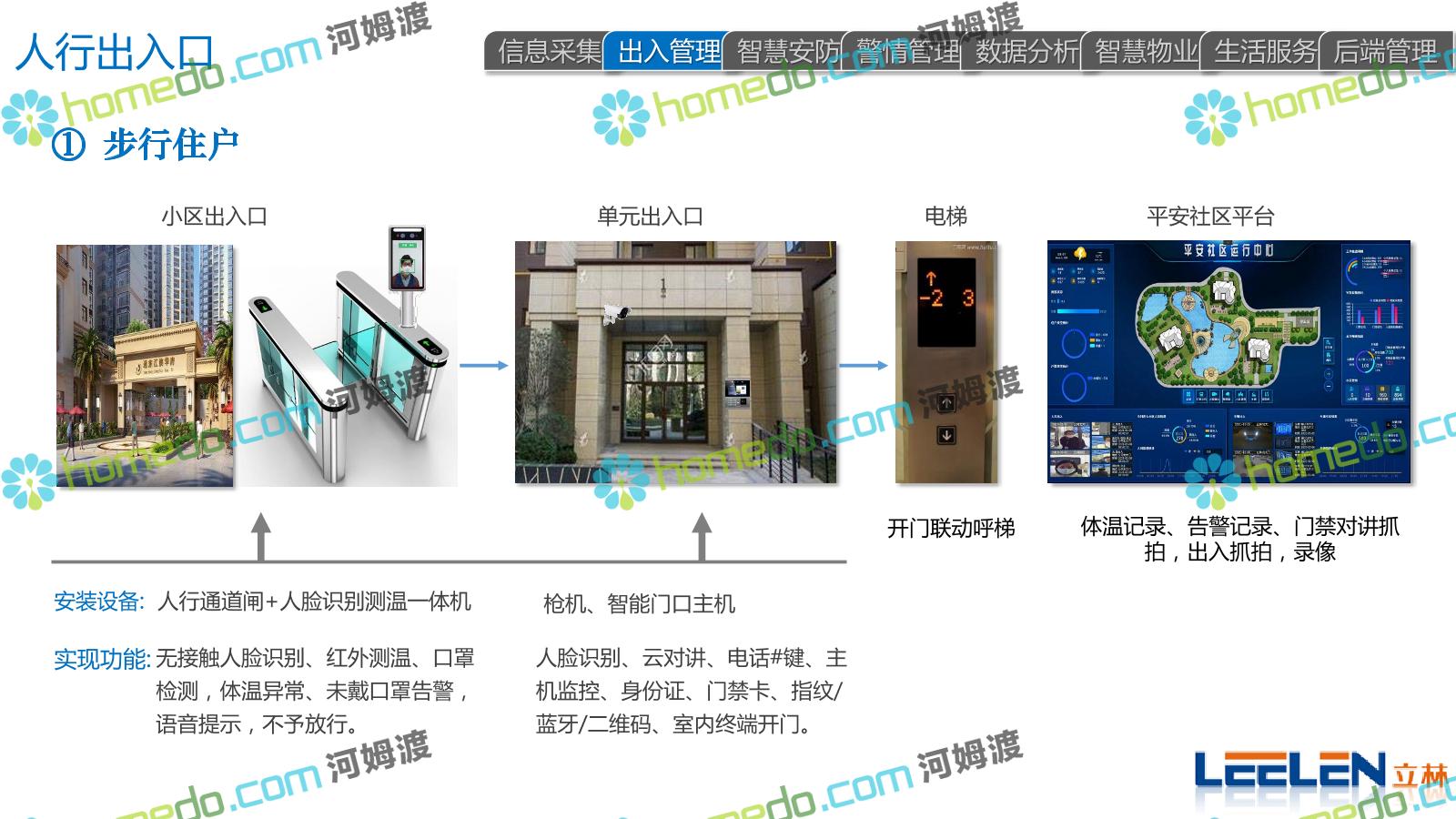 方案简介 方案采用“云-边-端”架构,从治安防控、社区管理、服务民生三个维度出发,以一标三实信息采集为基础,人房车管理和居民安全为导向,公共卫生与安全应急管理为常态 运用云计算、物联网、移动互联网、AI人工智能等技术 融合智能测温门禁、人车卡口、视频监控、物业管理等系统,实现人房车的精细化管理,流口与重点人员管控 街道办、社区民警与小区物业联动共治,全面提高社区技防水平 系统可对接政府平台,为政府决策提供大数据支撑