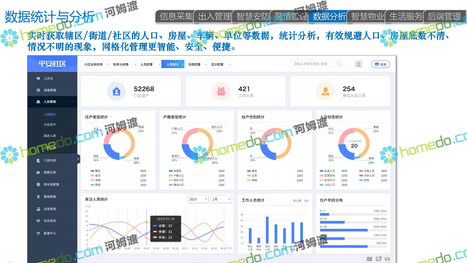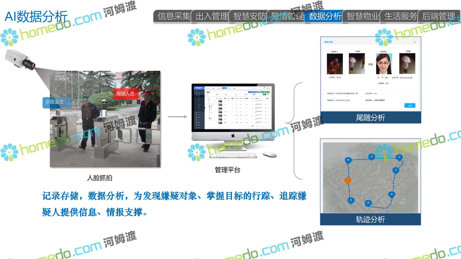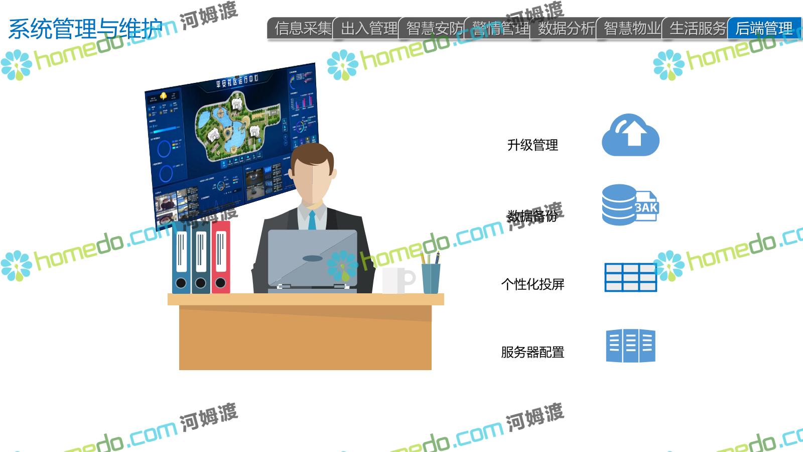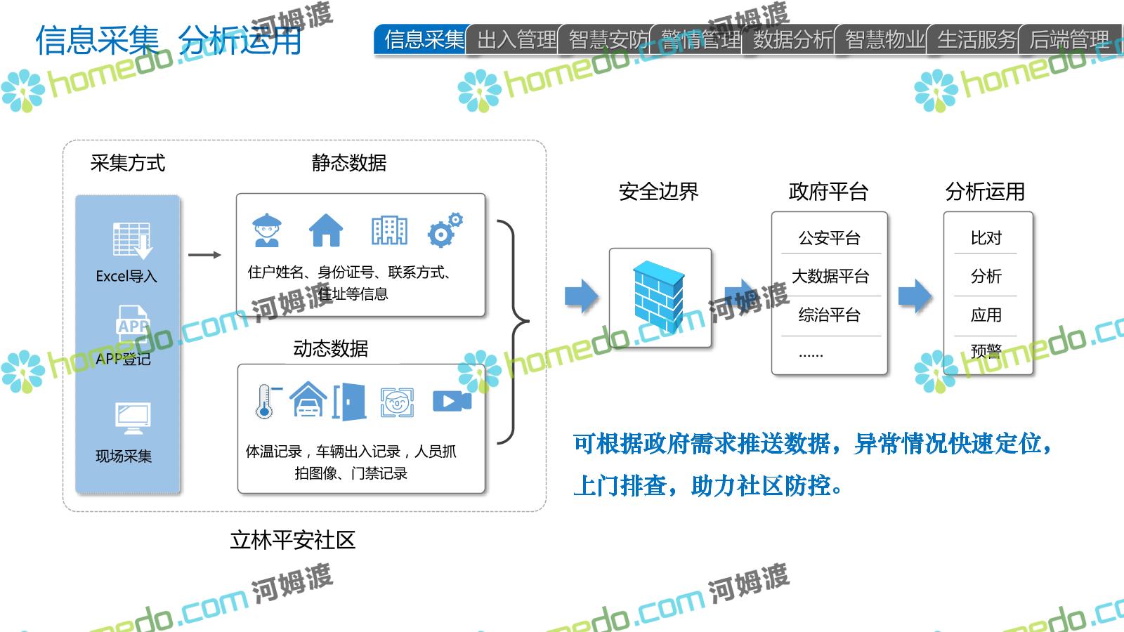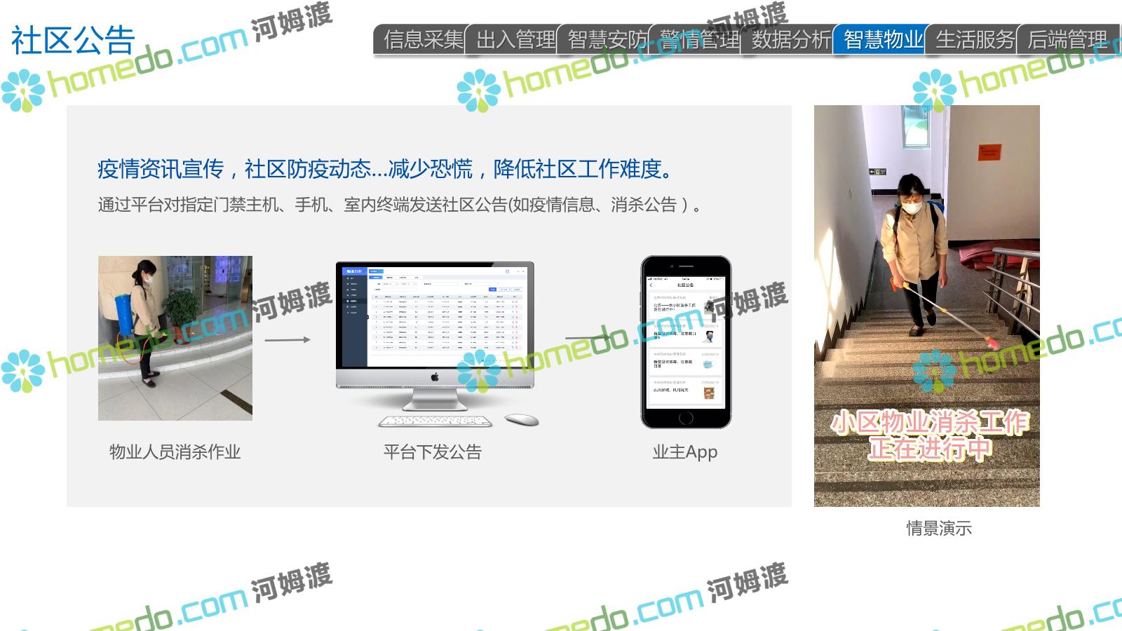 方案简介 方案采用“云-边-端”架构,从治安防控、社区管理、服务民生三个维度出发,以一标三实信息采集为基础,人房车管理和居民安全为导向,公共卫生与安全应急管理为常态 运用云计算、物联网、移动互联网、AI人工智能等技术 融合智能测温门禁、人车卡口、视频监控、物业管理等系统,实现人房车的精细化管理,流口与重点人员管控 街道办、社区民警与小区物业联动共治,全面提高社区技防水平 系统可对接政府平台,为政府决策提供大数据支撑