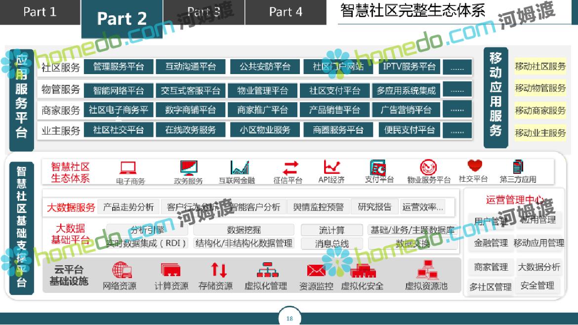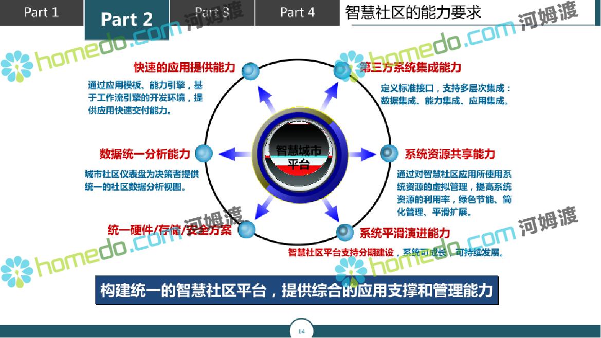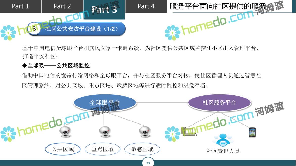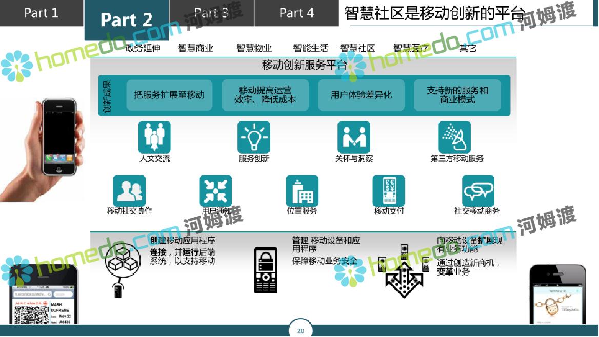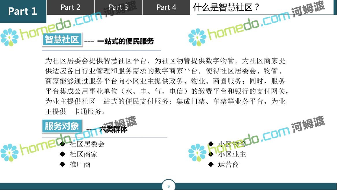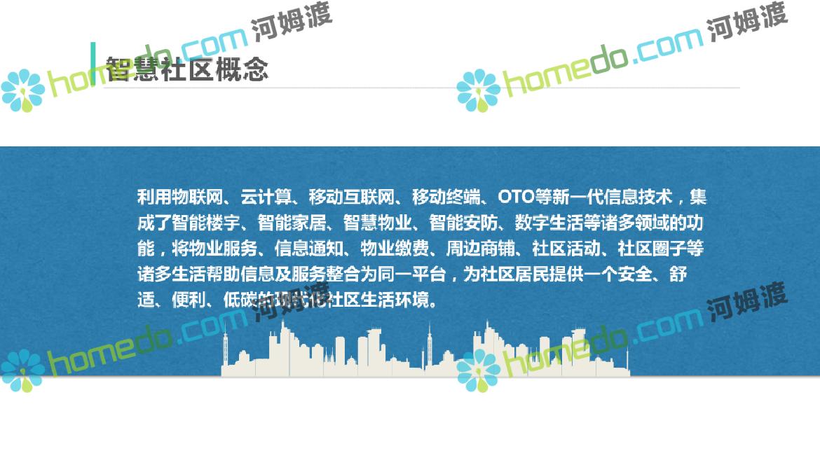 方案简介 利用物联网、云计算、移动互联网、移动终端、OTO等新一代信息技术,集 成了智能楼宇、智能家居、智慧物业、智能安防、数字生活等诸多领域的功 能,将物业服务、信息通知、物业缴费、周边商铺、社区活动、社区圈子等 诸多生活帮助信息及服务整合为同一平台,为社区居民提供一个安全、舒 适、便利、低碳的现代化社区生活环境。