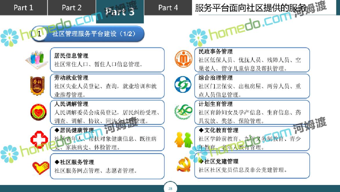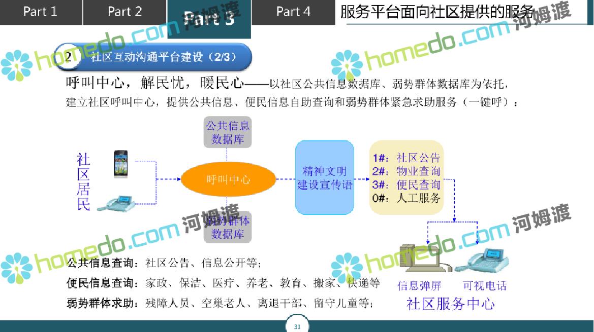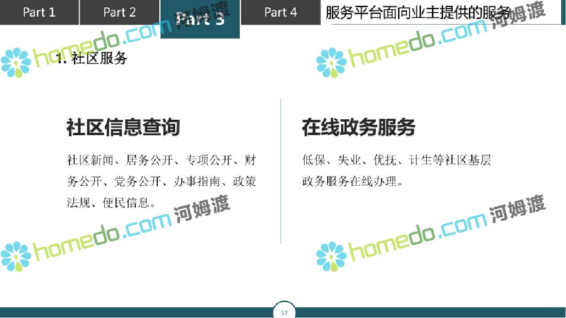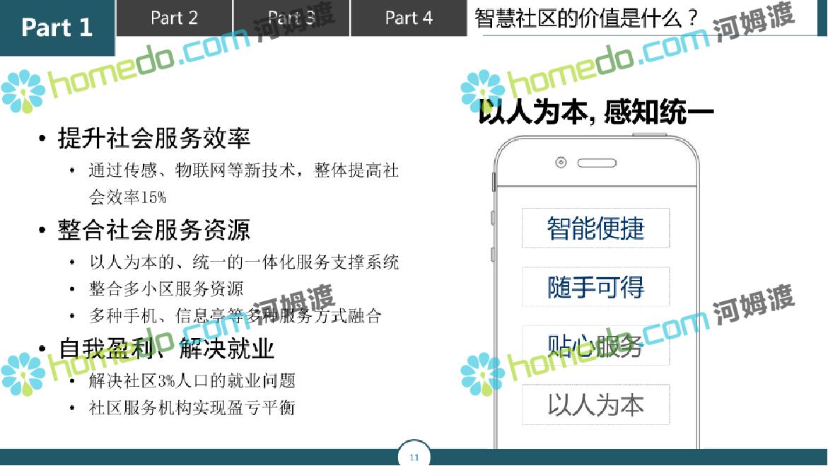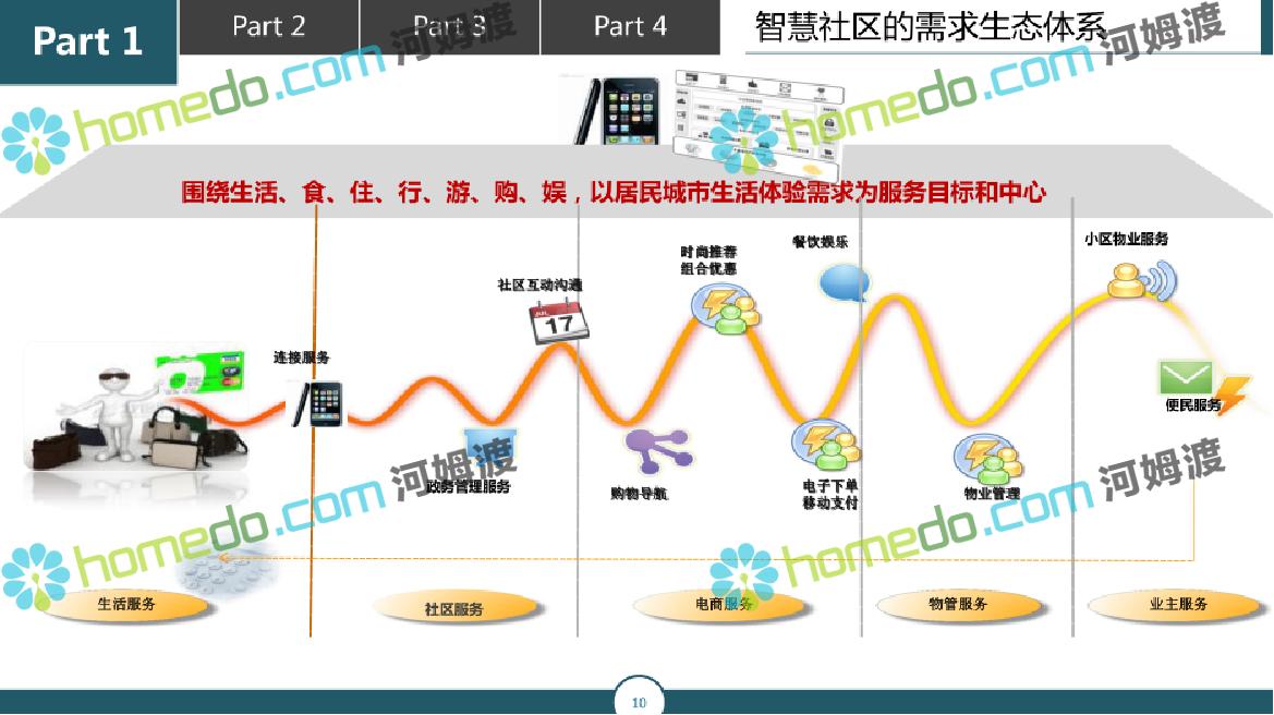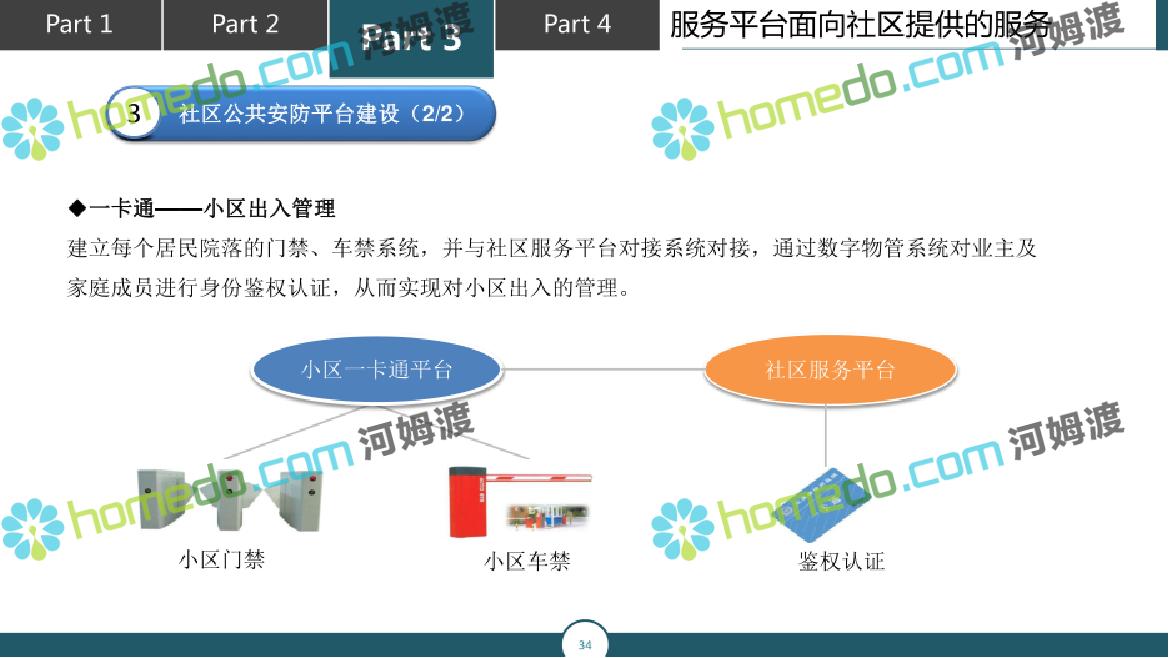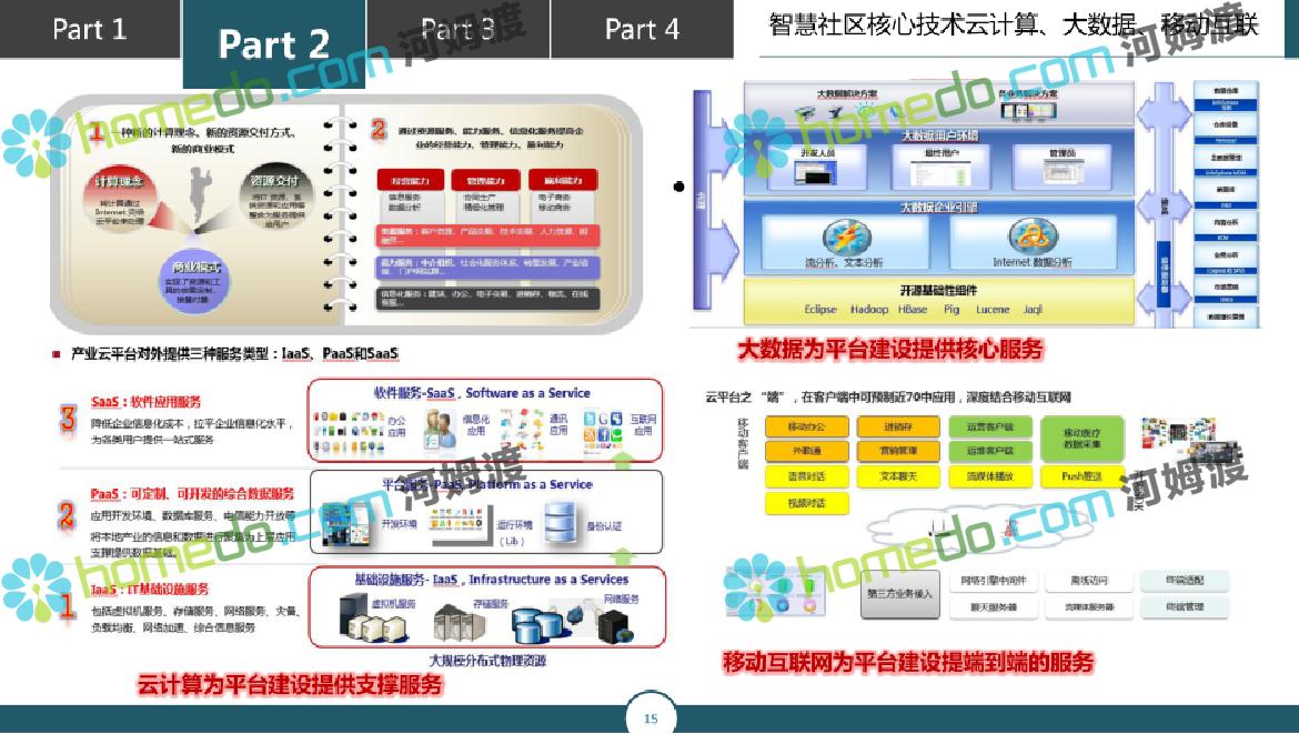 方案简介 利用物联网、云计算、移动互联网、移动终端、OTO等新一代信息技术,集 成了智能楼宇、智能家居、智慧物业、智能安防、数字生活等诸多领域的功 能,将物业服务、信息通知、物业缴费、周边商铺、社区活动、社区圈子等 诸多生活帮助信息及服务整合为同一平台,为社区居民提供一个安全、舒 适、便利、低碳的现代化社区生活环境。