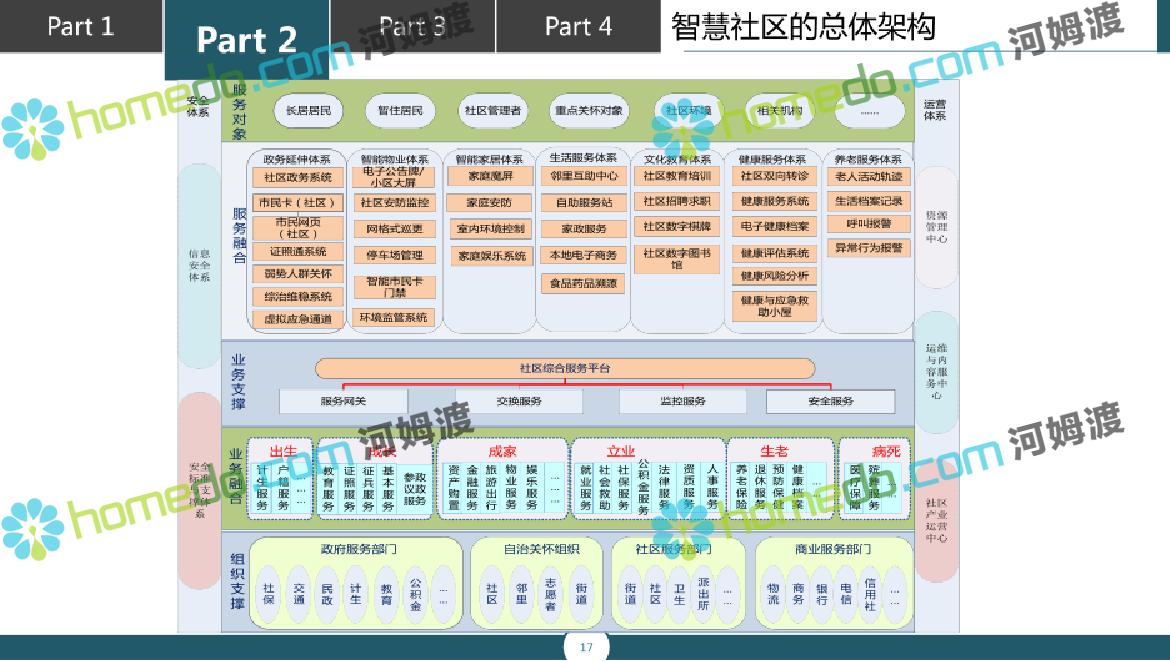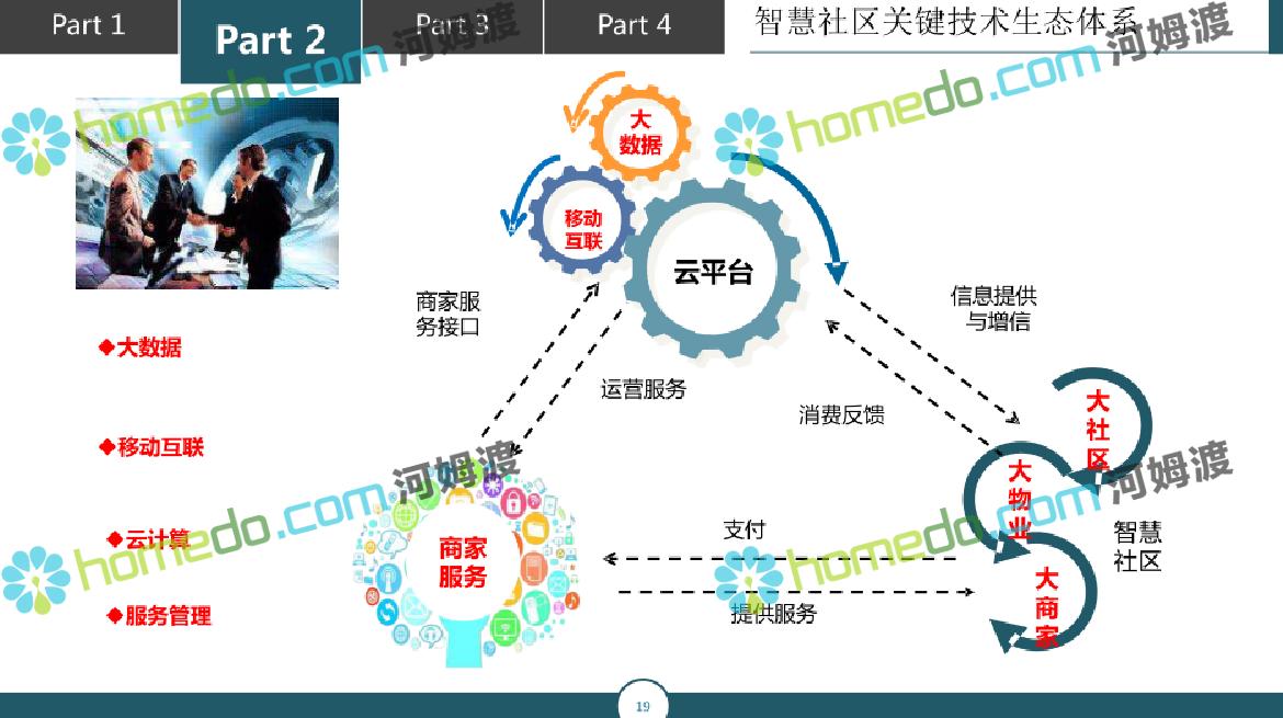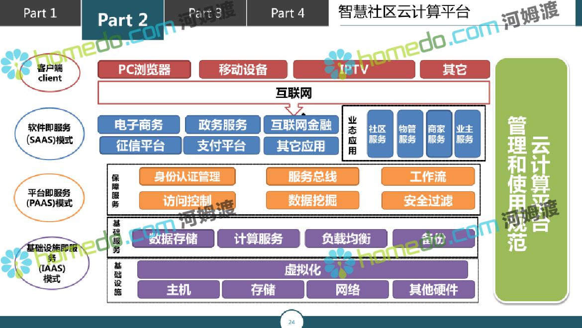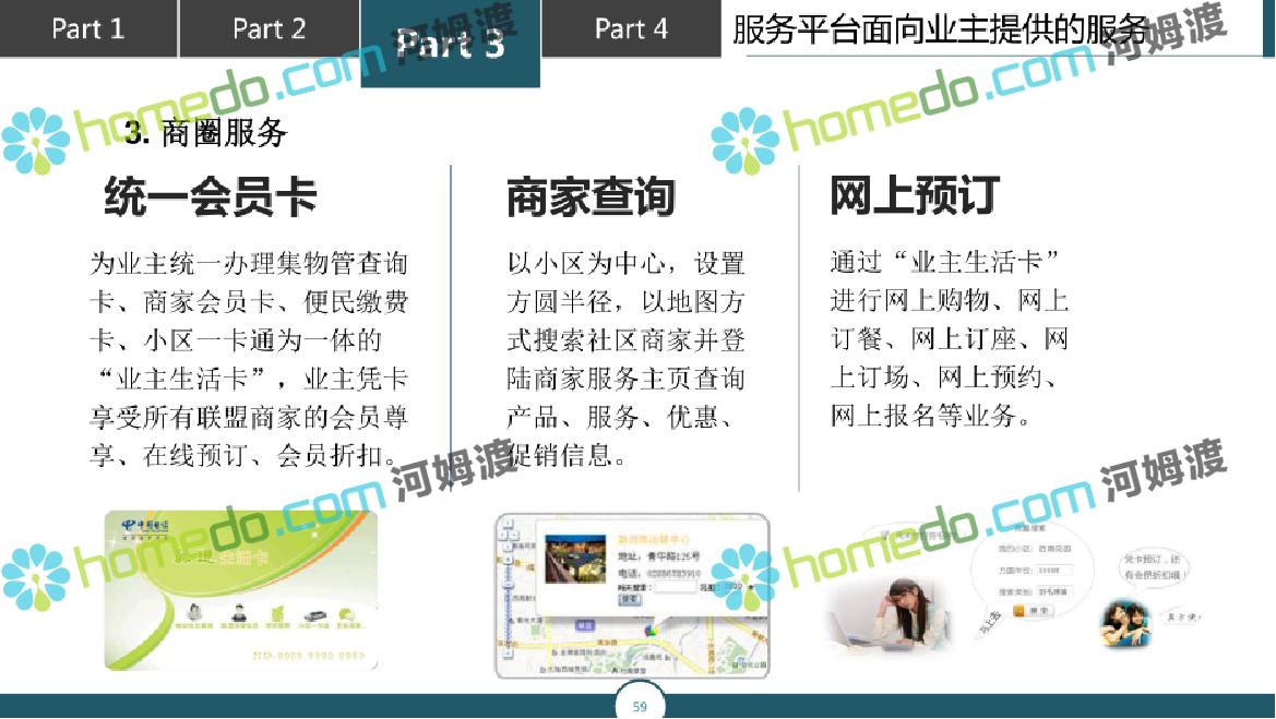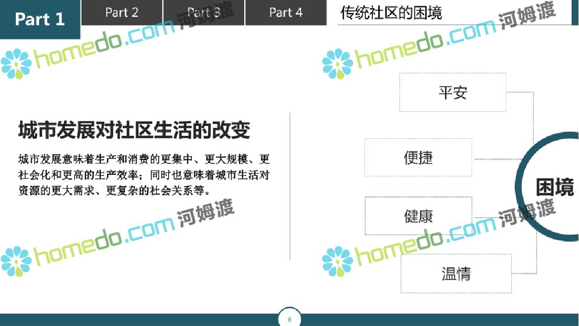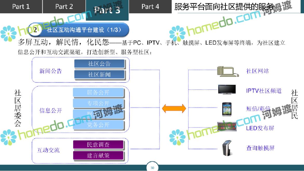 方案简介 利用物联网、云计算、移动互联网、移动终端、OTO等新一代信息技术,集 成了智能楼宇、智能家居、智慧物业、智能安防、数字生活等诸多领域的功 能,将物业服务、信息通知、物业缴费、周边商铺、社区活动、社区圈子等 诸多生活帮助信息及服务整合为同一平台,为社区居民提供一个安全、舒 适、便利、低碳的现代化社区生活环境。