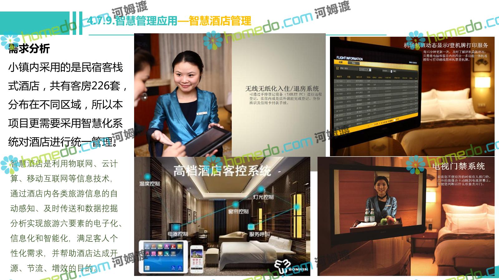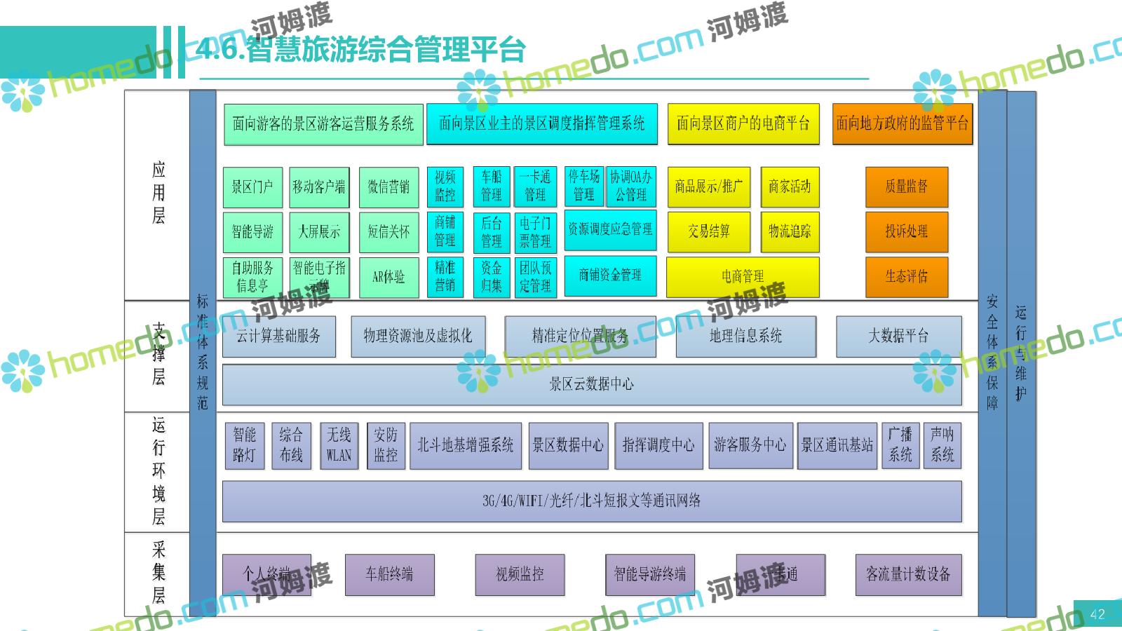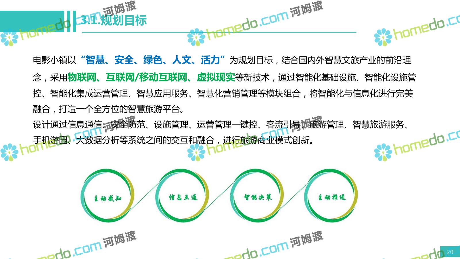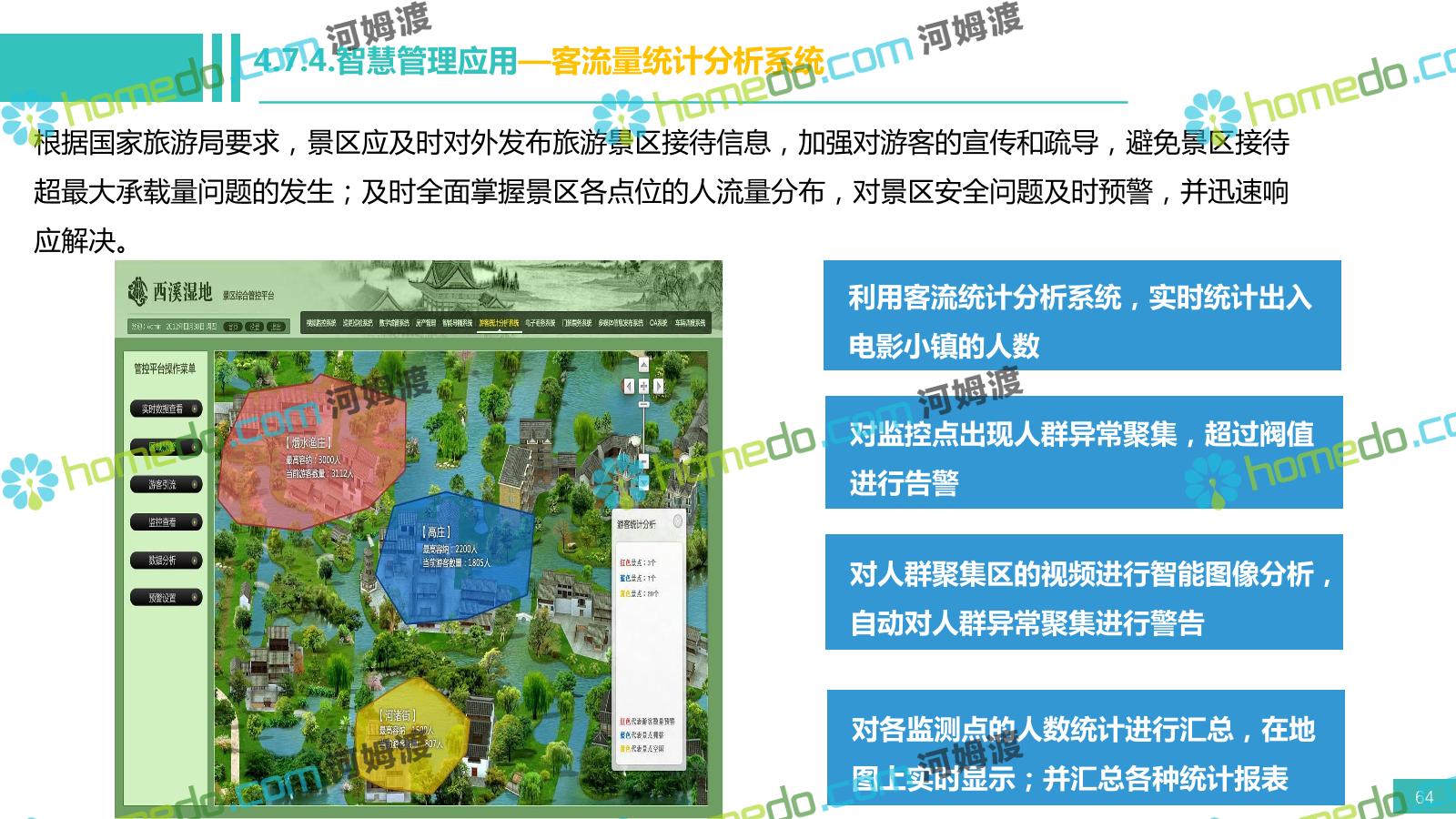 方案简介 电影小镇以“智慧、安全、绿色、人文、活力”为规划目标,结合国内外智慧文旅产业的前沿理念,采用物联网、互联网/移动互联网、虚拟现实等新技术,通过智能化基础设施、智能化设施管控、智能化集成运营管理、智慧应用服务、智慧化营销管理等模块组合,将智能化与信息化进行完美融合,打造一个全方位的智慧旅游平台。 设计通过信息通信、安全防范、设施管理、运营管理一键控、客流引导、旅游管理、智慧旅游服务、手机游园、大数据分析等系统之间的交互和融合,进行旅游商业模式创新。