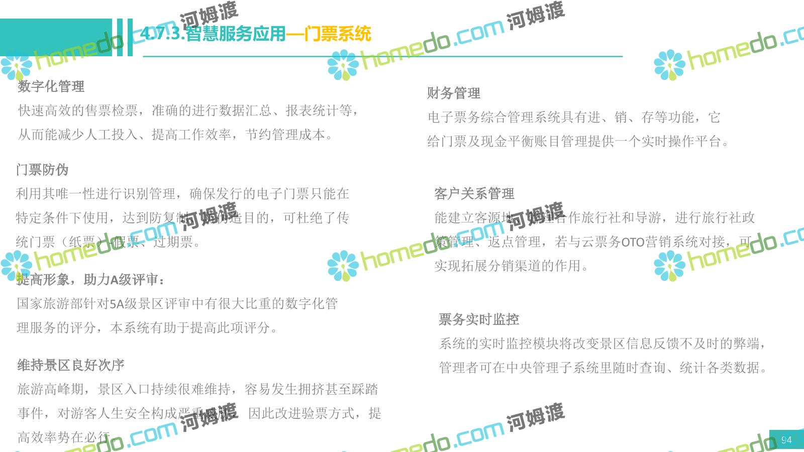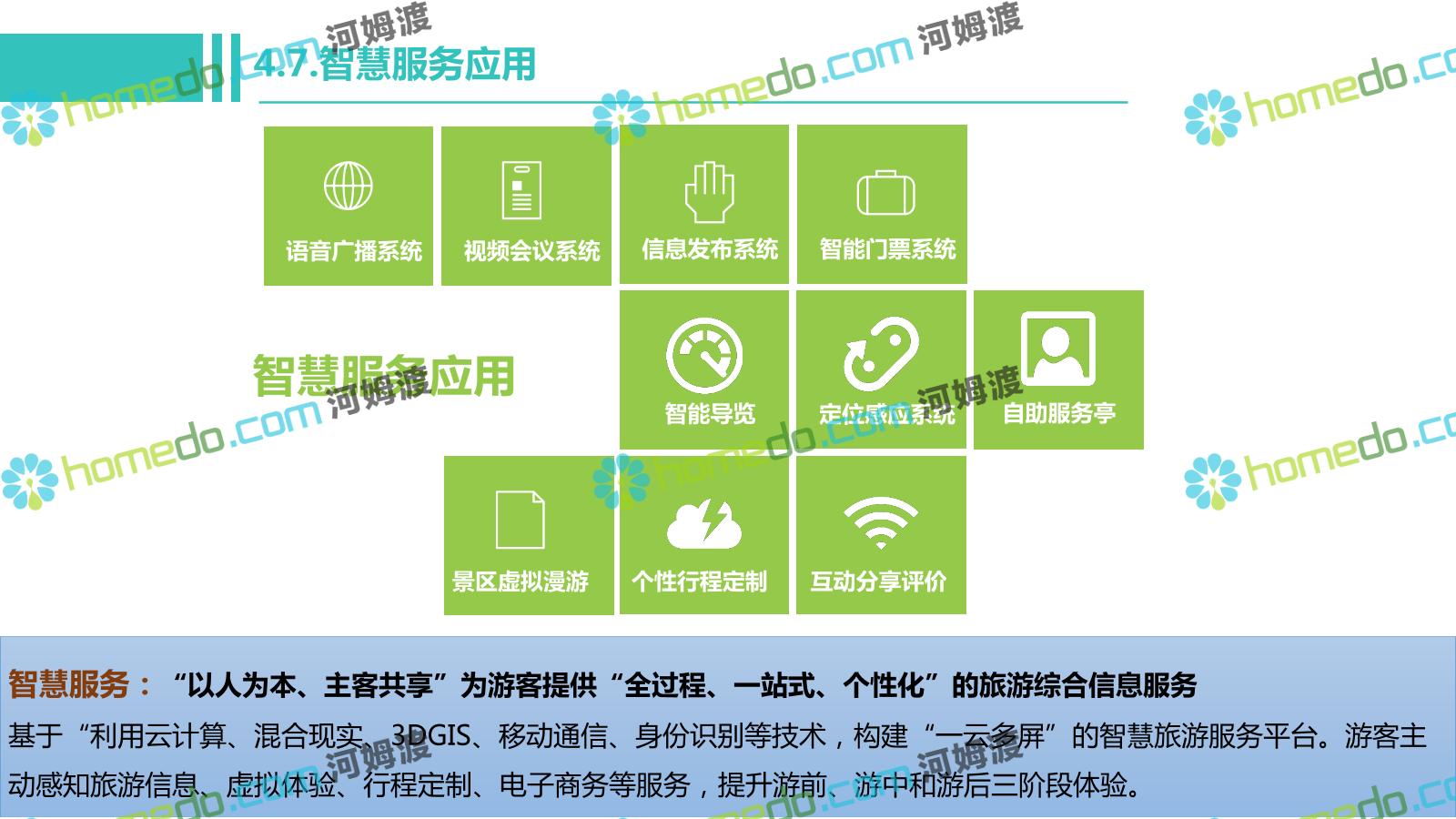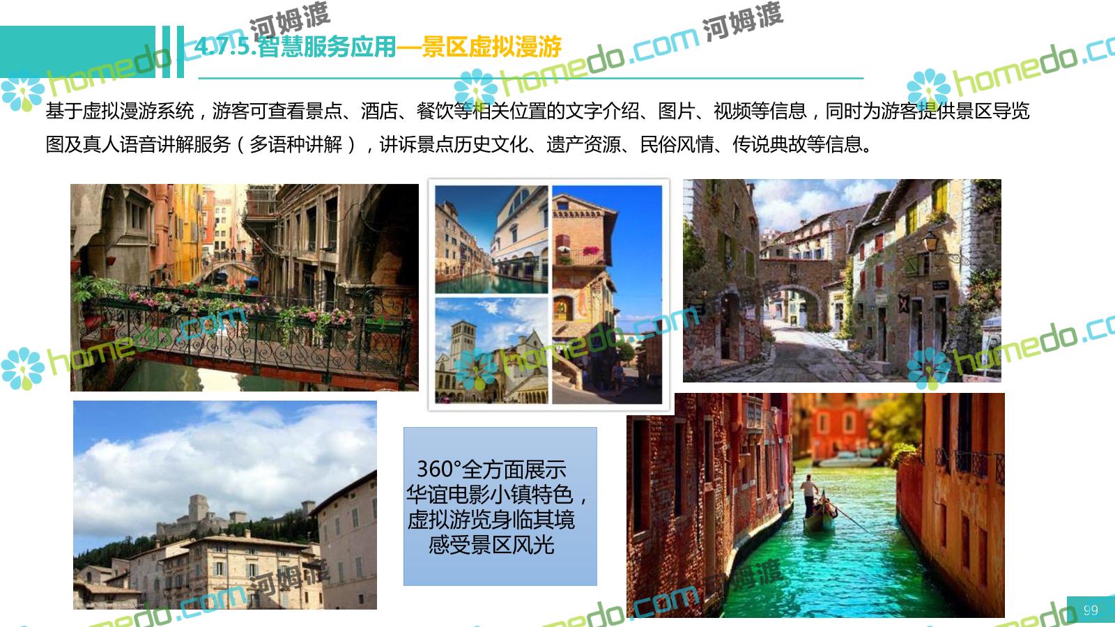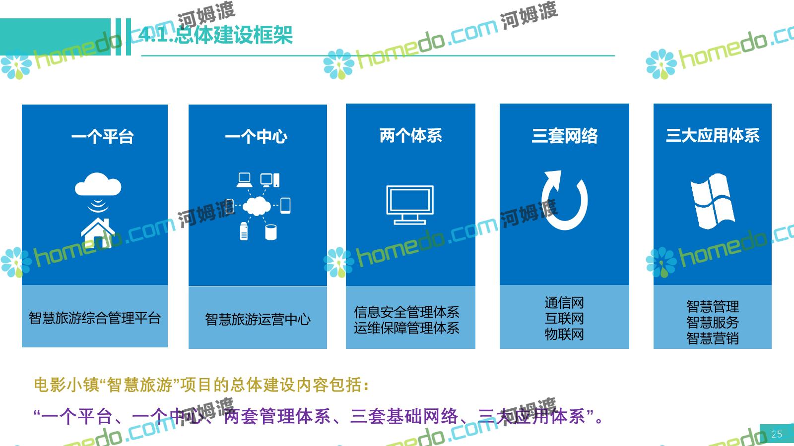 方案简介 电影小镇以“智慧、安全、绿色、人文、活力”为规划目标,结合国内外智慧文旅产业的前沿理念,采用物联网、互联网/移动互联网、虚拟现实等新技术,通过智能化基础设施、智能化设施管控、智能化集成运营管理、智慧应用服务、智慧化营销管理等模块组合,将智能化与信息化进行完美融合,打造一个全方位的智慧旅游平台。 设计通过信息通信、安全防范、设施管理、运营管理一键控、客流引导、旅游管理、智慧旅游服务、手机游园、大数据分析等系统之间的交互和融合,进行旅游商业模式创新。