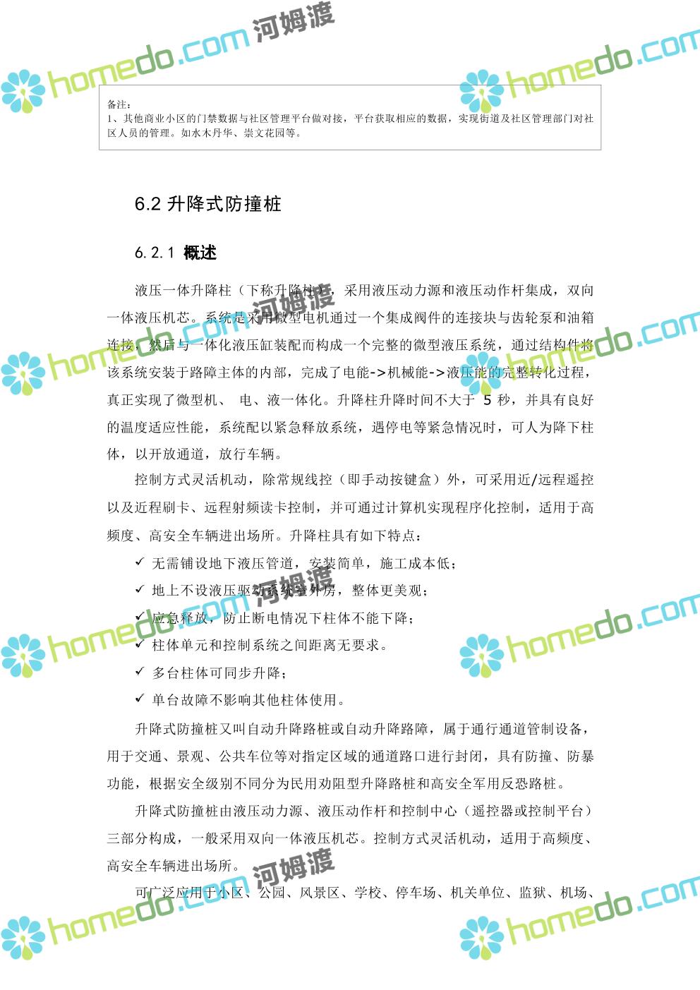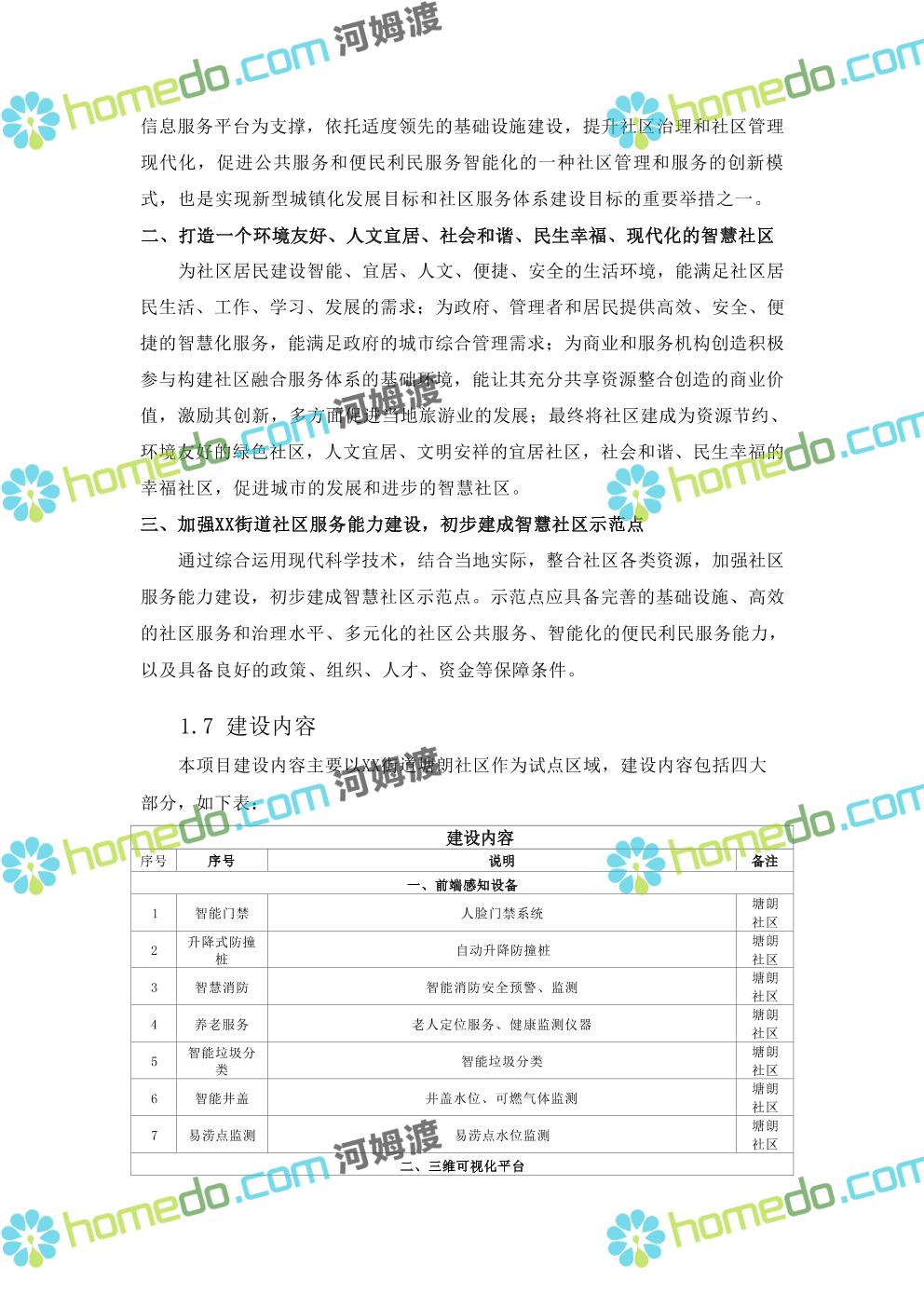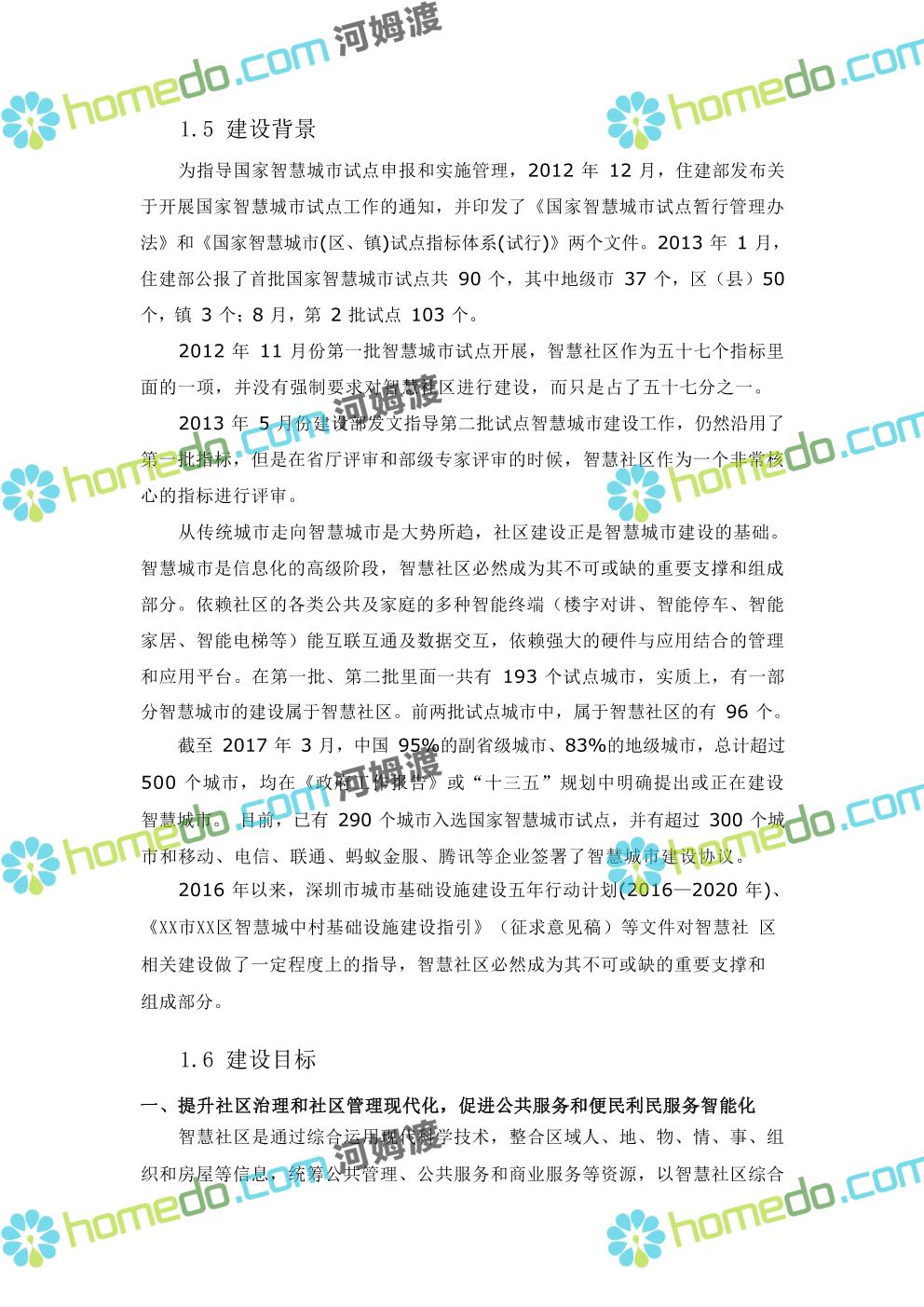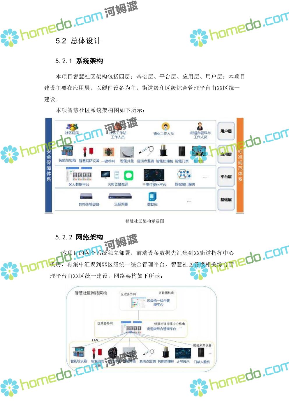 方案简介 本项目智慧社区架构包括四层:基础层、平台层、应用层、用户层;本项目 建设主要在应用层,以硬件设备为主,街道级和区级综合管理平台由XX区统一 建设。