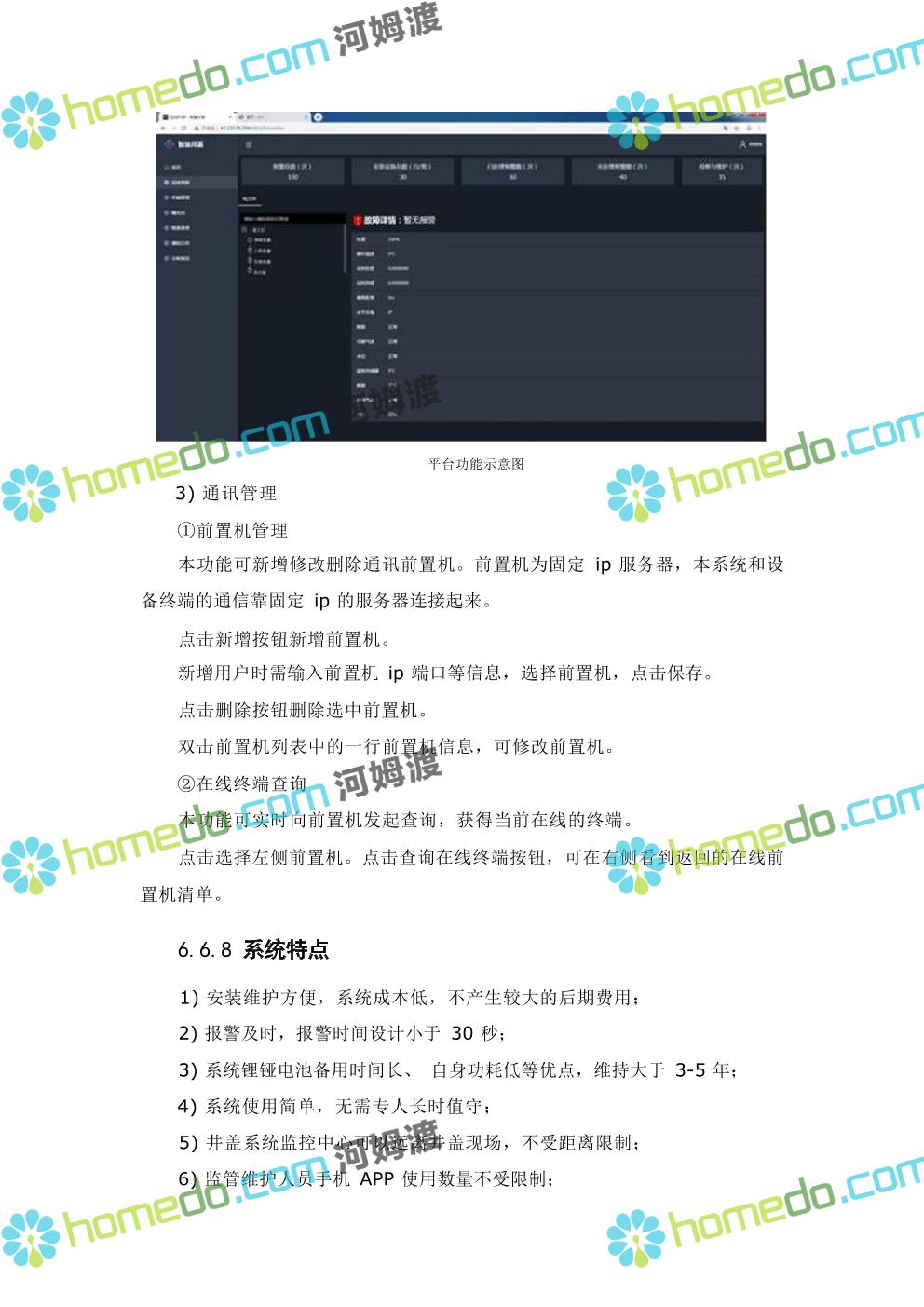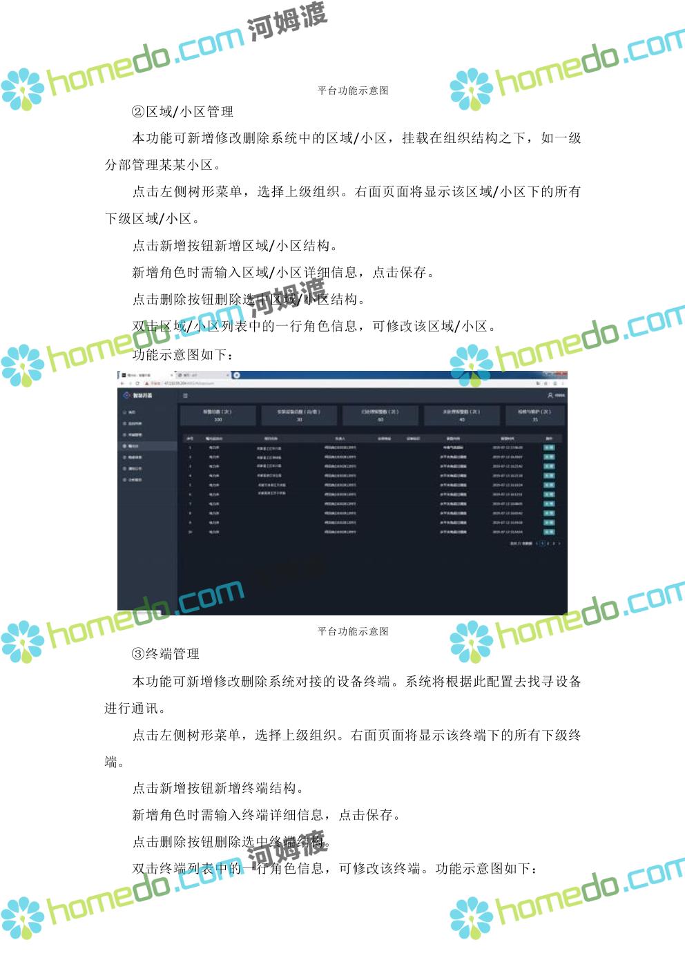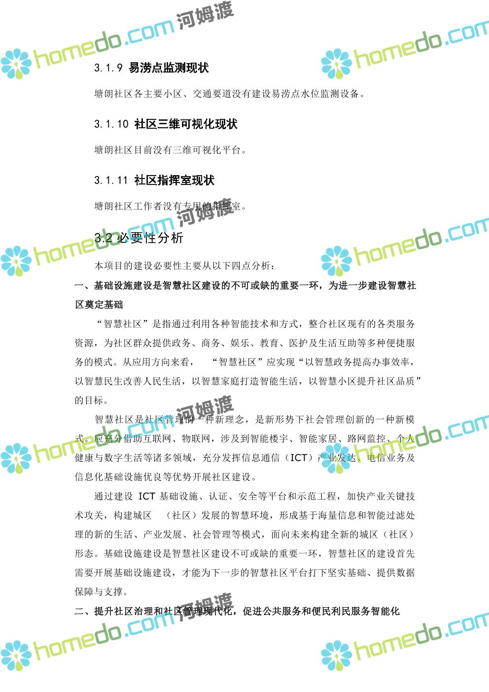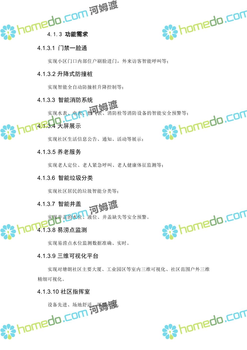 方案简介 本项目智慧社区架构包括四层:基础层、平台层、应用层、用户层;本项目 建设主要在应用层,以硬件设备为主,街道级和区级综合管理平台由XX区统一 建设。