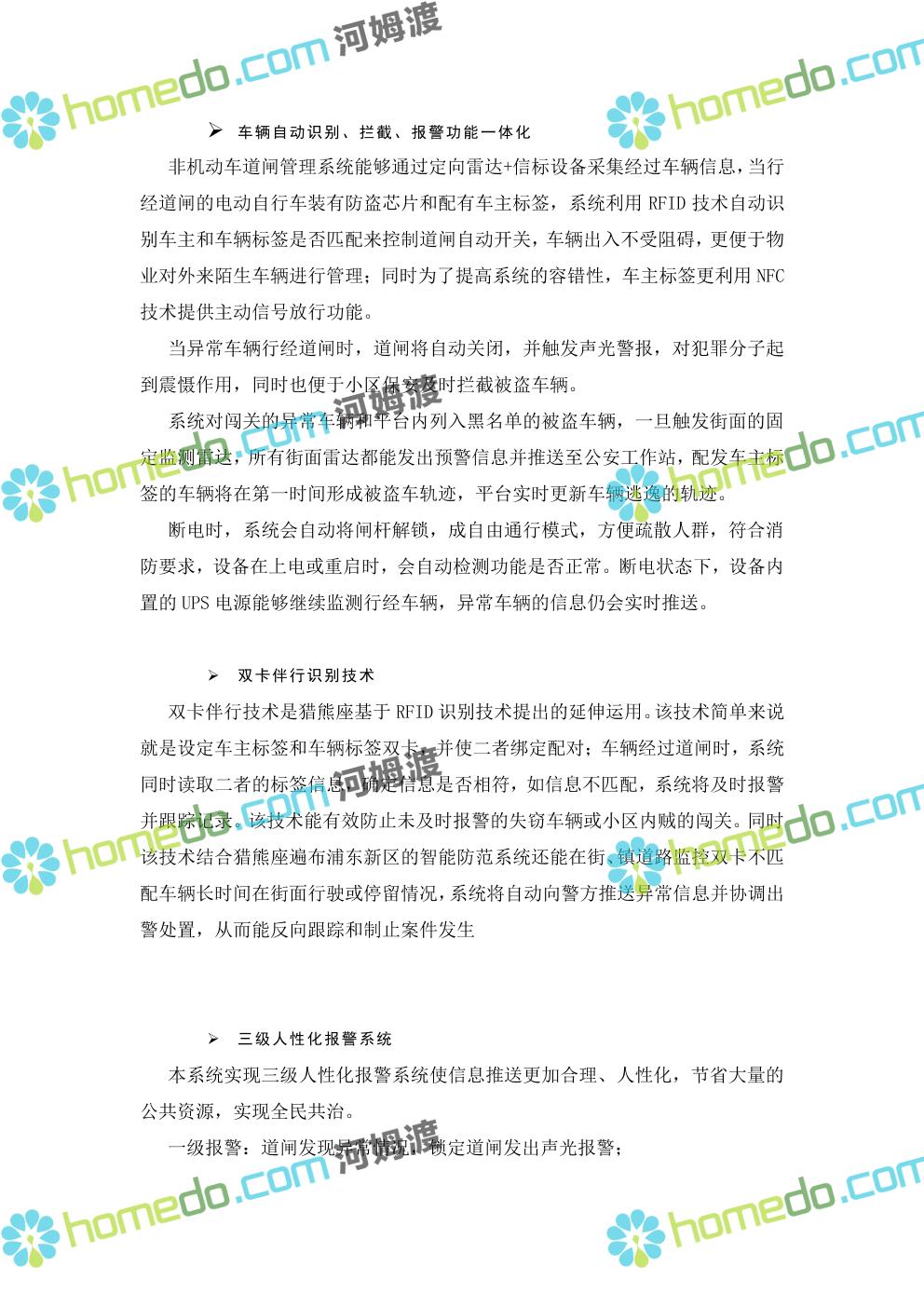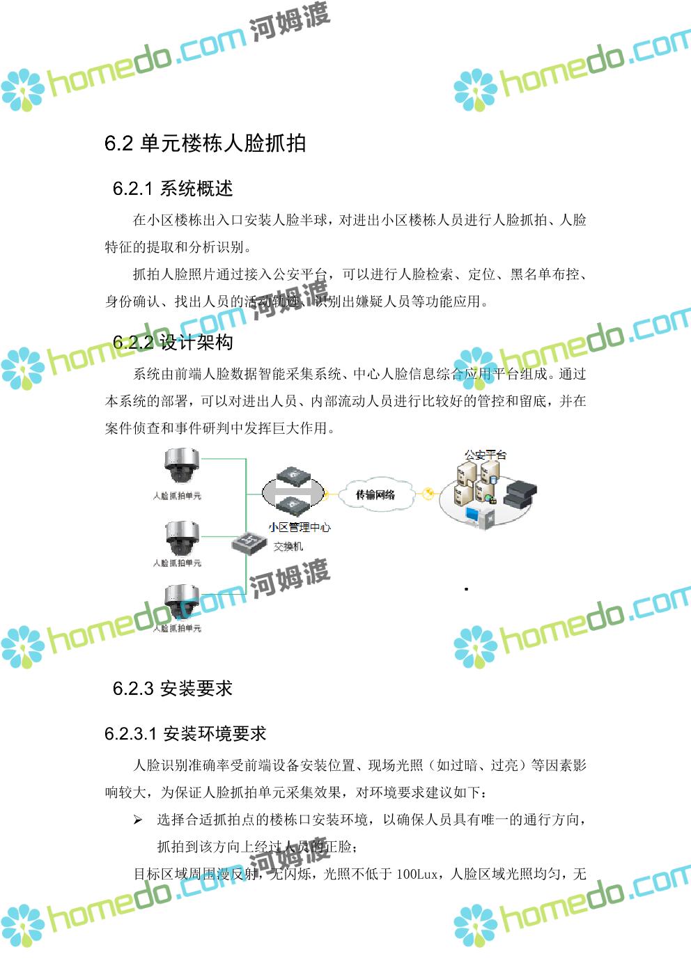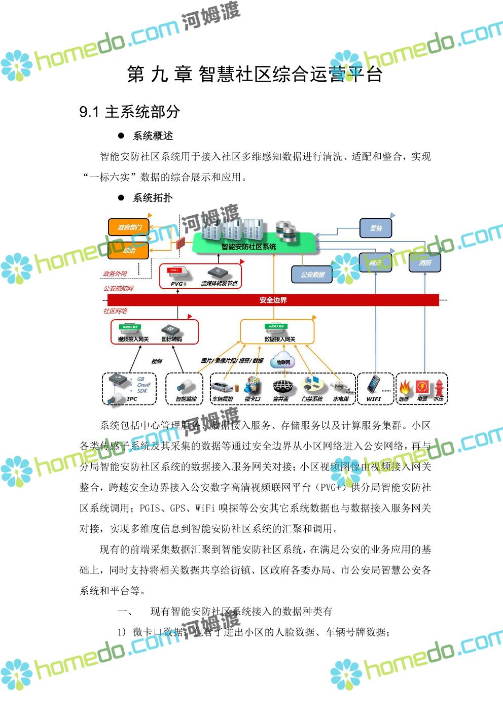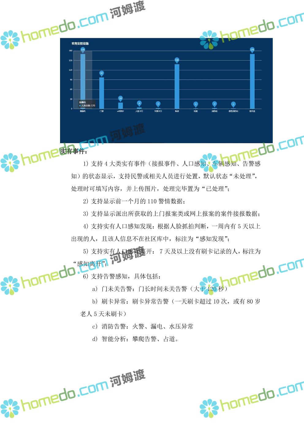方案简介 针对社区环境复杂,人流、车流密集情况,以“高起点、高效率”为原则,以“可视、高效、动态”为目标,做到信息掌握到位、矛盾化解到位、治安防控到位、便民服务到位。通过视频监控系统、门禁系统、车辆卡口系统、社区出入口系统、等,建立起“人防部署到位、物防设施完善、技术手段先进、应急处置高效”的集管理、防范、控制于一体的社区安防保障体系,对各类事件做到预知、预判、预防、预警和有效处置,切实加强社区的安全保障能力和应急响应能力。同时可按公安或综治办等部门要求进行数据对接,解决社区信息采集单一、无法实时与上级部门共享数据等问题,将视频监控系统与报警系统有机结合起来,实现对人员、房屋、车辆信息实时管理和报警联动