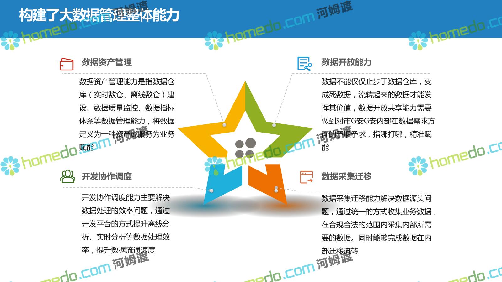 方案简介 聚:推进G安、交通、应急、社保相关数据资源的整合,促进政务数据的对接利用。并逐步推进社会数据、互联网数据等数据的采集与汇聚。 管:构建一站式数据资产可视化管理,通过对数据资产的血缘谱系和信息资源目录的统一管理,实现GA数据的全过程治理与管理,以及各环节的安全与质量监管。 通:实现基于应用场景的数据资源共享与管理机制,推动GA大数据资源的充分共享,让数据为解决交通拥堵、环境保护等各类社会问题赋能,发挥g安大数据资源的价值。 用:整合数据资源并开展数据应用模型及算法研究,探索数据应用于服务模式创新。通过主题库、智能应用等方式推动在公共安全、城市治理、社会管理等领域的广泛深度应用。