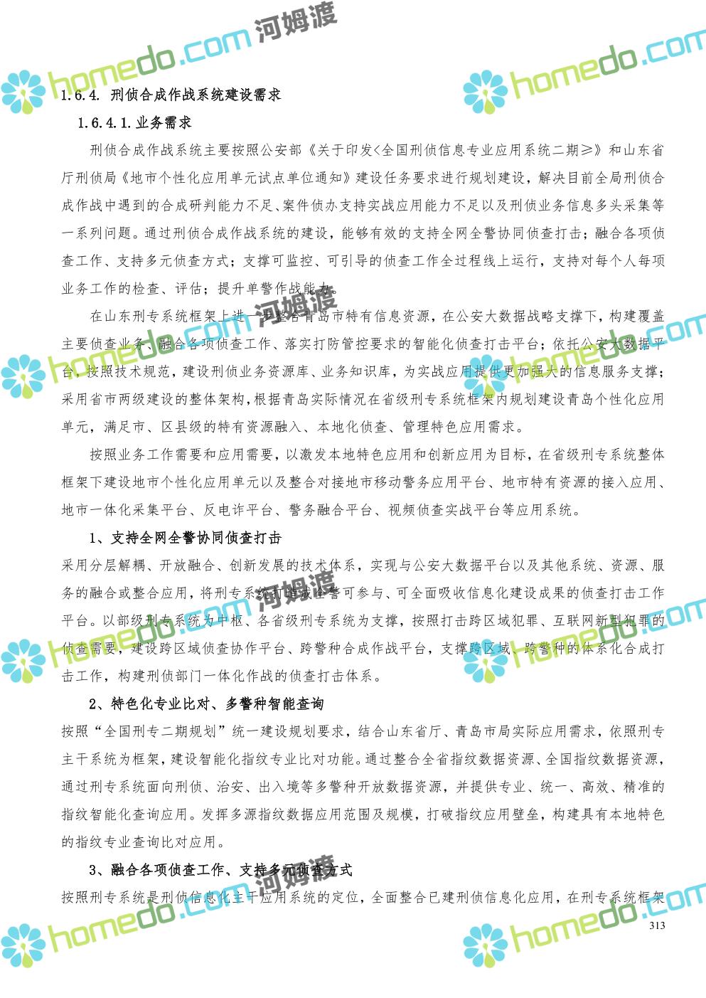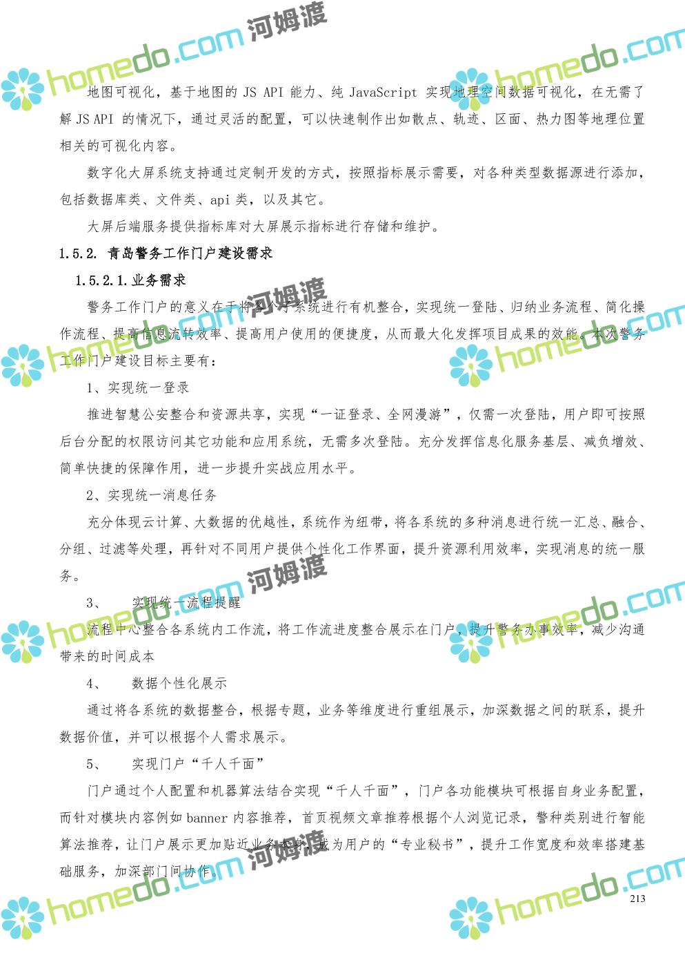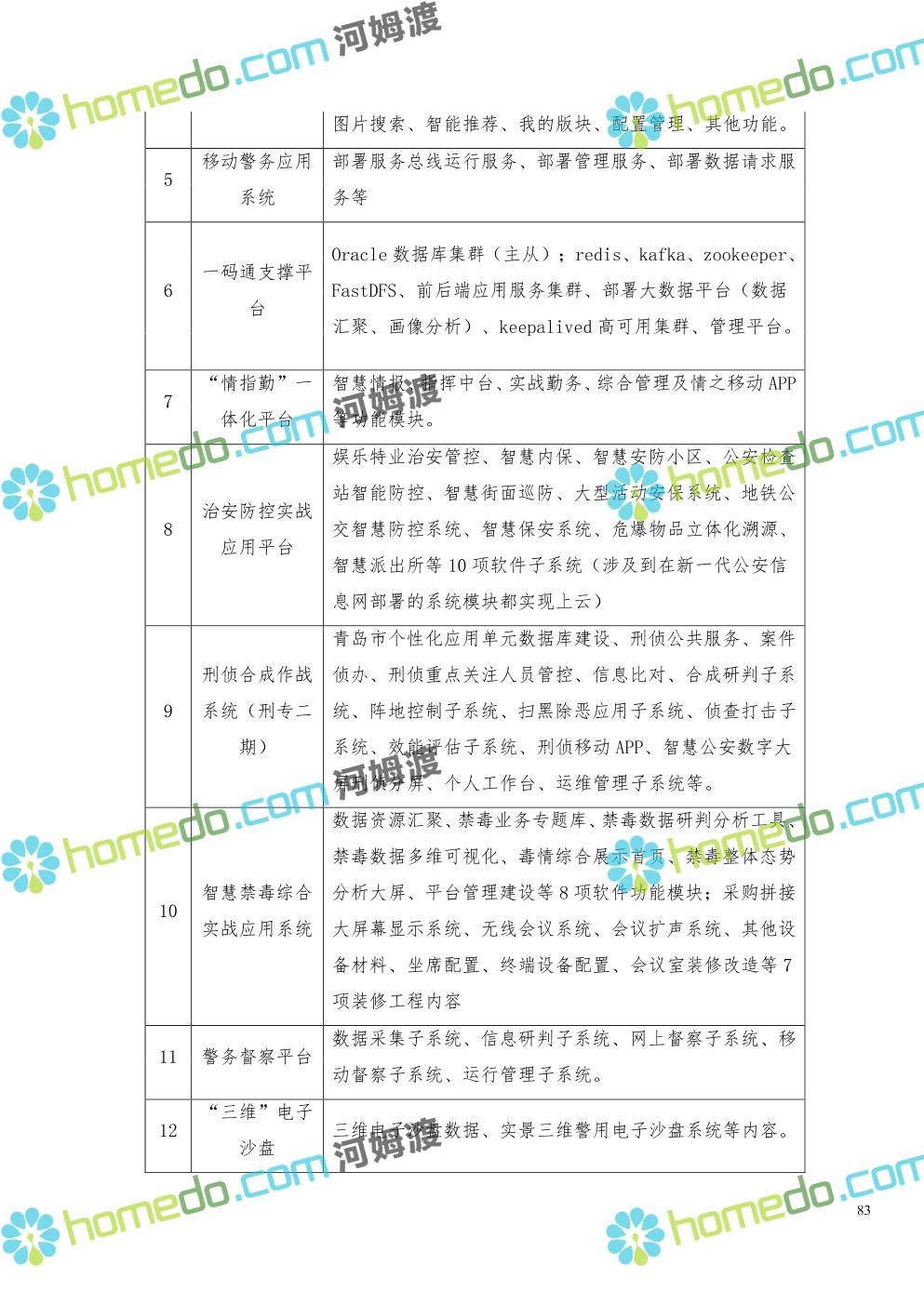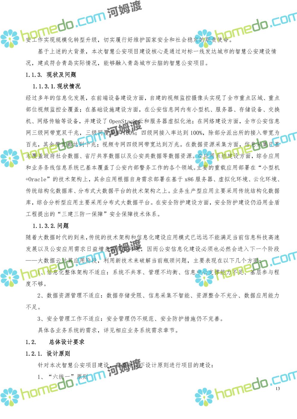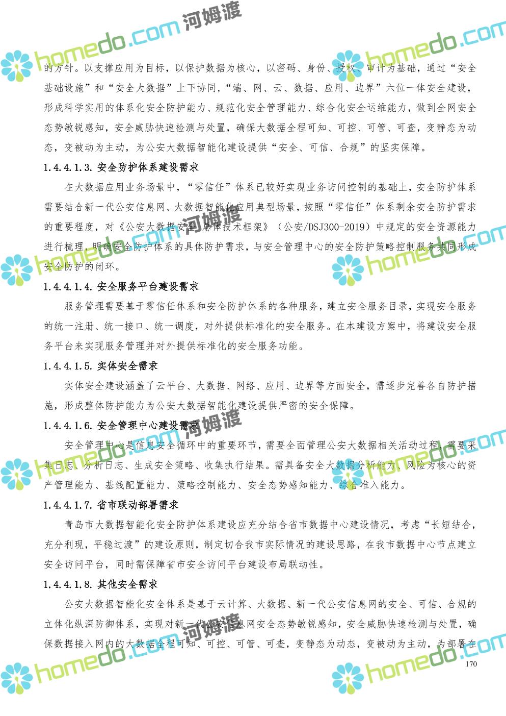 方案简介 项目围绕智慧公安“1+1+5+7”总体框架进行建设,主要建设的内容包含有1 个全息动态感知体系、1个融合大数据中心(新一代公安信息网、云计算平台、大数据平台、大数 据安全体系)、5个综合性支撑应用(数字化大屏系统、青岛警务工作门户、智能搜索系统、移动 警务应用系统、一码通支撑平台)及7大业务领域大数据应用(治安防控实战应用平台、青岛市网 络信息采集系统、刑侦合成作战系统、大数据智能化反诈平台、经侦大数据综合应用平台、智慧禁毒综合实战应用系统、“情指勤”一体化平台、“互联网+政务服务”平台、警务督察平台)。