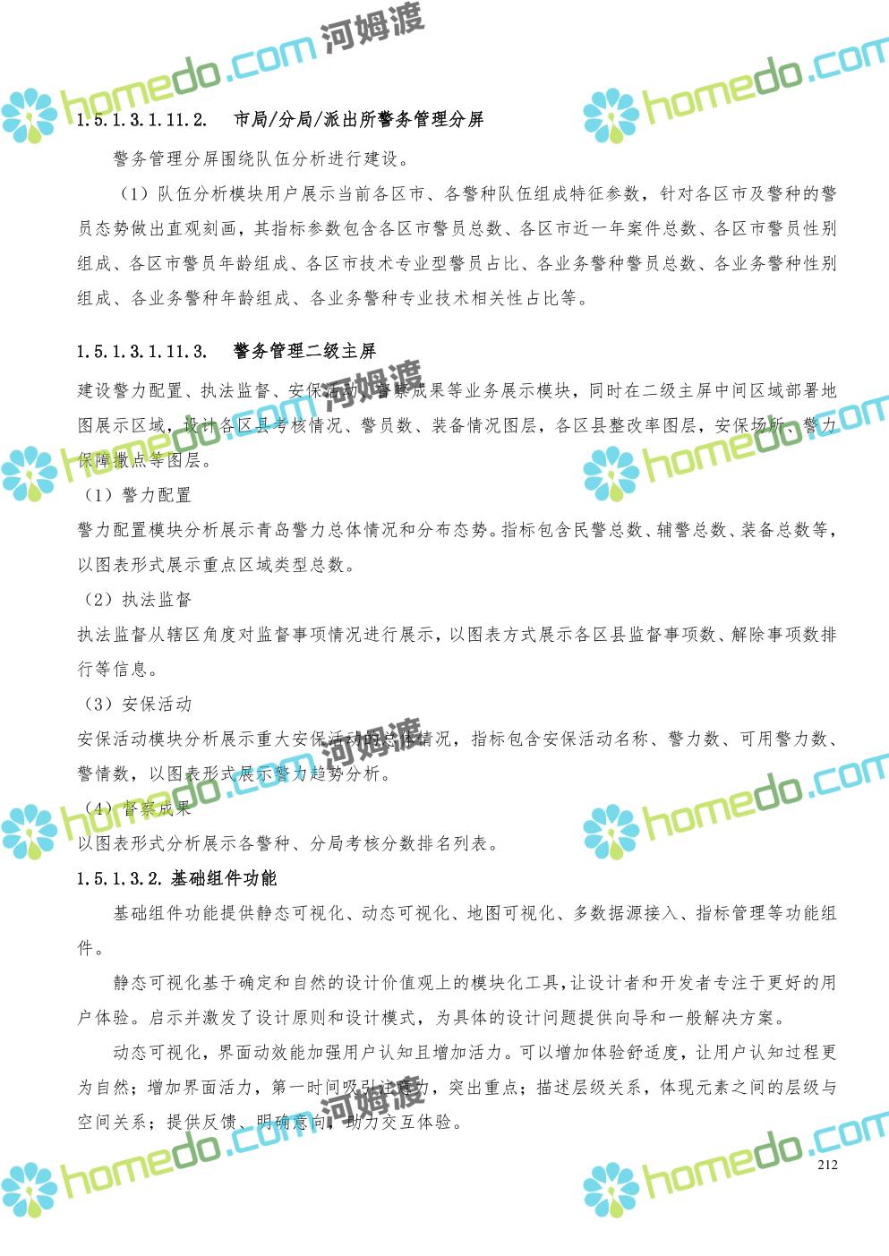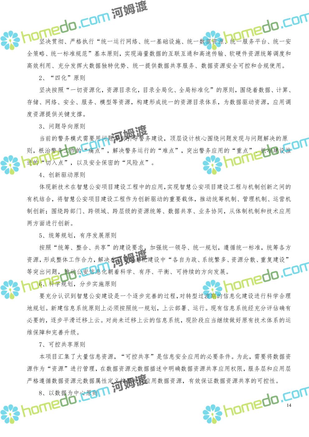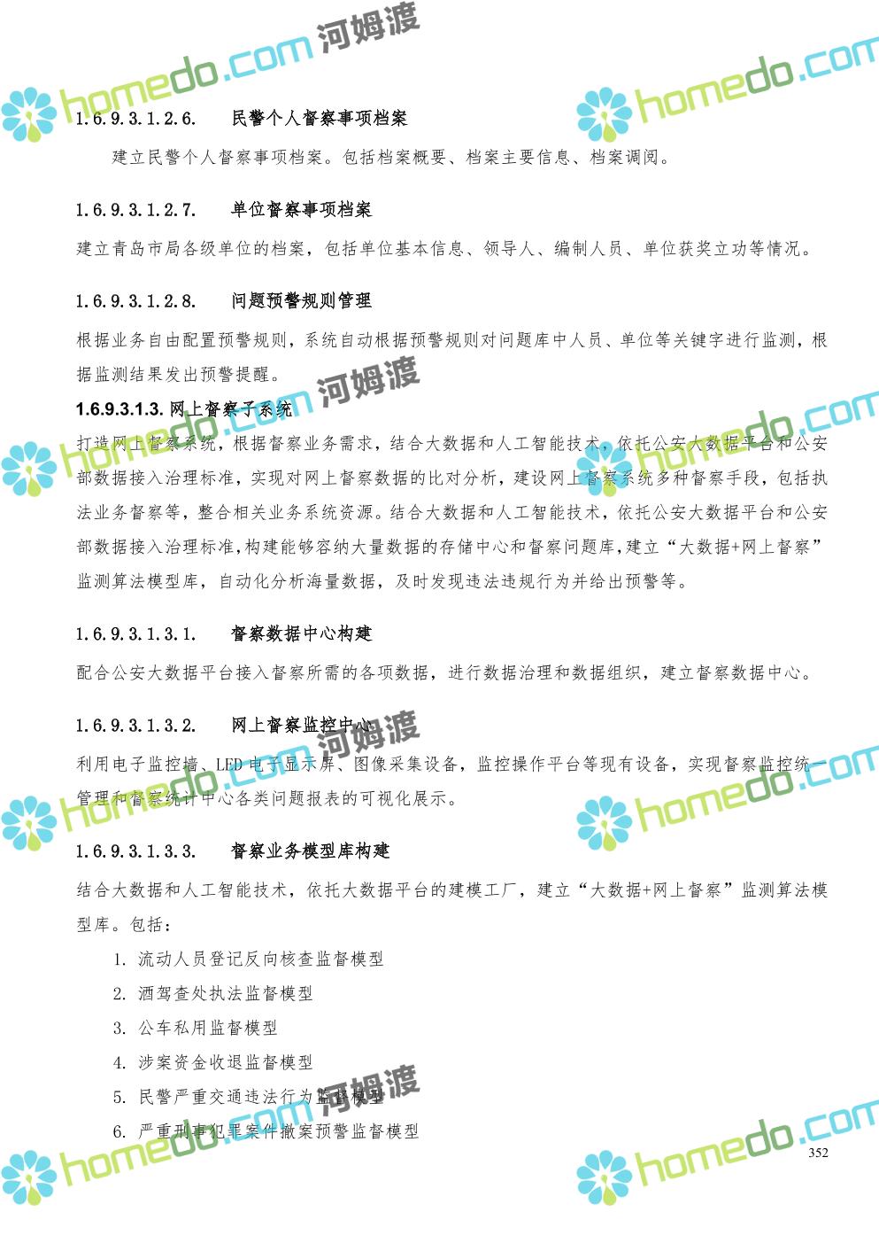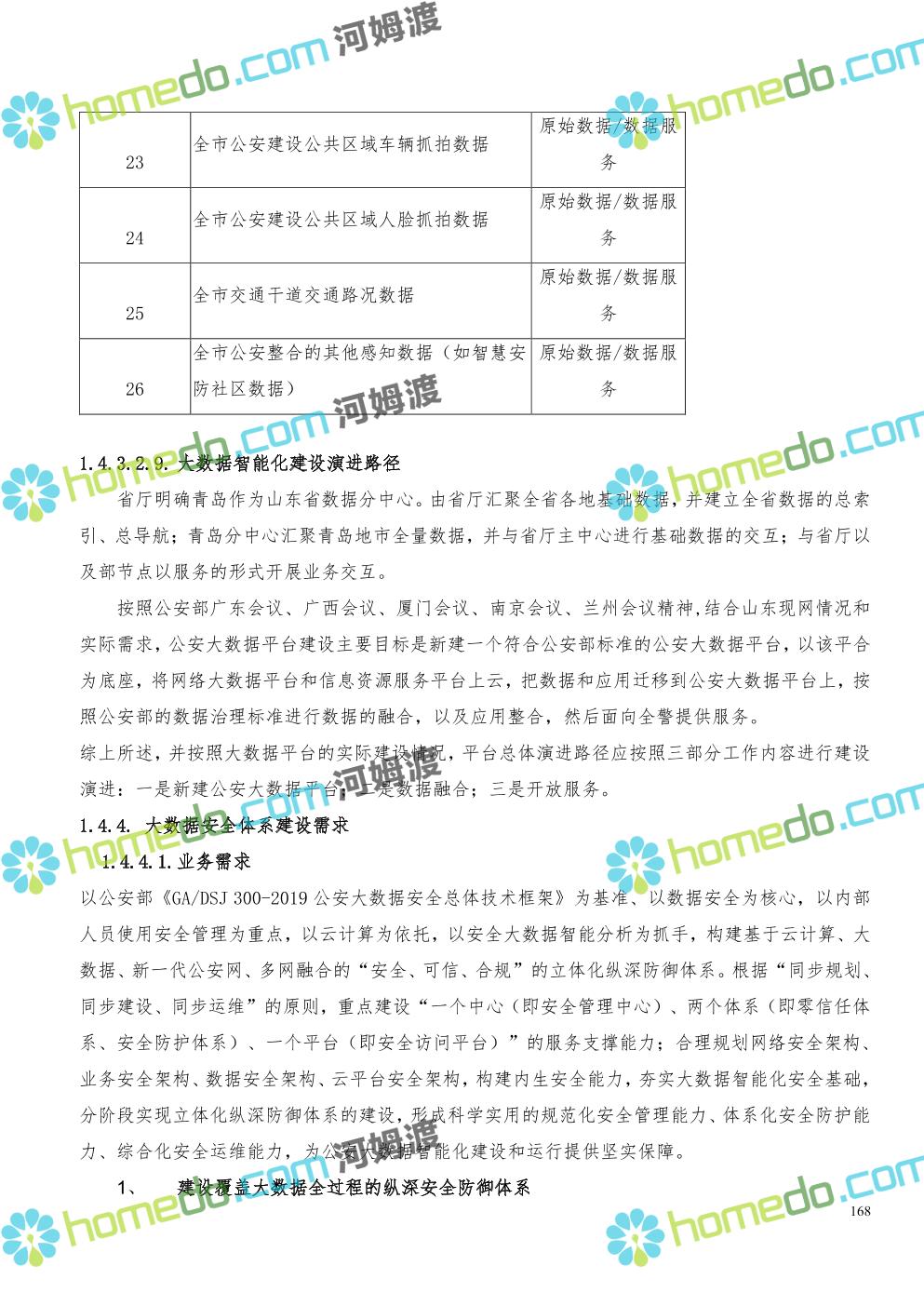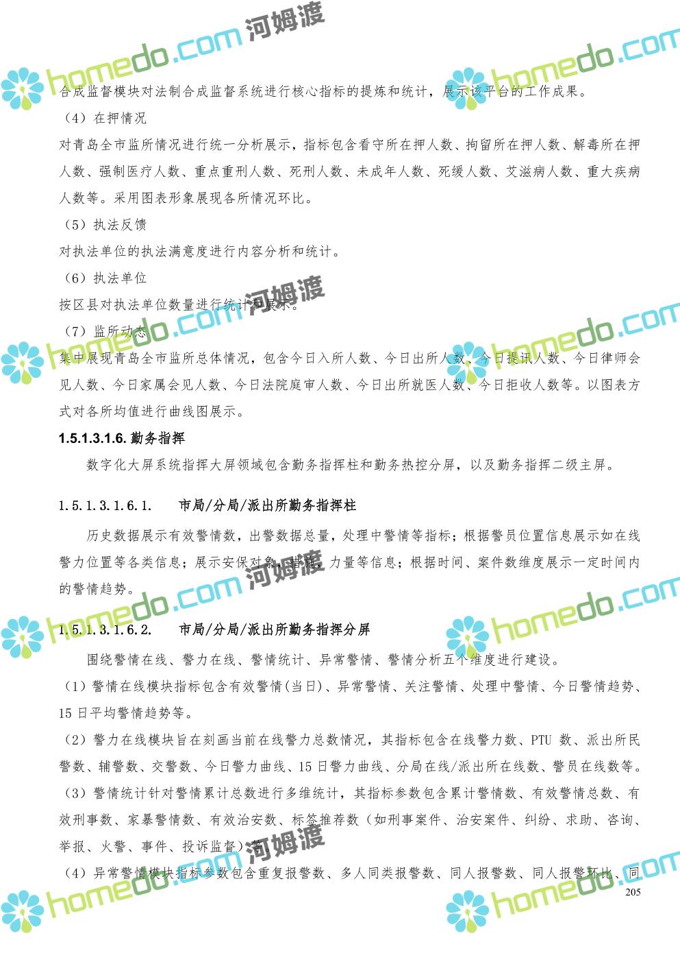 方案简介 项目围绕智慧公安“1+1+5+7”总体框架进行建设,主要建设的内容包含有1 个全息动态感知体系、1个融合大数据中心(新一代公安信息网、云计算平台、大数据平台、大数 据安全体系)、5个综合性支撑应用(数字化大屏系统、青岛警务工作门户、智能搜索系统、移动 警务应用系统、一码通支撑平台)及7大业务领域大数据应用(治安防控实战应用平台、青岛市网 络信息采集系统、刑侦合成作战系统、大数据智能化反诈平台、经侦大数据综合应用平台、智慧禁毒综合实战应用系统、“情指勤”一体化平台、“互联网+政务服务”平台、警务督察平台)。
