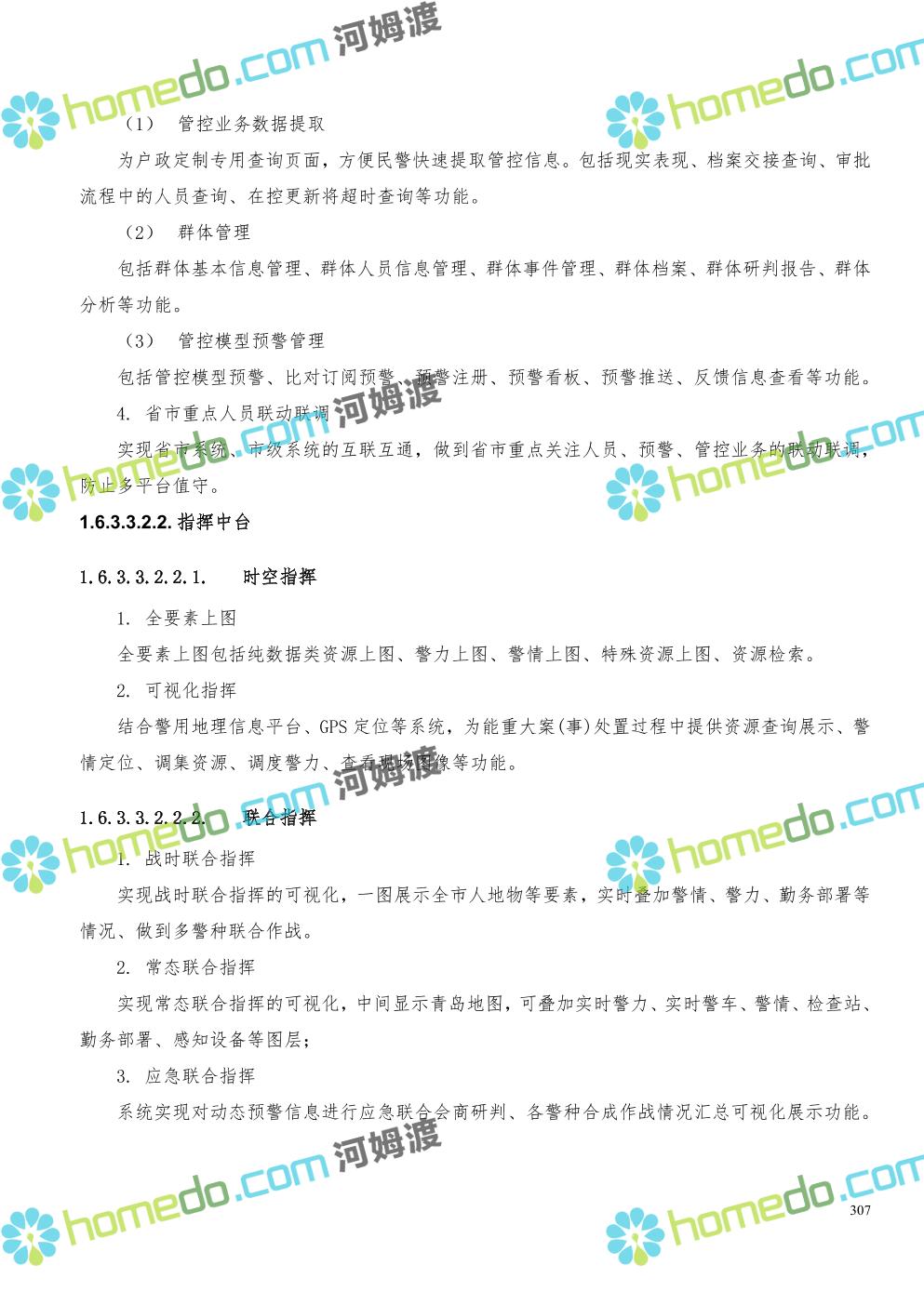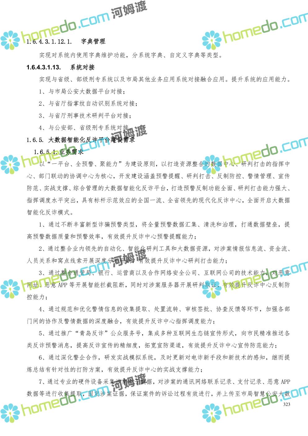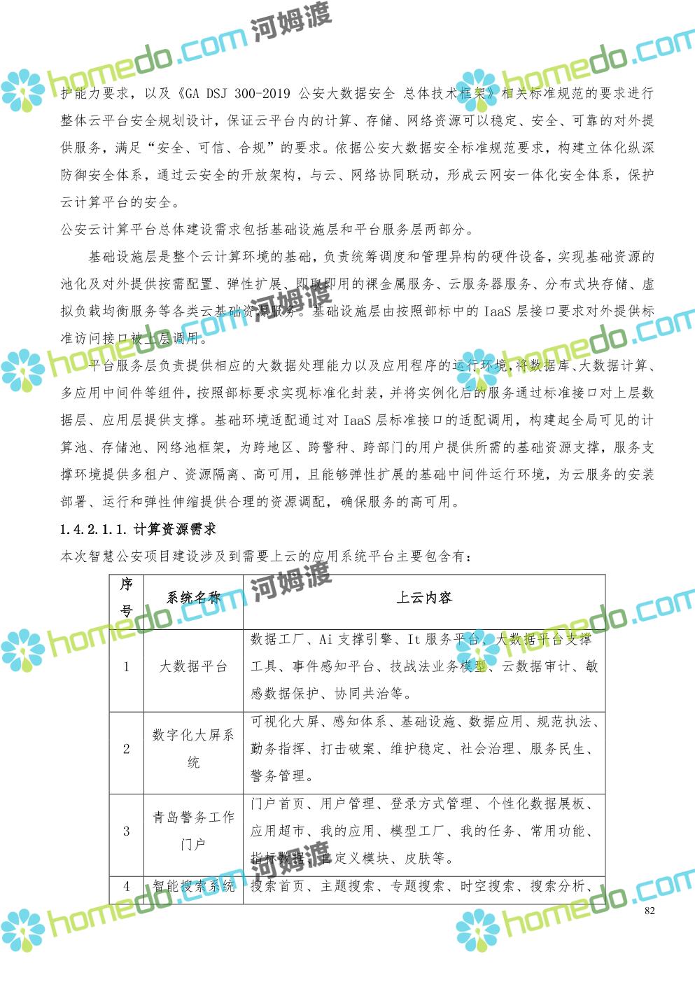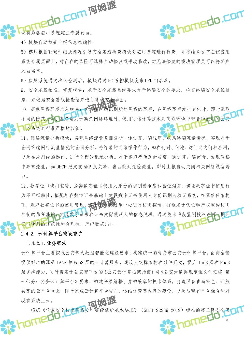 方案简介 项目围绕智慧公安“1+1+5+7”总体框架进行建设,主要建设的内容包含有1 个全息动态感知体系、1个融合大数据中心(新一代公安信息网、云计算平台、大数据平台、大数 据安全体系)、5个综合性支撑应用(数字化大屏系统、青岛警务工作门户、智能搜索系统、移动 警务应用系统、一码通支撑平台)及7大业务领域大数据应用(治安防控实战应用平台、青岛市网 络信息采集系统、刑侦合成作战系统、大数据智能化反诈平台、经侦大数据综合应用平台、智慧禁毒综合实战应用系统、“情指勤”一体化平台、“互联网+政务服务”平台、警务督察平台)。