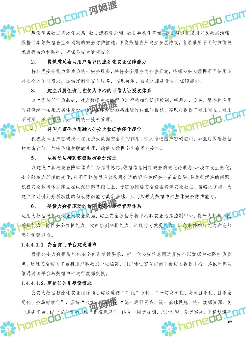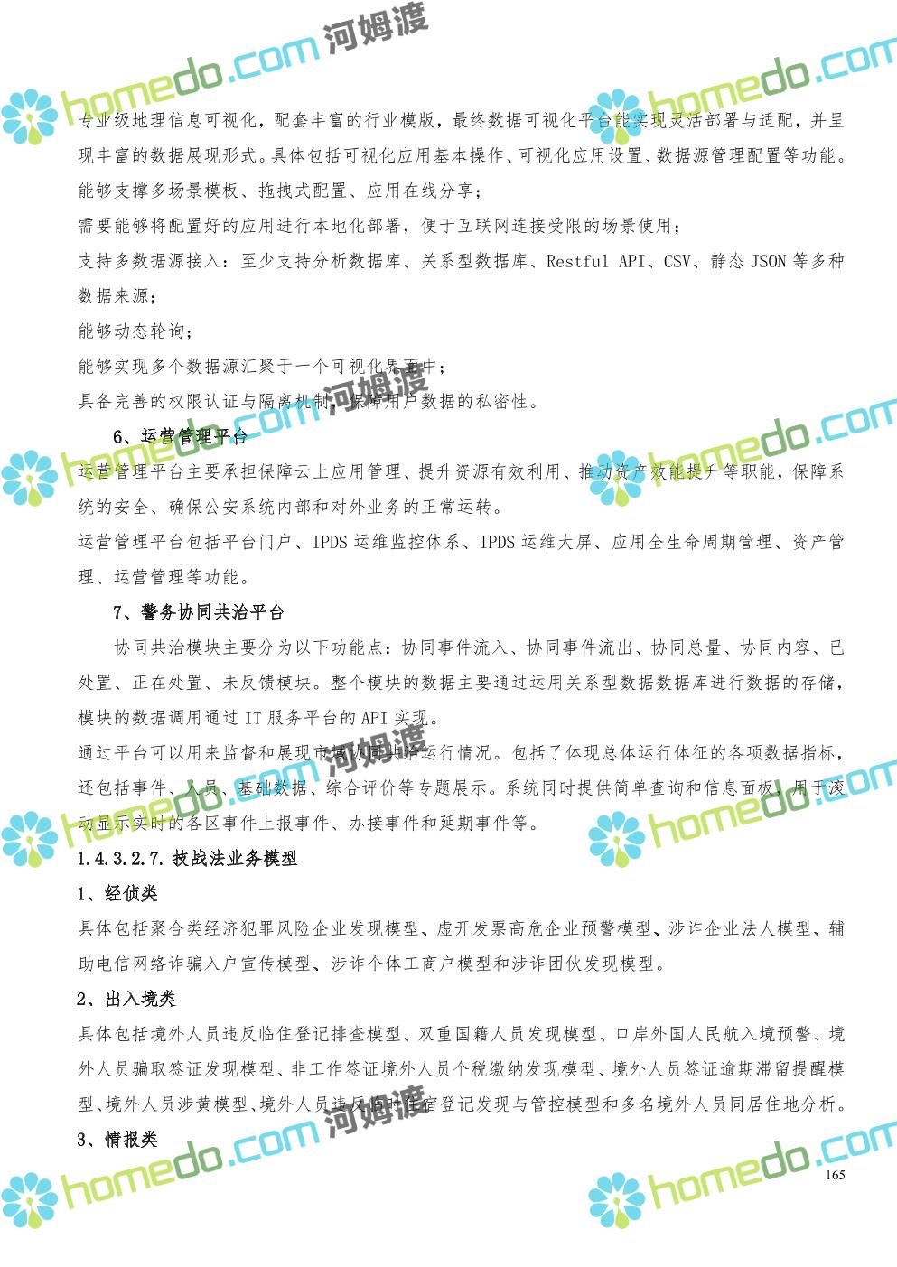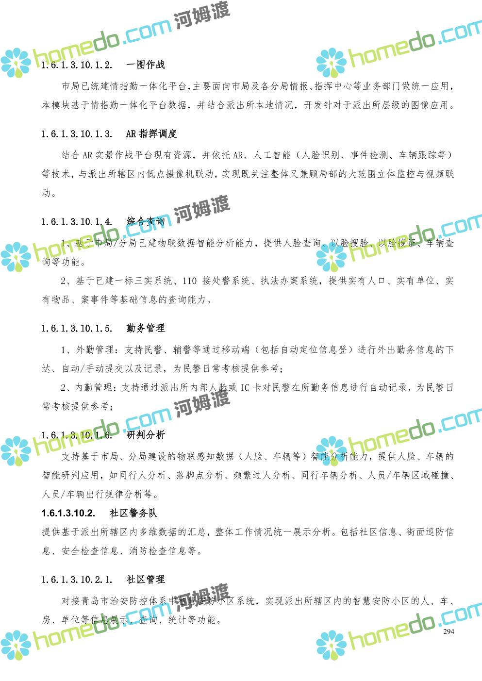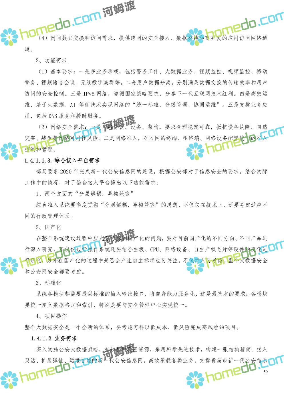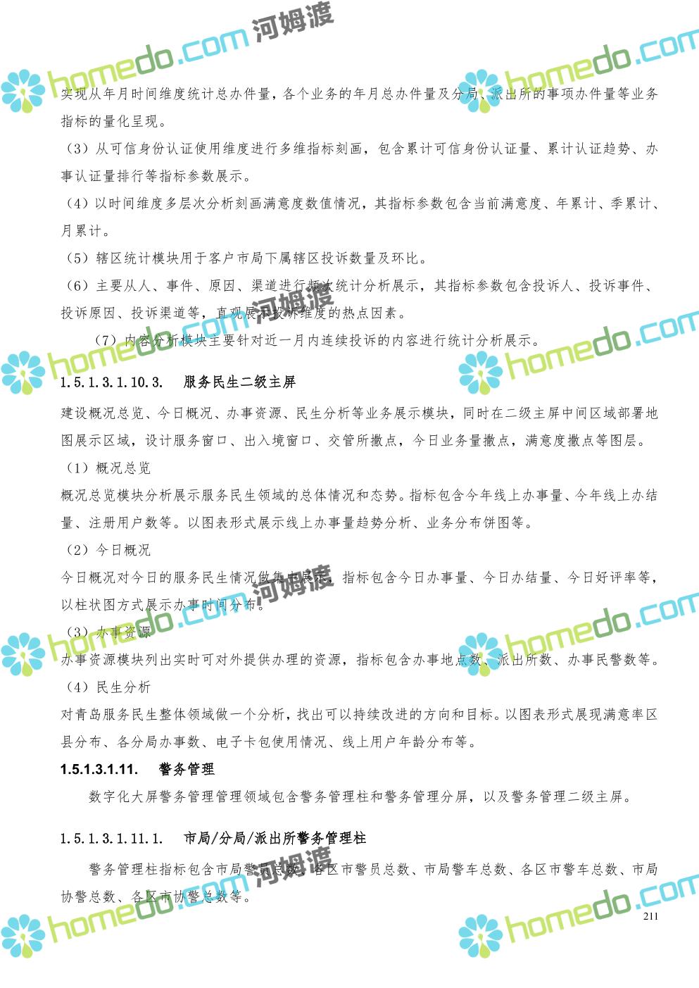 方案简介 项目围绕智慧公安“1+1+5+7”总体框架进行建设,主要建设的内容包含有1 个全息动态感知体系、1个融合大数据中心(新一代公安信息网、云计算平台、大数据平台、大数 据安全体系)、5个综合性支撑应用(数字化大屏系统、青岛警务工作门户、智能搜索系统、移动 警务应用系统、一码通支撑平台)及7大业务领域大数据应用(治安防控实战应用平台、青岛市网 络信息采集系统、刑侦合成作战系统、大数据智能化反诈平台、经侦大数据综合应用平台、智慧禁毒综合实战应用系统、“情指勤”一体化平台、“互联网+政务服务”平台、警务督察平台)。