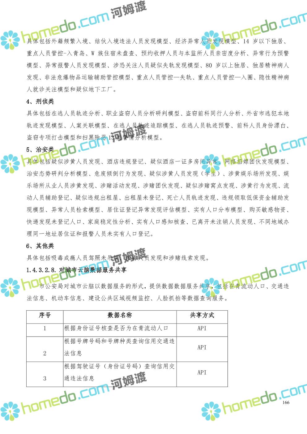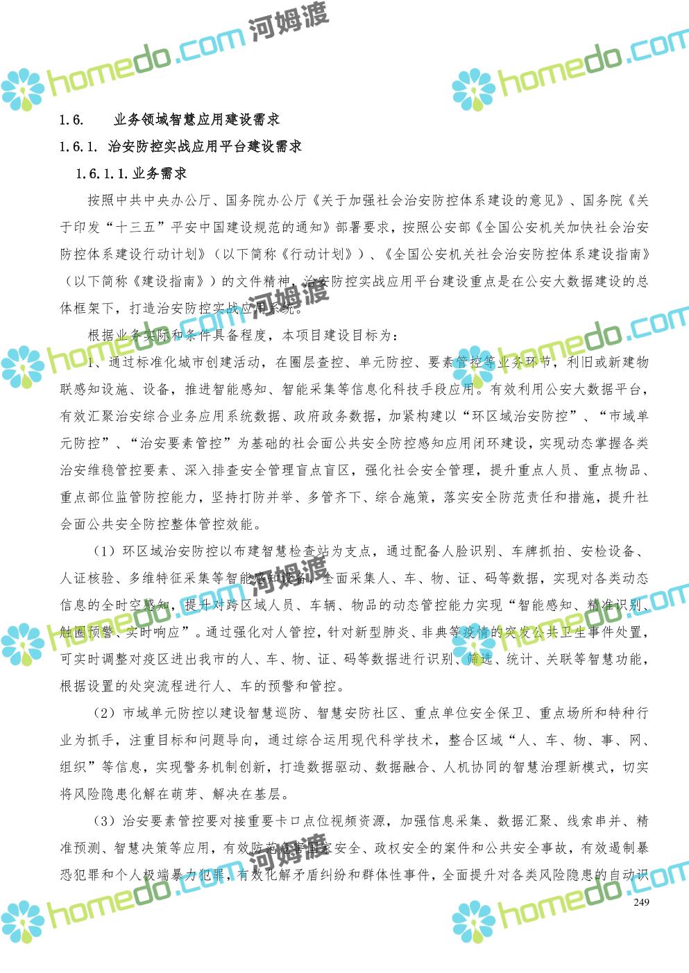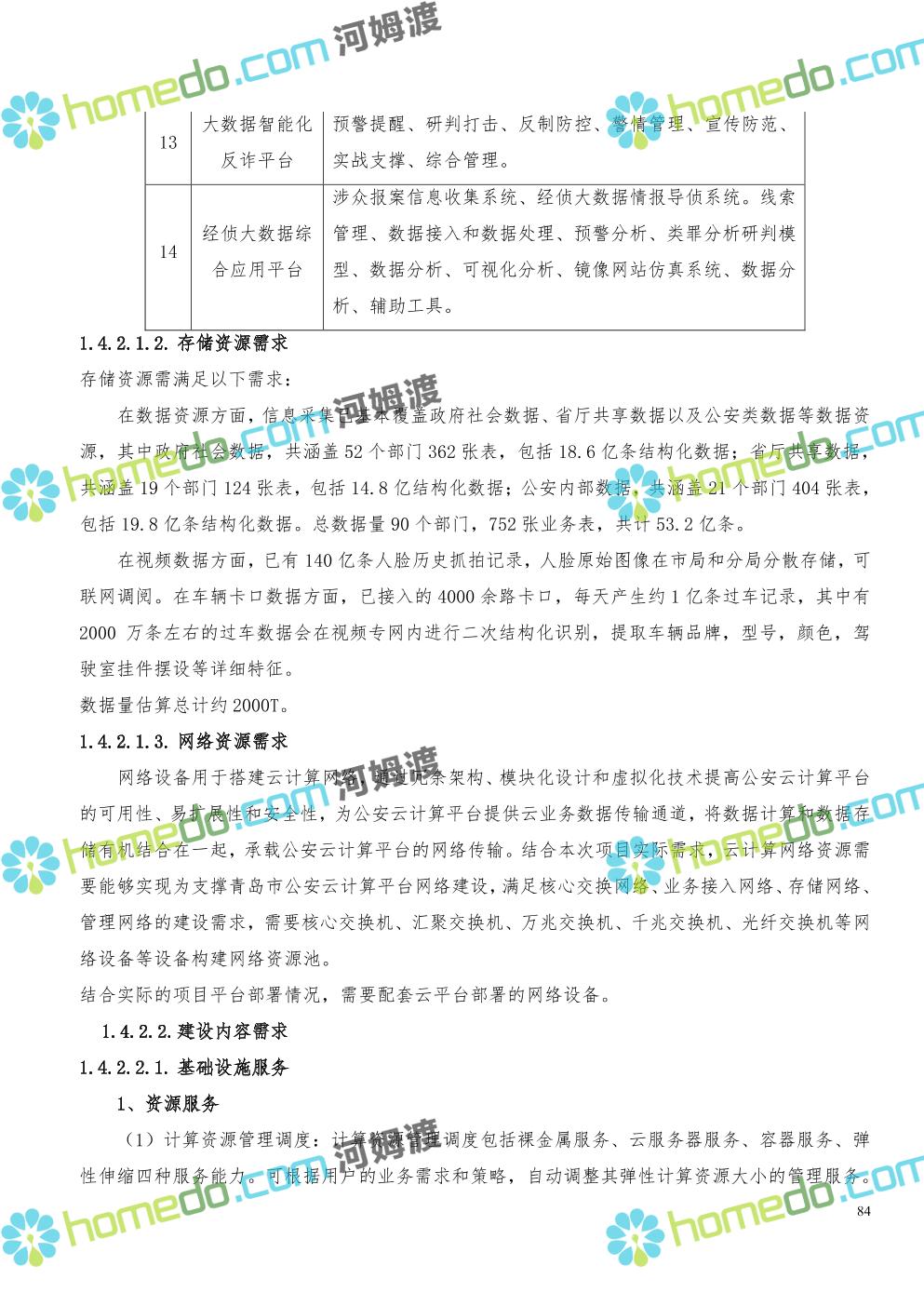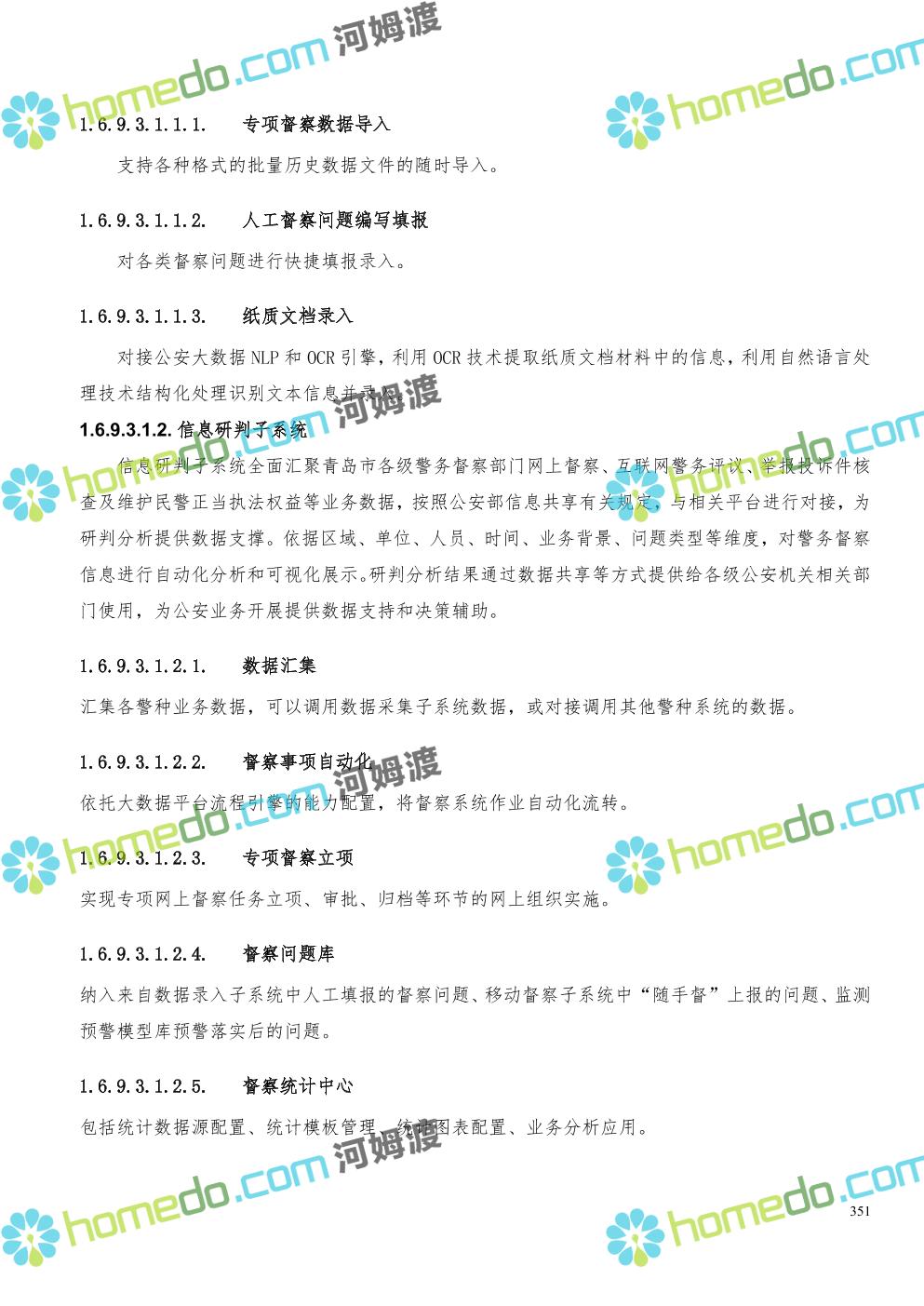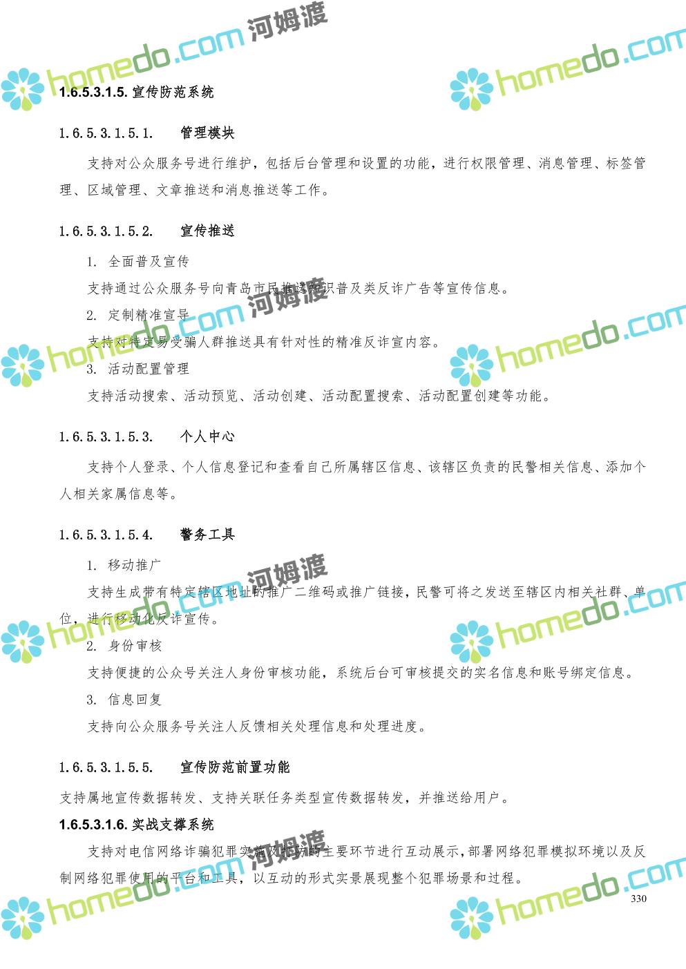 方案简介 项目围绕智慧公安“1+1+5+7”总体框架进行建设,主要建设的内容包含有1 个全息动态感知体系、1个融合大数据中心(新一代公安信息网、云计算平台、大数据平台、大数 据安全体系)、5个综合性支撑应用(数字化大屏系统、青岛警务工作门户、智能搜索系统、移动 警务应用系统、一码通支撑平台)及7大业务领域大数据应用(治安防控实战应用平台、青岛市网 络信息采集系统、刑侦合成作战系统、大数据智能化反诈平台、经侦大数据综合应用平台、智慧禁毒综合实战应用系统、“情指勤”一体化平台、“互联网+政务服务”平台、警务督察平台)。
