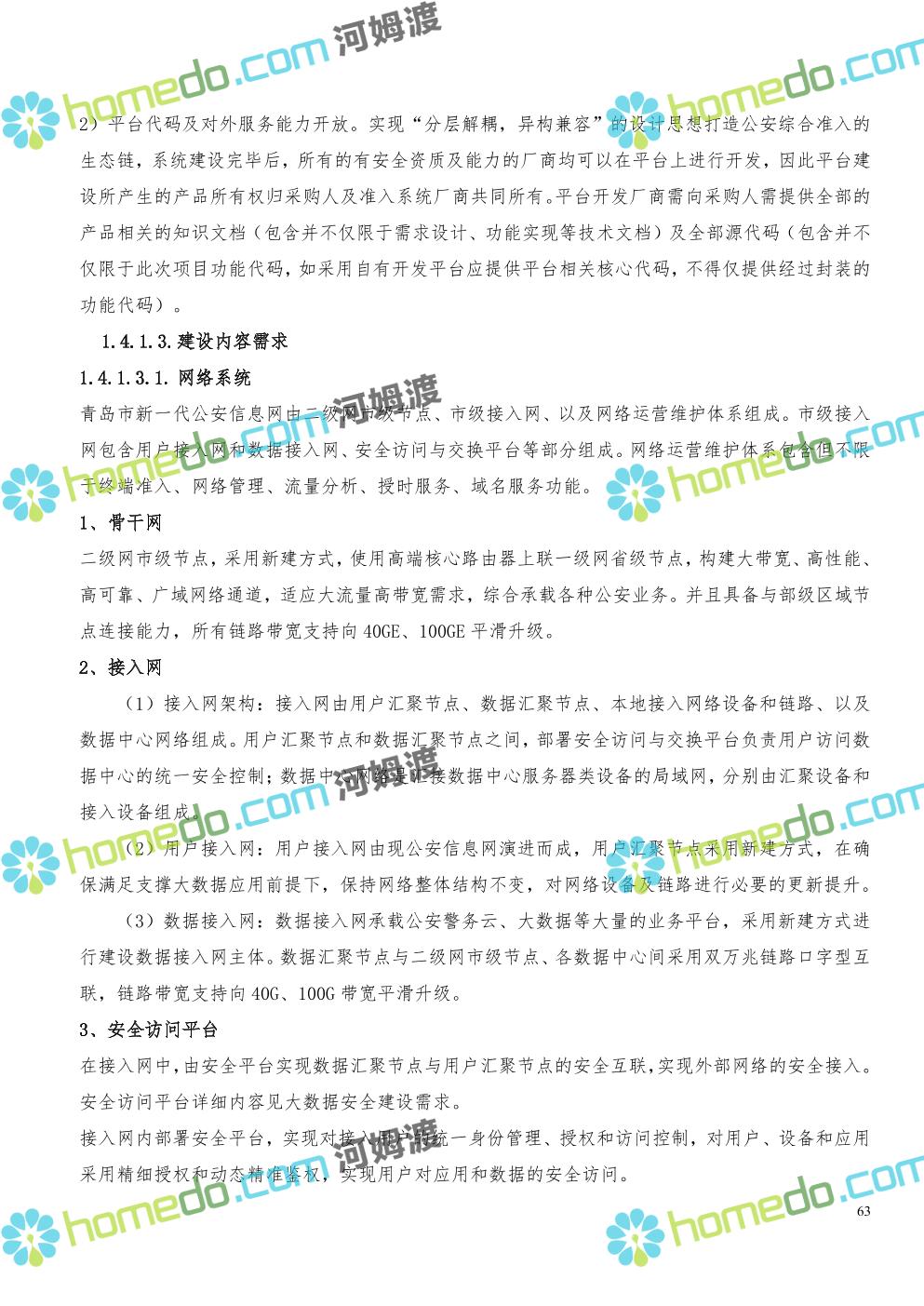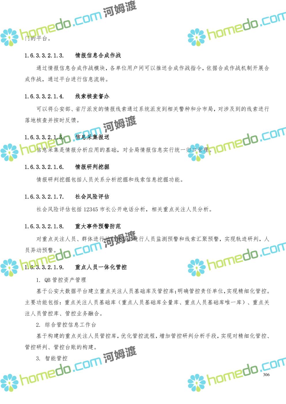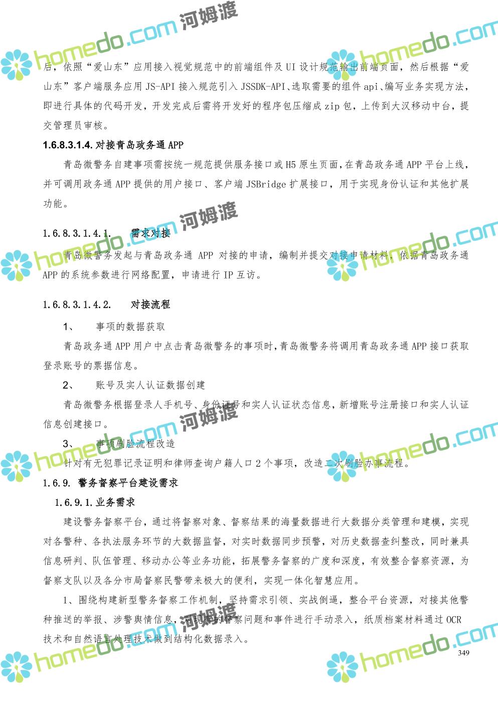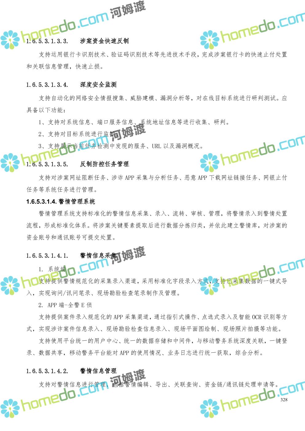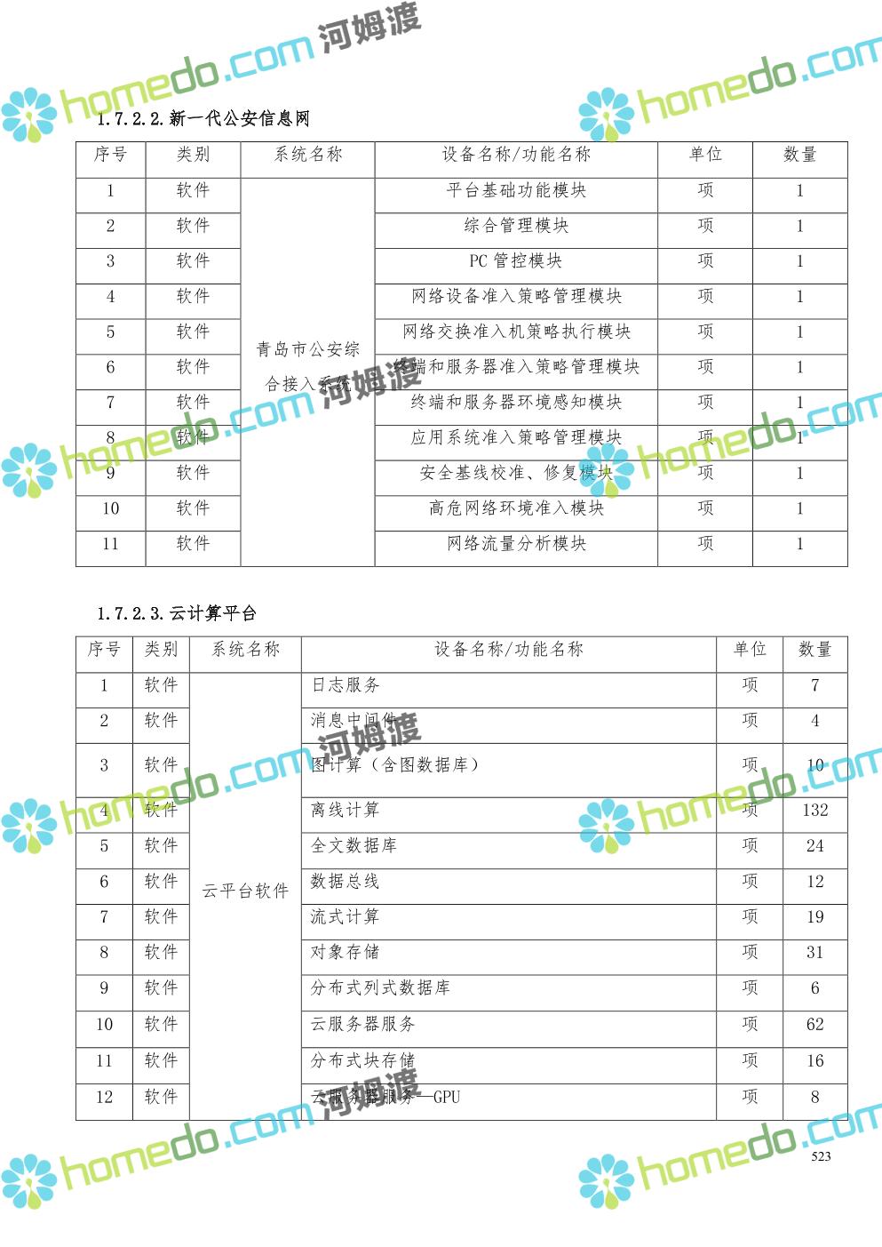 方案简介 项目围绕智慧公安“1+1+5+7”总体框架进行建设,主要建设的内容包含有1 个全息动态感知体系、1个融合大数据中心(新一代公安信息网、云计算平台、大数据平台、大数 据安全体系)、5个综合性支撑应用(数字化大屏系统、青岛警务工作门户、智能搜索系统、移动 警务应用系统、一码通支撑平台)及7大业务领域大数据应用(治安防控实战应用平台、青岛市网 络信息采集系统、刑侦合成作战系统、大数据智能化反诈平台、经侦大数据综合应用平台、智慧禁毒综合实战应用系统、“情指勤”一体化平台、“互联网+政务服务”平台、警务督察平台)。