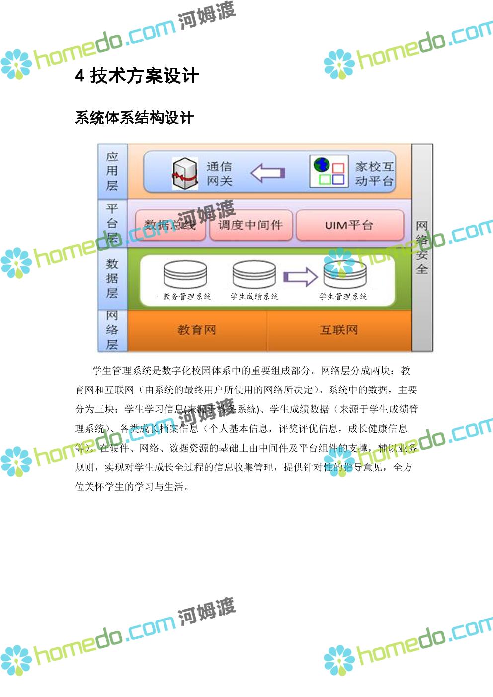 方案简介 学生管理系统是数字化校园体系中的重要组成部分。网络层分成两块:教育网和互联网(由系统的最终用户所使用的网络所决定)。系统中的数据,主要分为三块:学生学习信息(来源于教务系统)、学生成绩数据(来源于学生成绩管理系统)、各类成长档案信息(个人基本信息,评奖评优信息,成长健康信息等)。在硬件、网络、数据资源的基础上由中间件及平台组件的支撑,辅以业务规则,实现对学生成长全过程的信息收集管理,提供针对性的指导意见,全方位关怀学生的学习与生活。