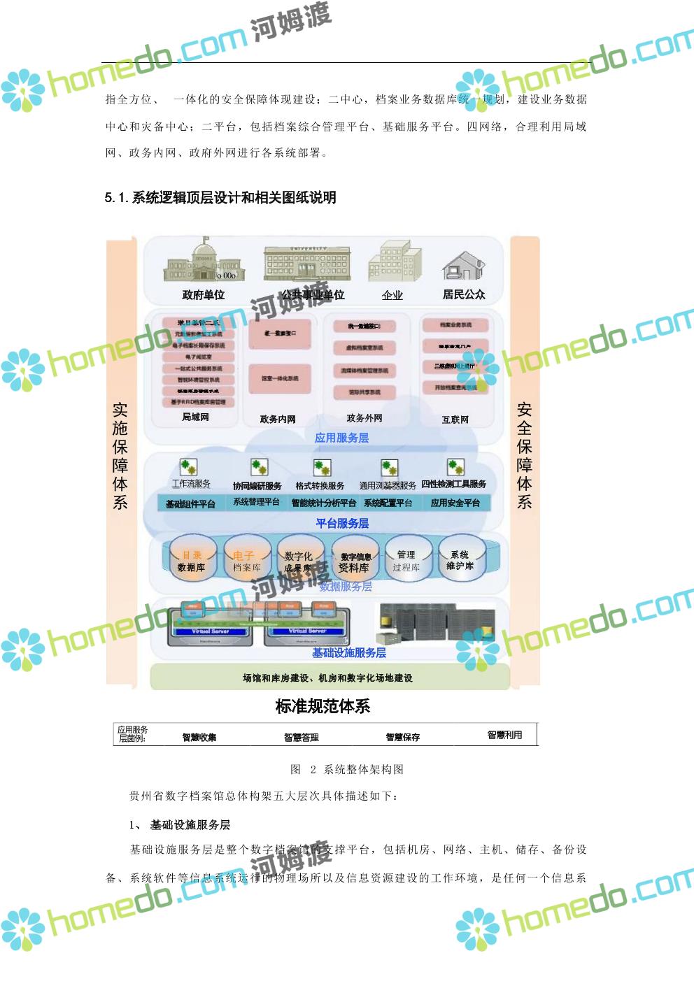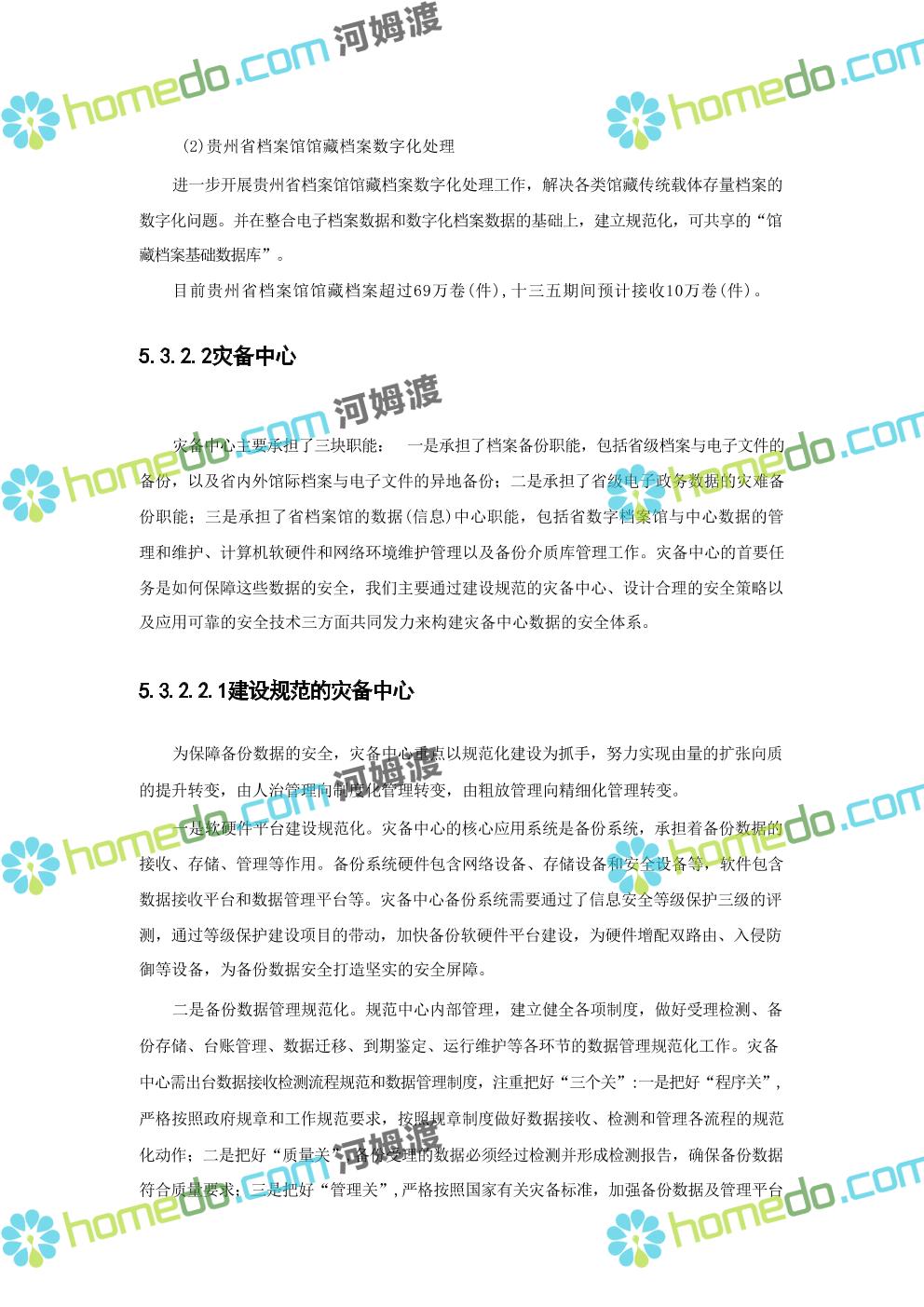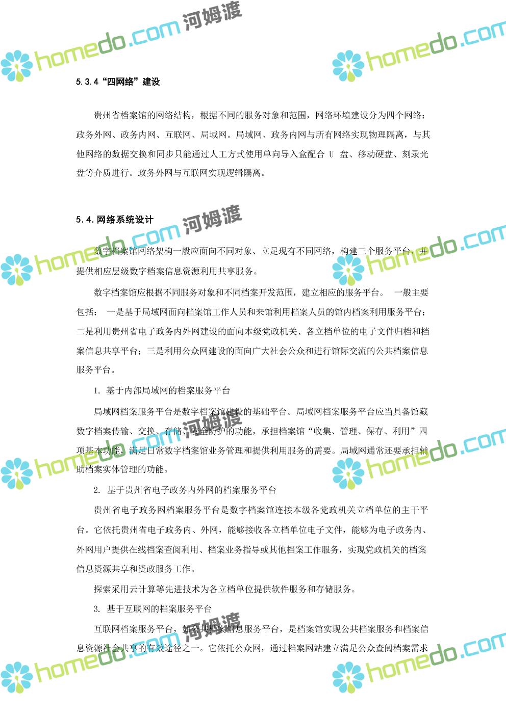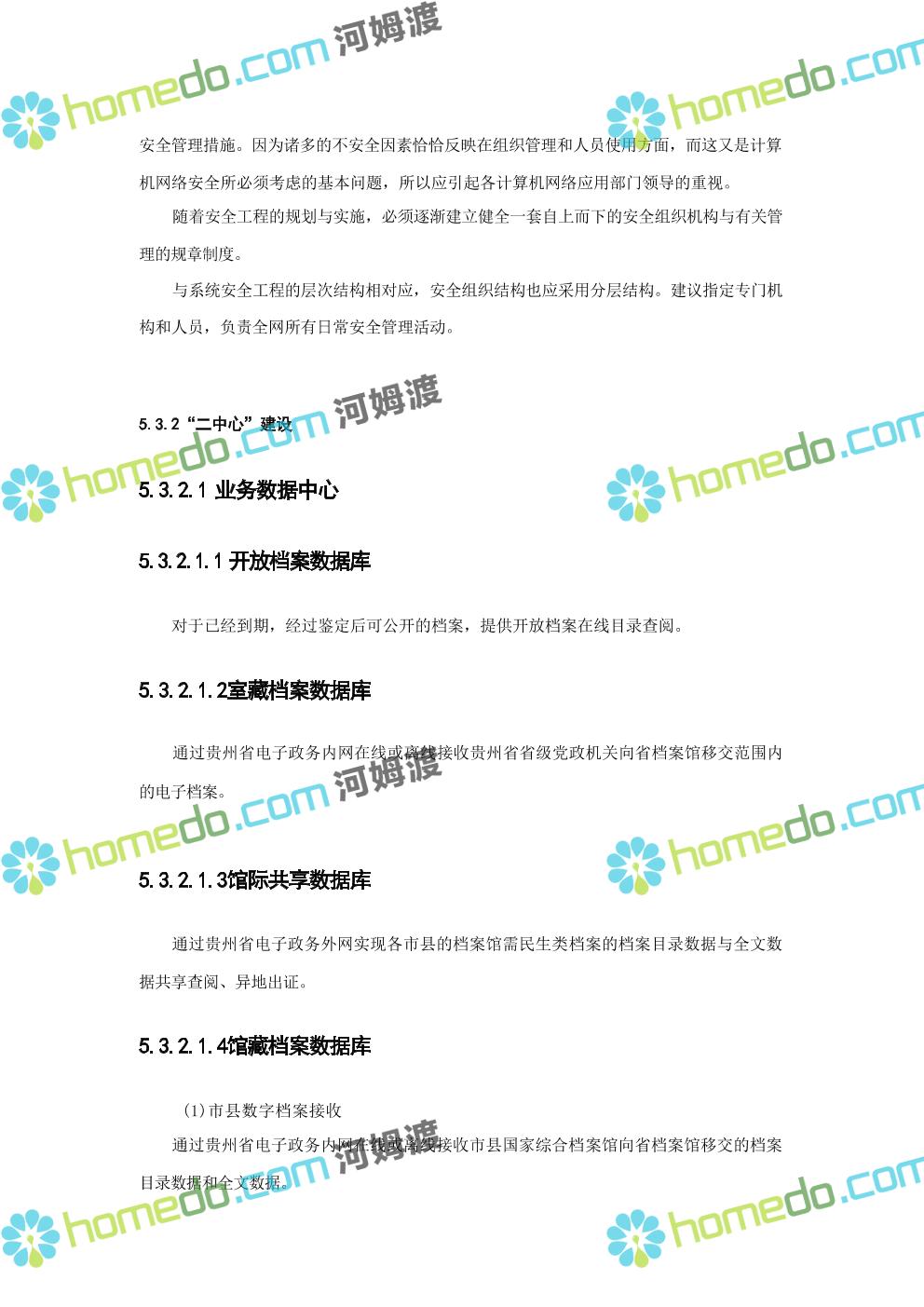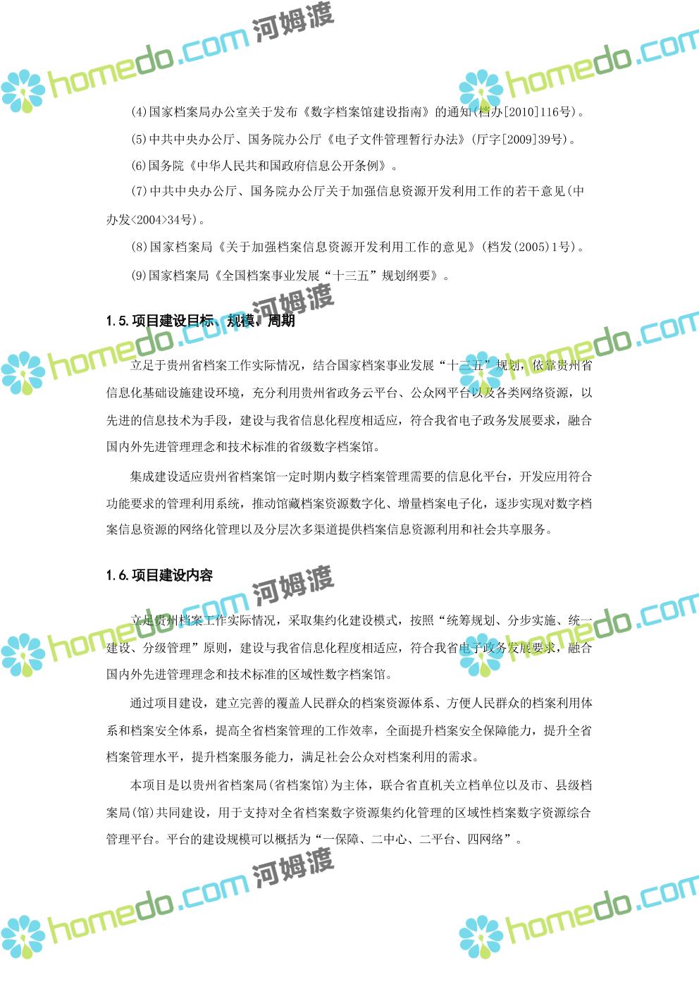 方案简介 数字档案馆的建设内容包括“一保障、二中心、二平台、四网络”建设、标准规 范建设以及数字档案馆人力资源体系建设、部分历史档案数字化加工建设等。其中一保障是 指全方位、 一体化的安全保障体现建设;二中心,档案业务数据库统一规划,建设业务数据 中心和灾备中心;二平台,包括档案综合管理平台、基础服务平台。四网络,合理利用局域 网、政务内网、政府外网进行各系统部署。