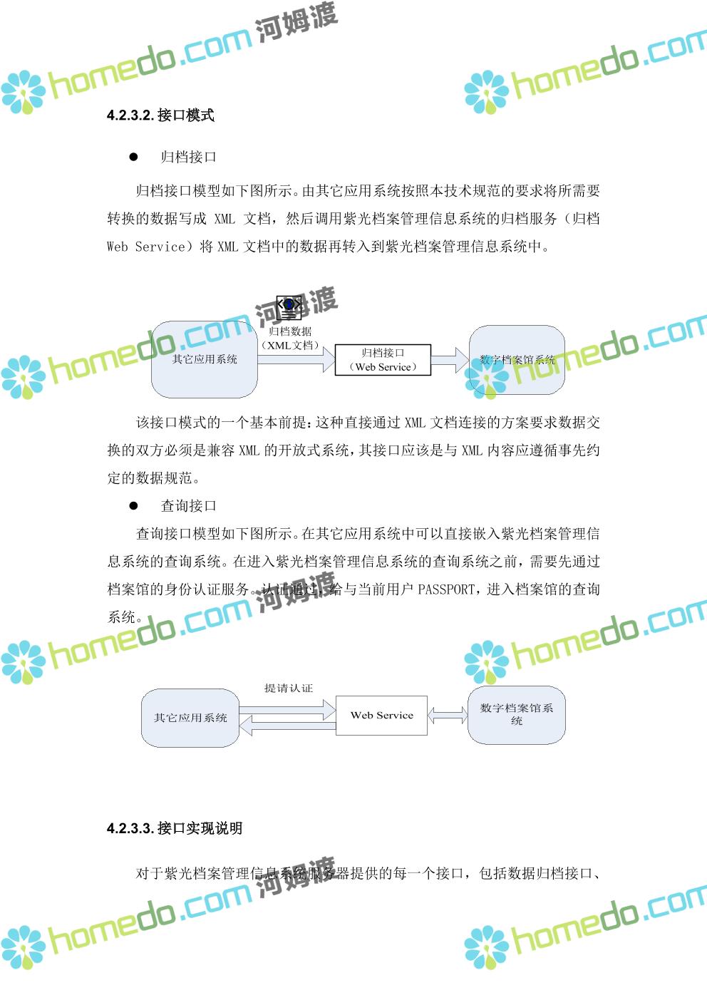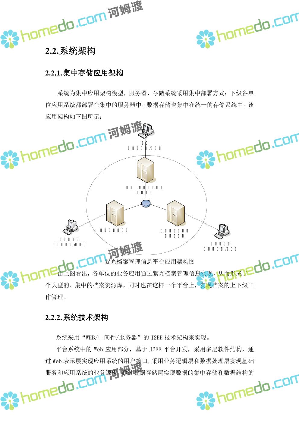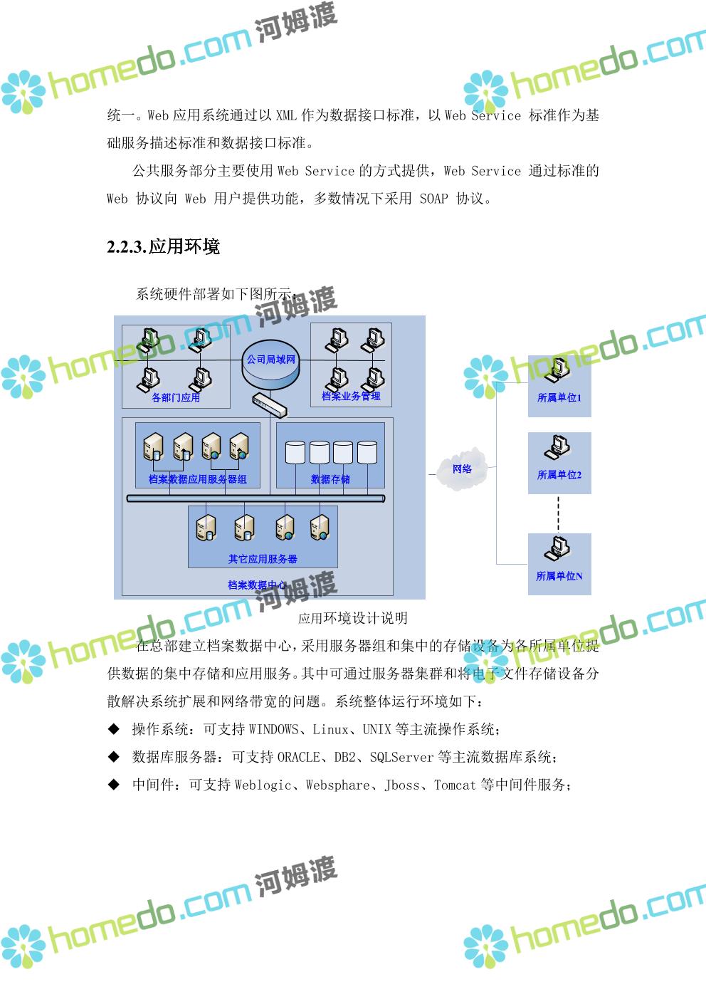 方案简介 系统采用“WEB/中间件/服务器”的J2EE技术架构来实现。 平台系统中的Web应用部分,基于J2EE平台开发,采用多层软件结构,通过Web表示层实现应用系统的用户接口,采用业务逻辑层和数据处理层实现基础服务和应用系统的业务逻辑,通过数据存储层实现数据的集中存储和数据结构的统一。Web应用系统通过以XML作为数据接口标准,以Web Service 标准作为基础服务描述标准和数据接口标准。 公共服务部分主要使用Web Service的方式提供,Web Service 通过标准的 Web 协议向 Web 用户提供功能,多数情况下采用 SOAP 协议。